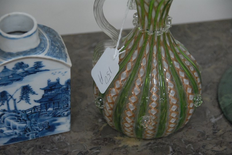Lot 150A: Four piece lot to include early bottle, art glass small pitcher, Canton tea caddy, and brass mortar and pestal.