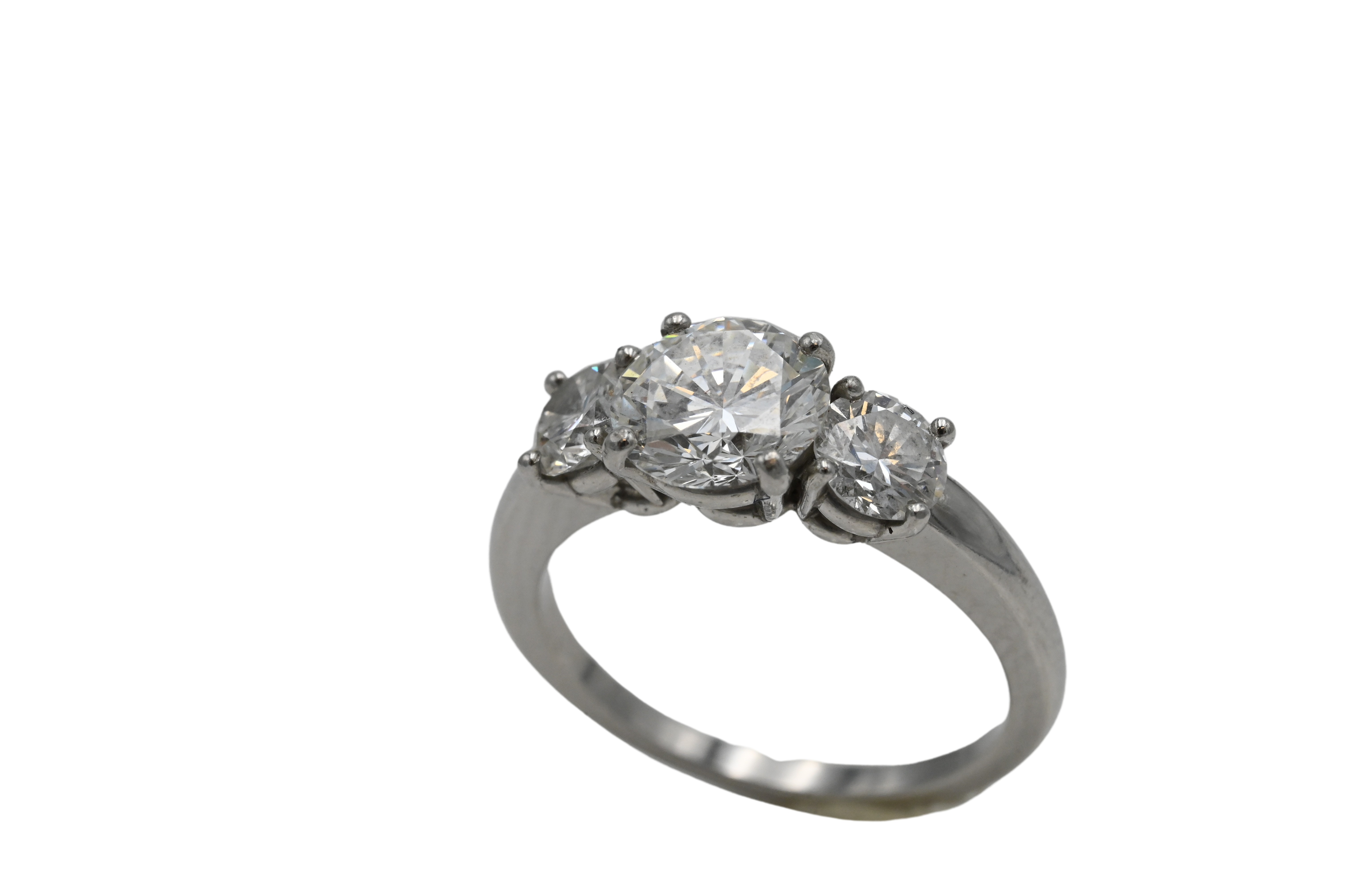 center diamond 1.42 carats, flanked by 4.6, 4.7 millimeters diamonds