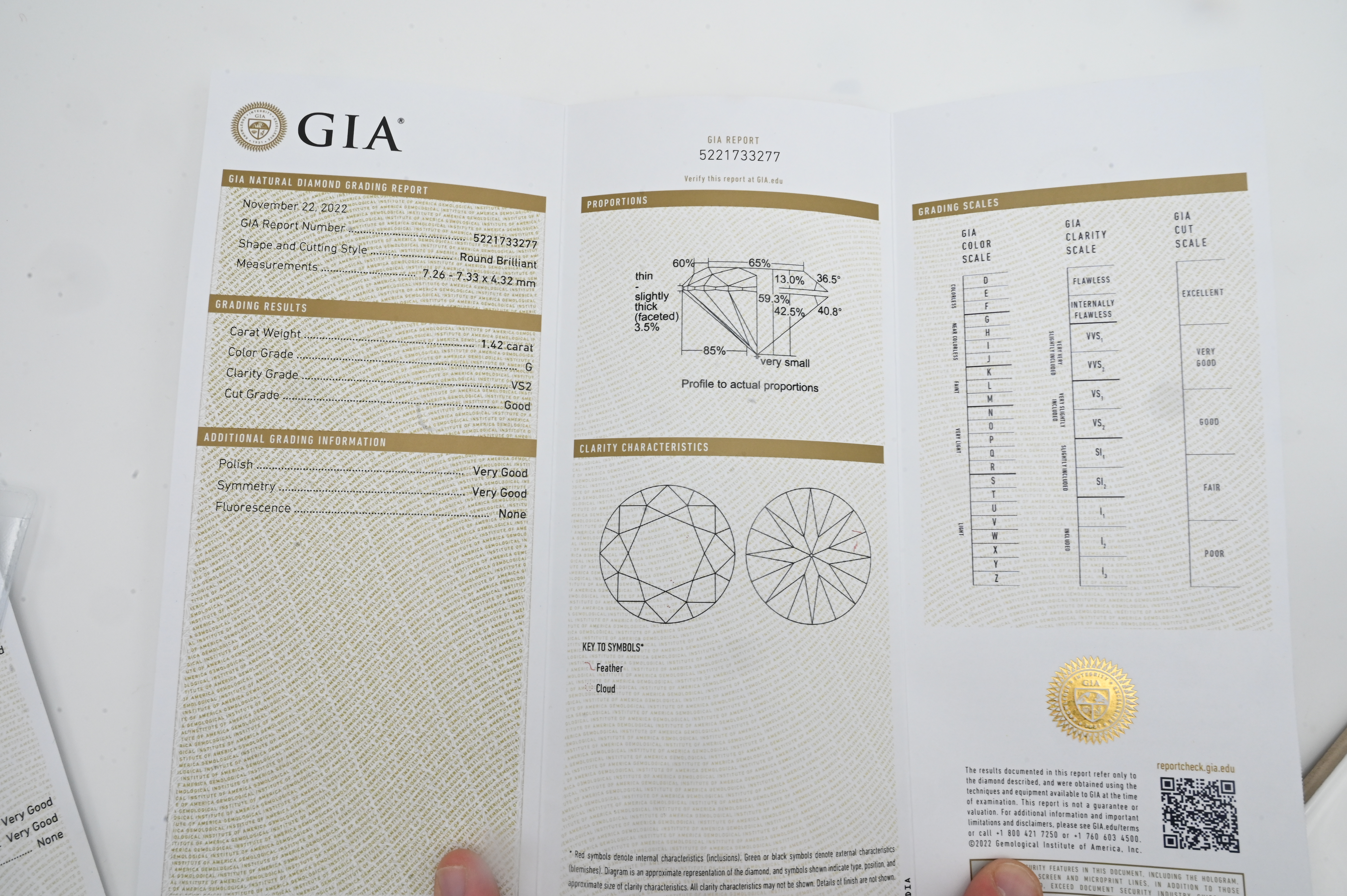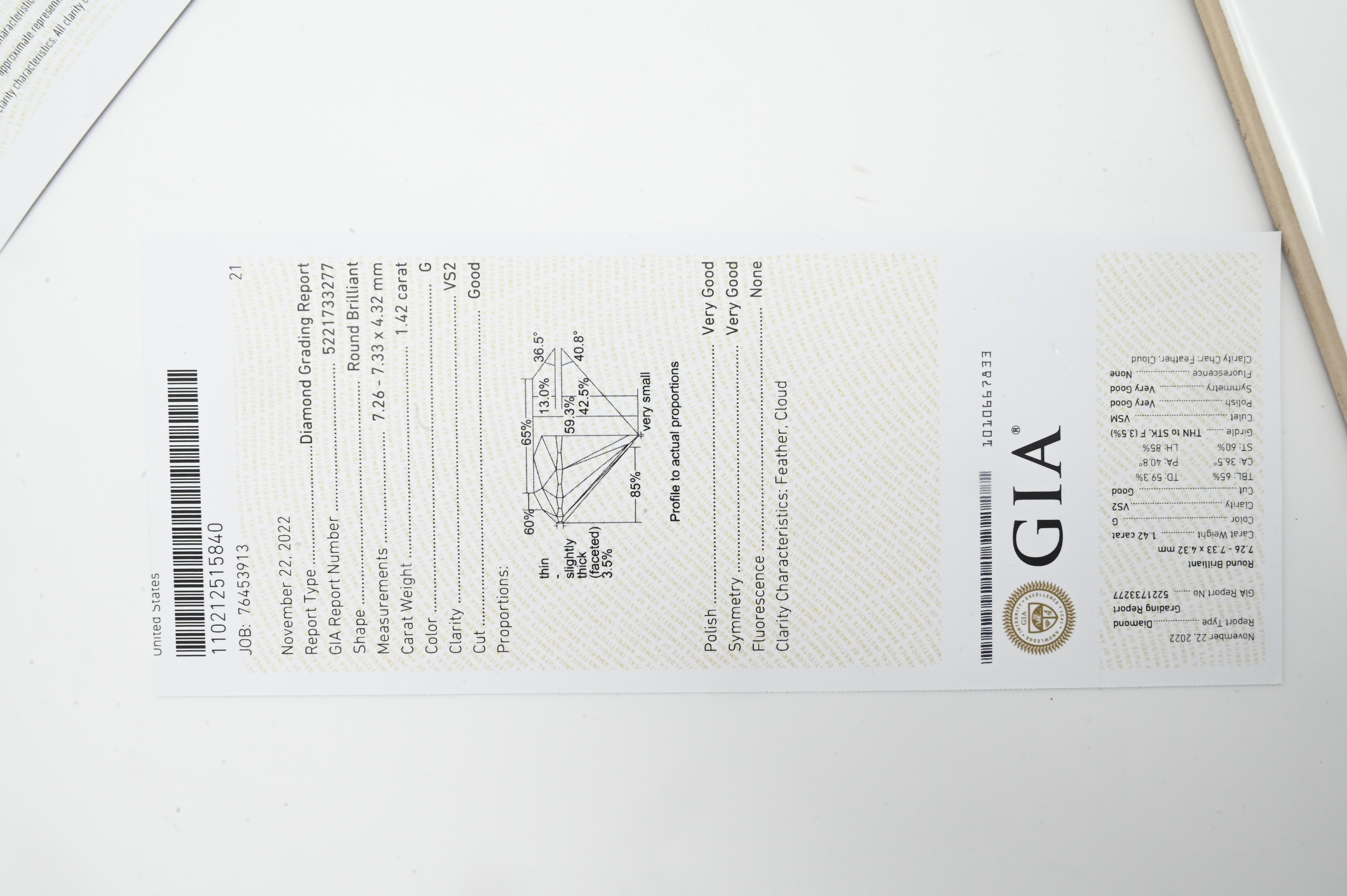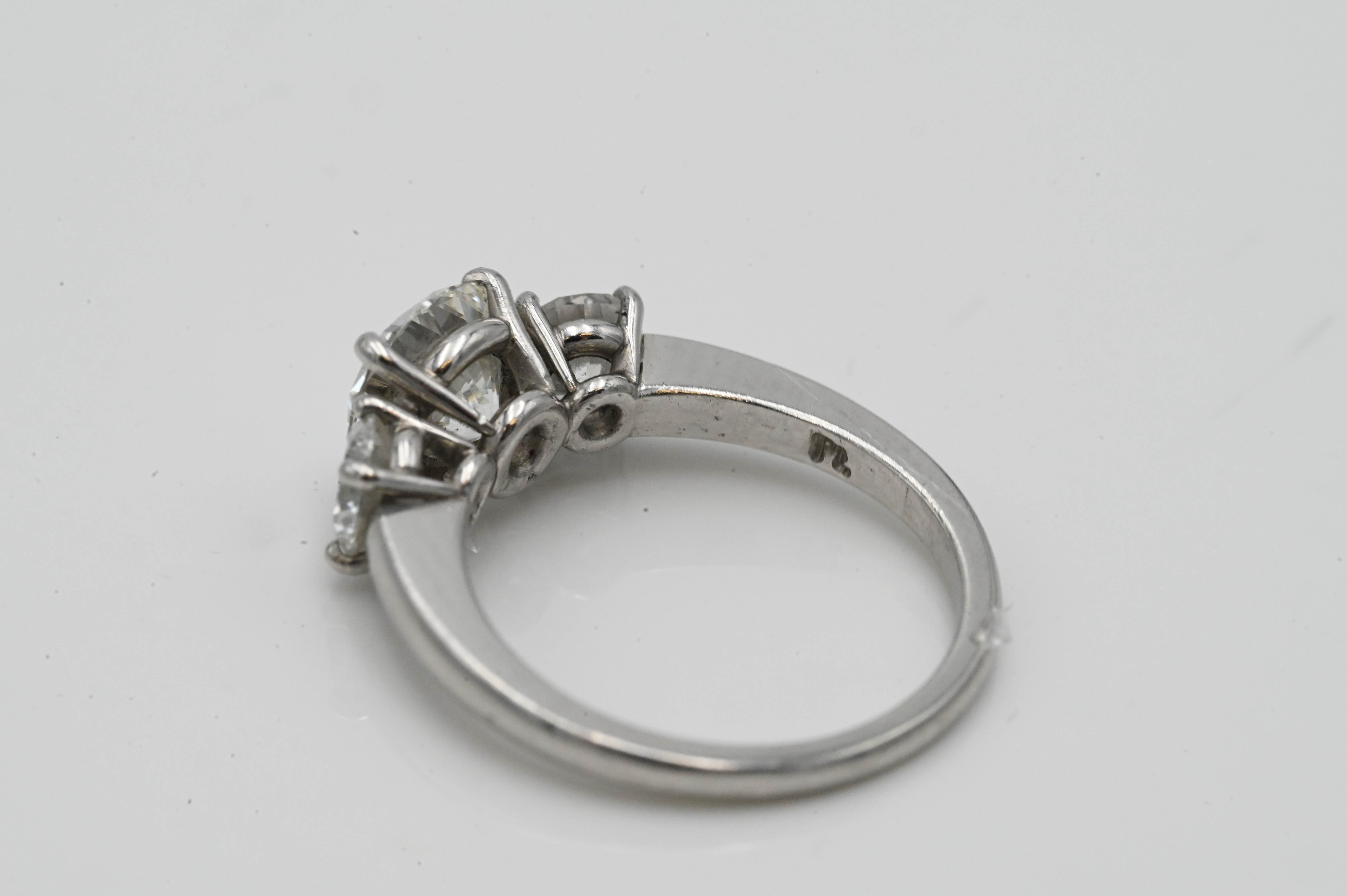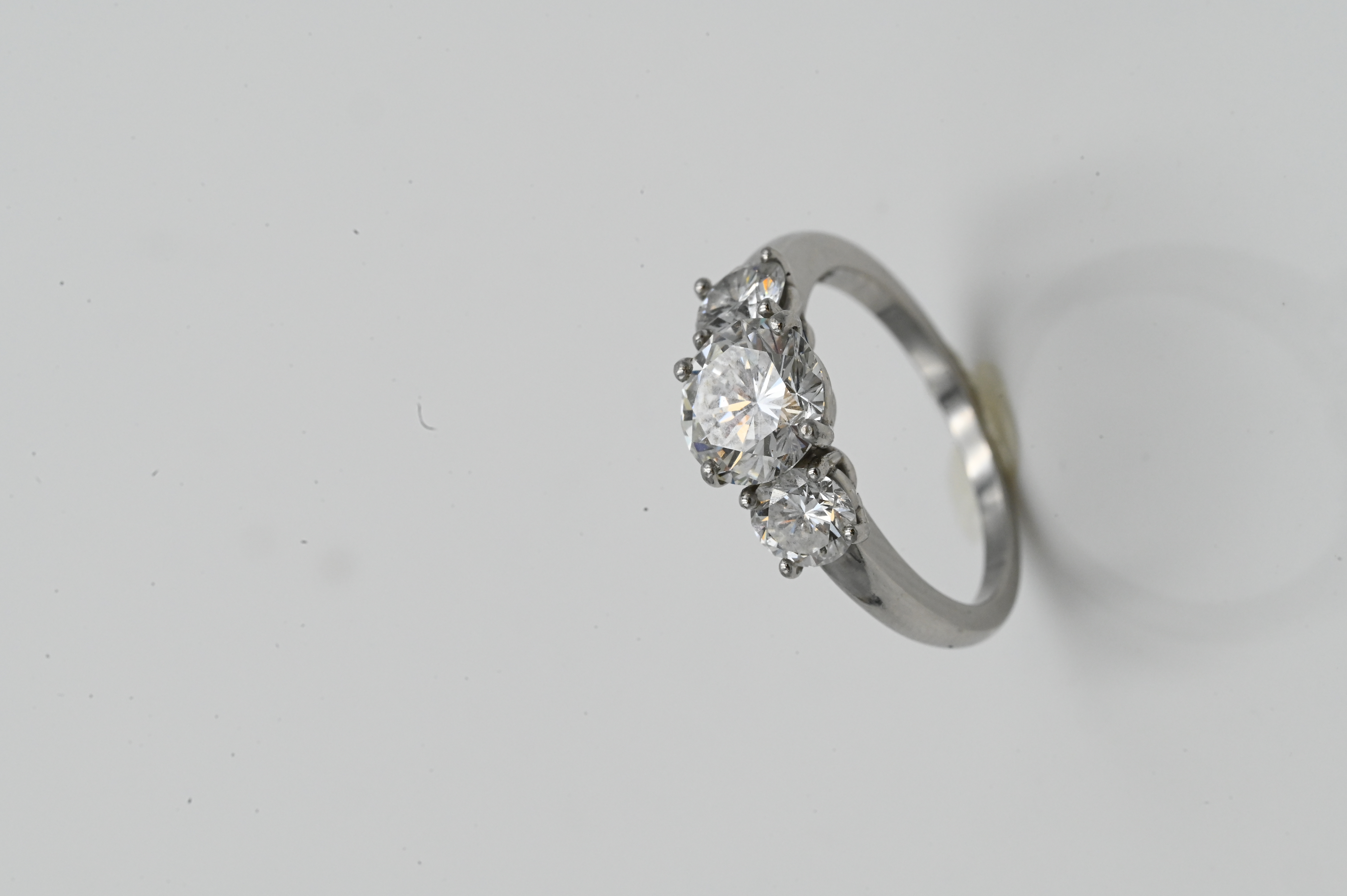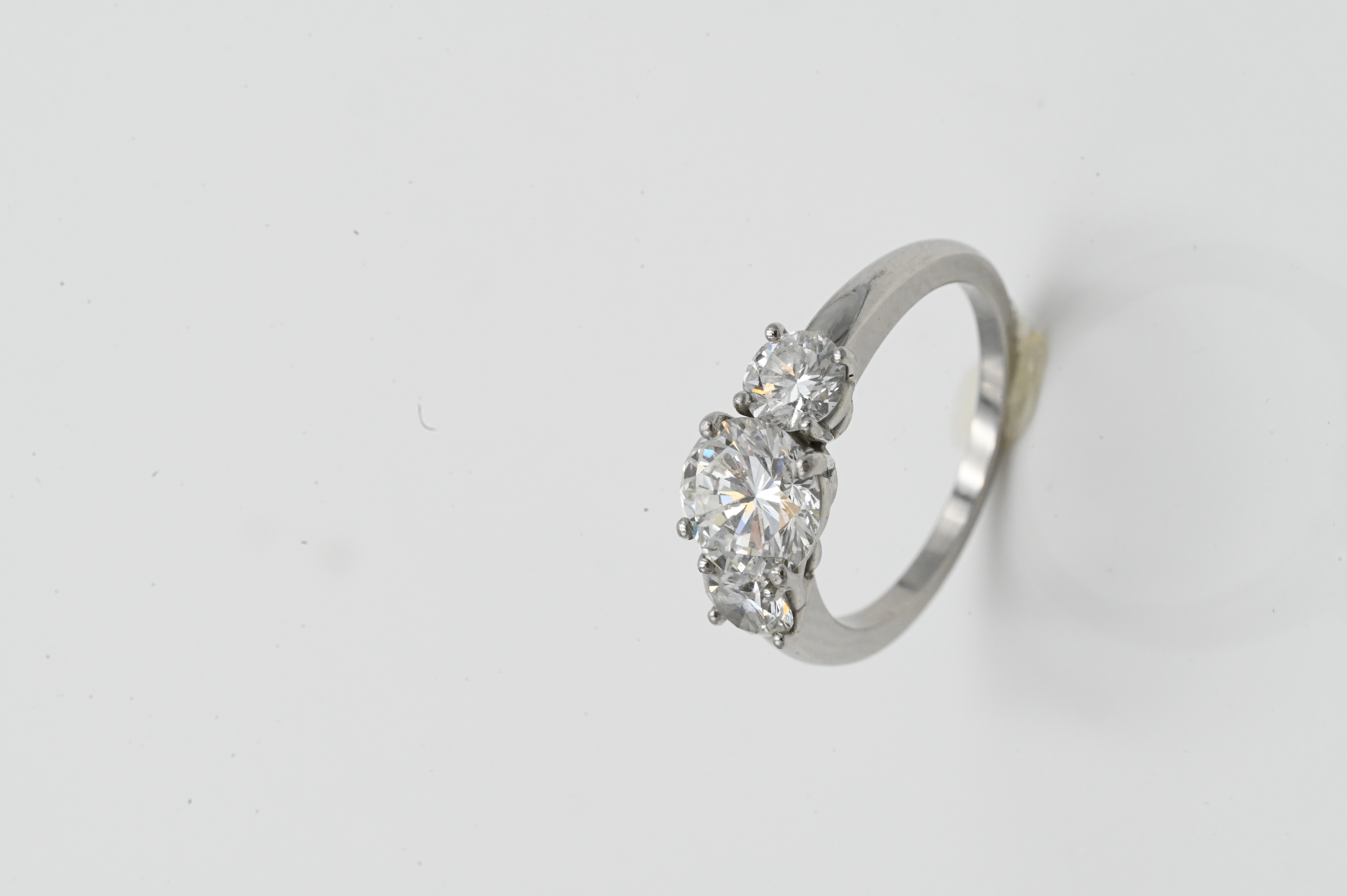 center diamond 1.42 carats, flanked by 4.6, 4.7 millimeters diamonds