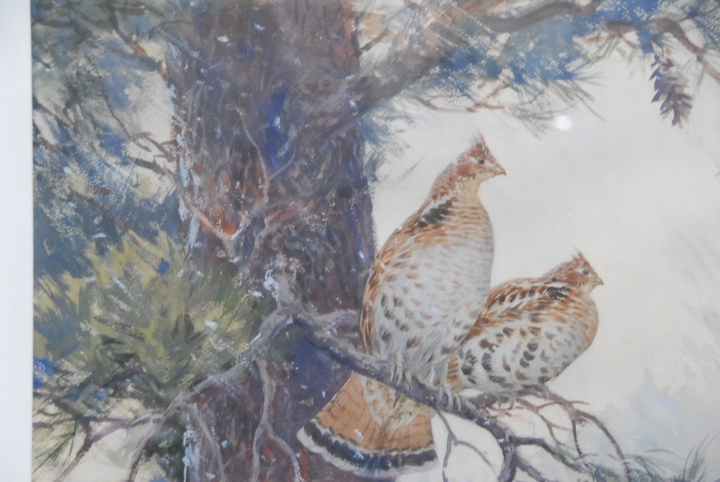 AIDEN LASSELL RIPLEY 1896-1969 UNTITLED TWO GROUSE ON PINE LIMB IN THE WINTER watercolor signed lower left A. Lassell Ripley 1939 Haley & Steele label on the back also old writing of previous owner. 19 x 25