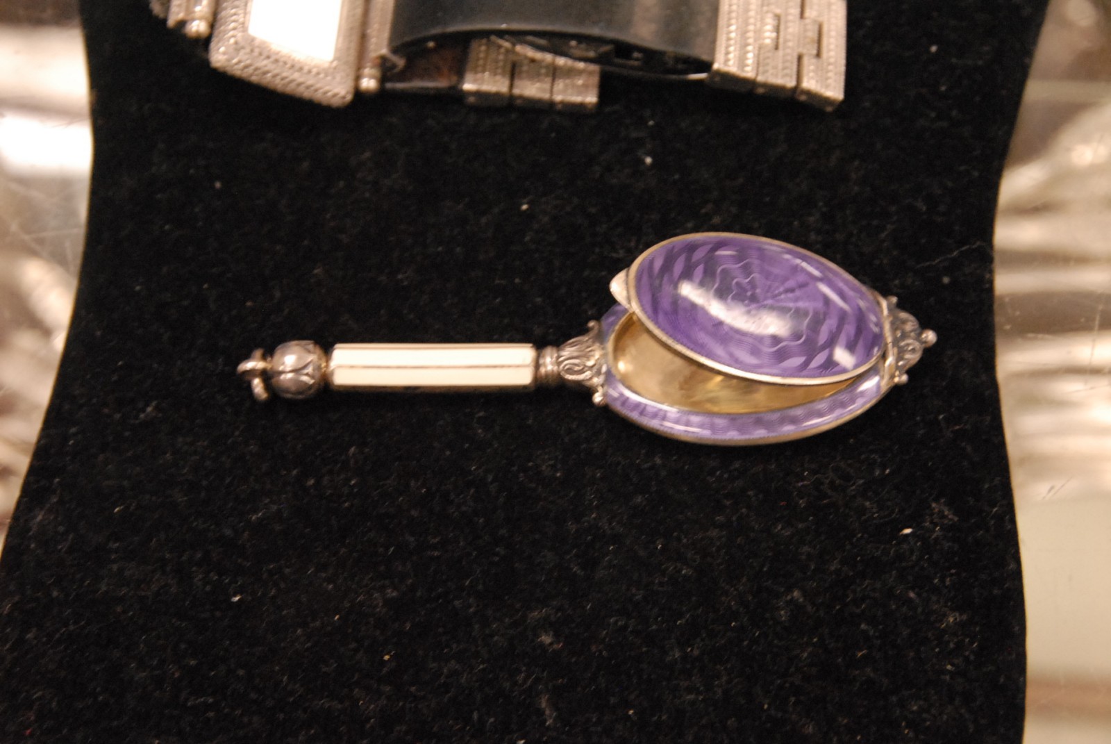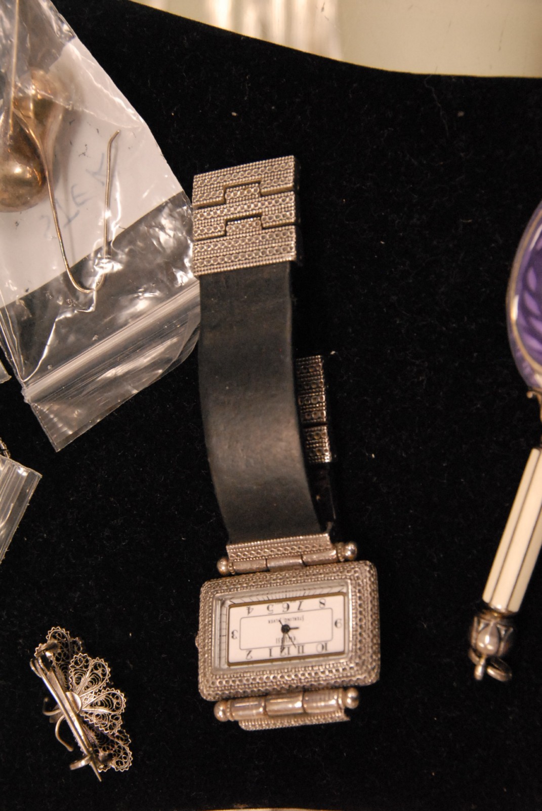 Bag lot of mostly silver jewelry, some mounted with stones, and an enamel mirror with built in compact