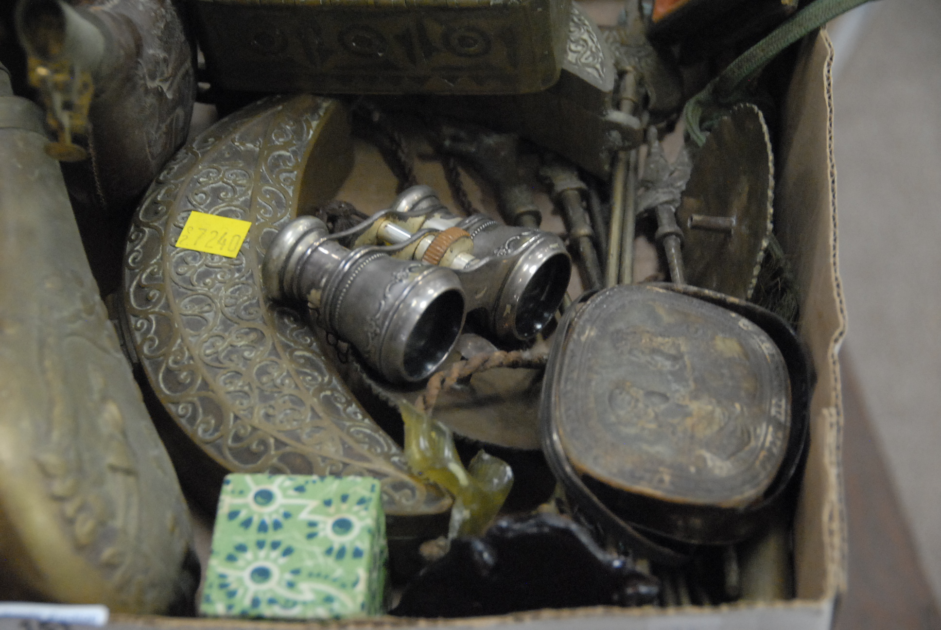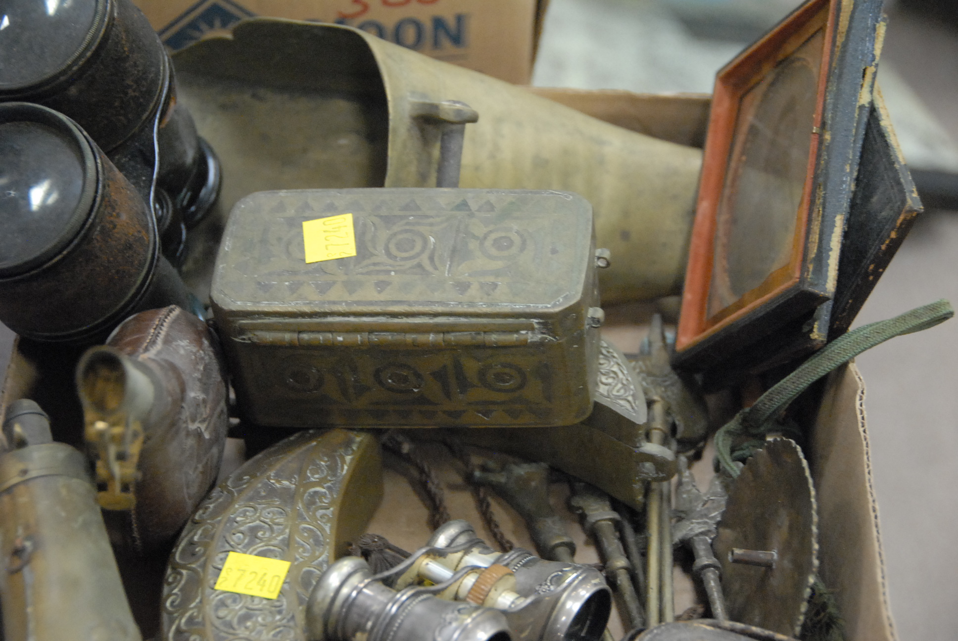 Box lot with early mid Eastern brass and early tortoise box, as is.