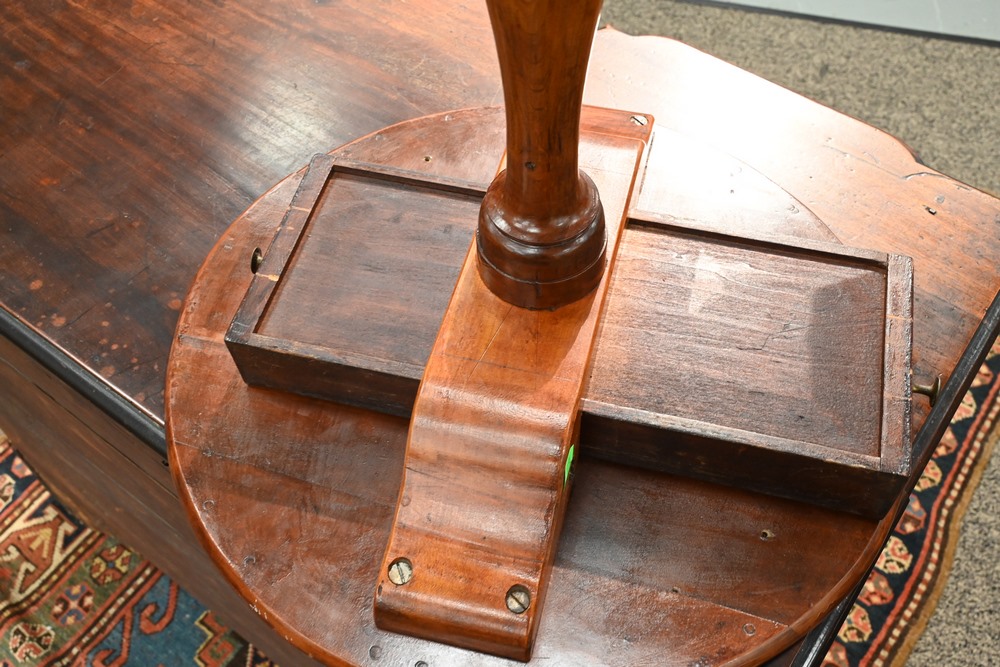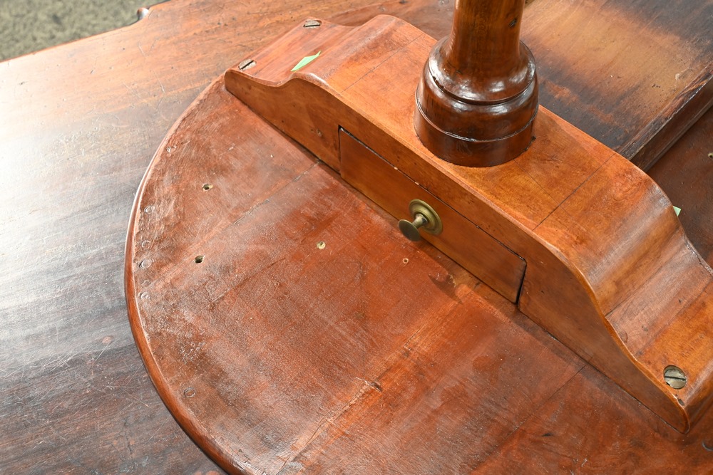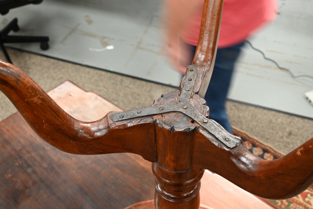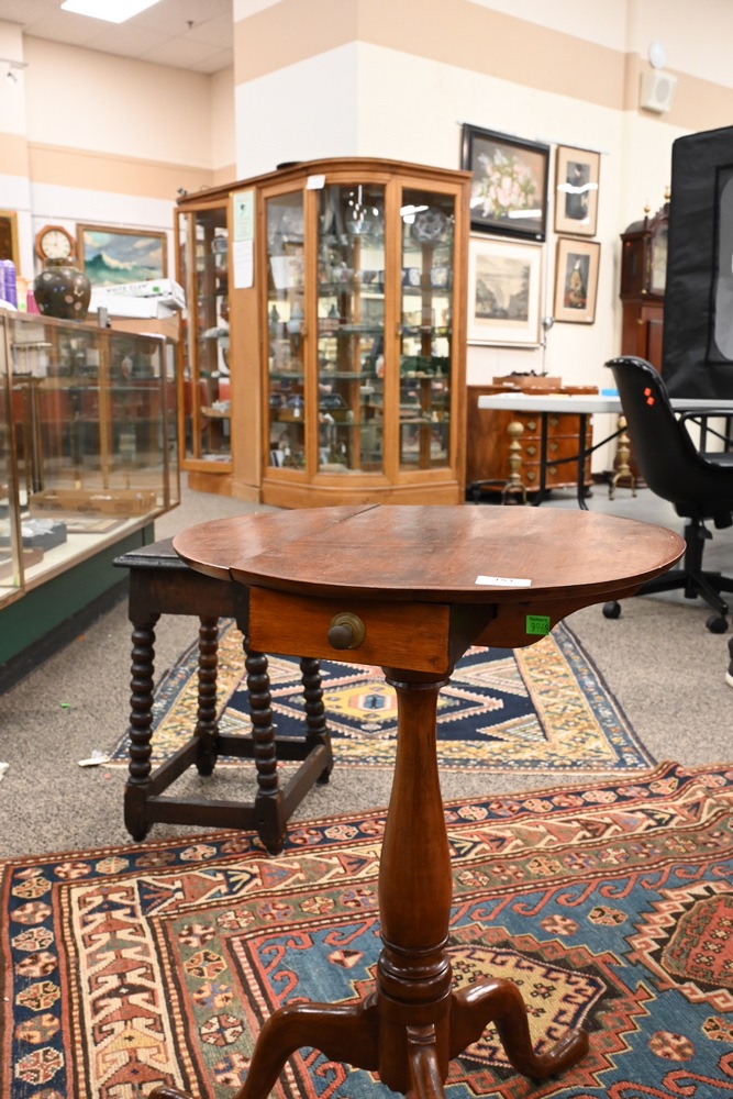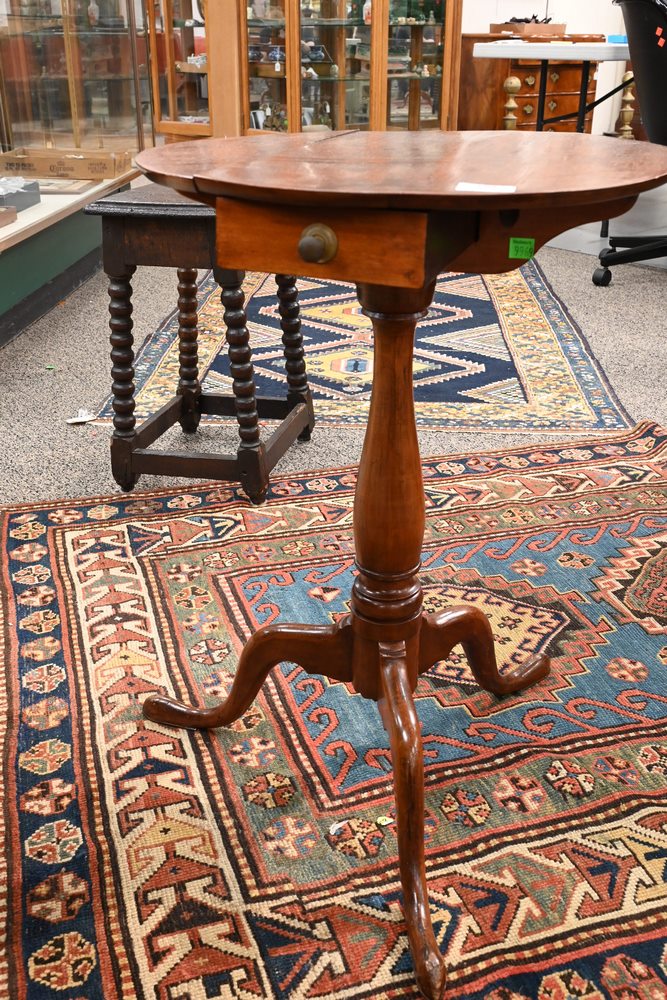 Lot 151: Cherry Round Top Candle Stand having drawer on turned shaft set on tripod base height 26 3/4 inches, top 18 x 18 3/4 inches Provenance: Fifty Year Personal Collection of Clocks and American Antiques from Thomas Bailey, Manchester, Connecticut.