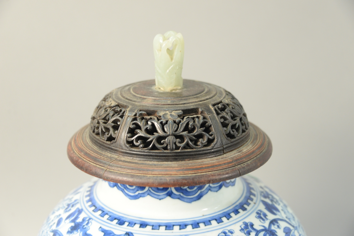 Chinese blue and white Meiping phoenix bird porcelain vase having reticulated carved top with hardstone finial. ht. 18in. Provenance: Collection of Anne Jones Willis and the late John Ralph Willis, New Jersey