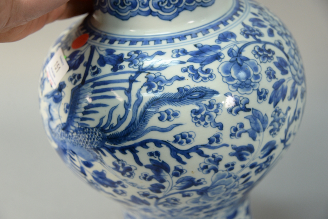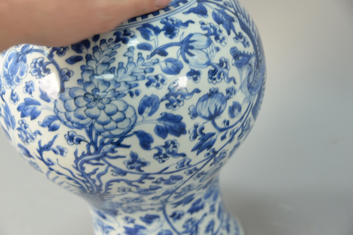 Lot 151: Chinese blue and white Meiping phoenix bird porcelain vase having reticulated carved top with hardstone finial. ht. 18in. Provenance…