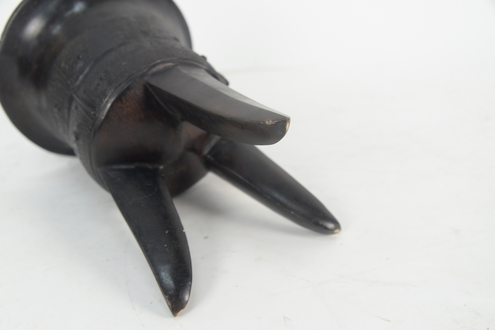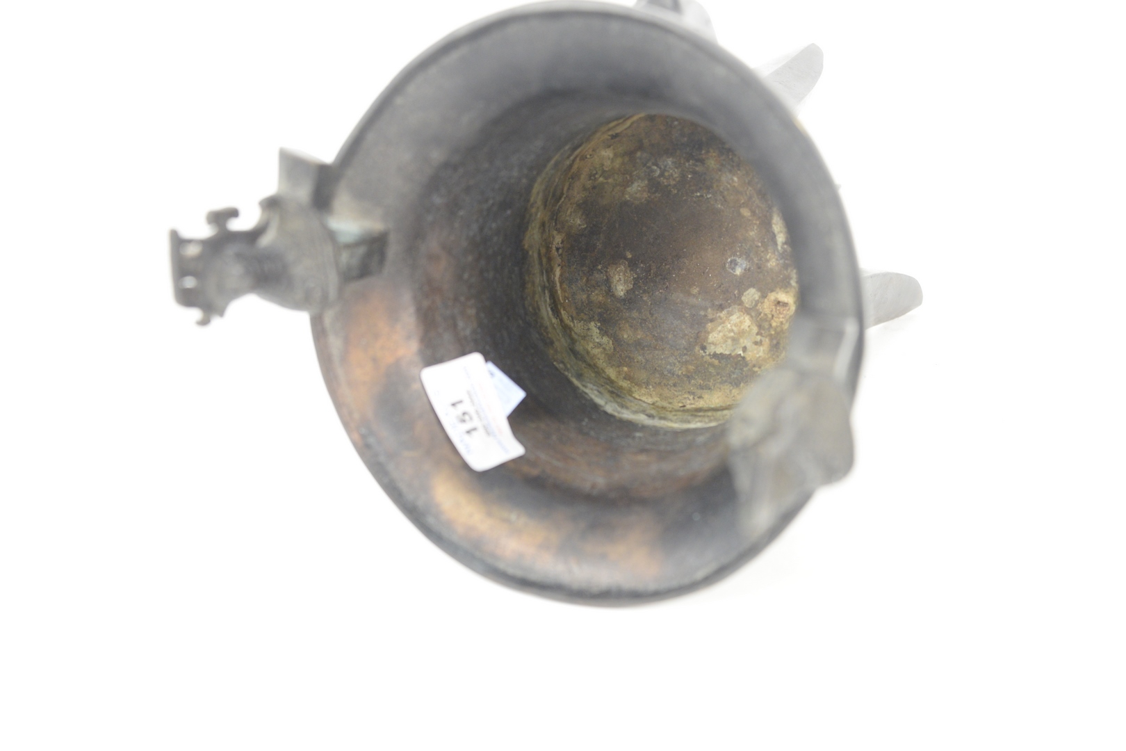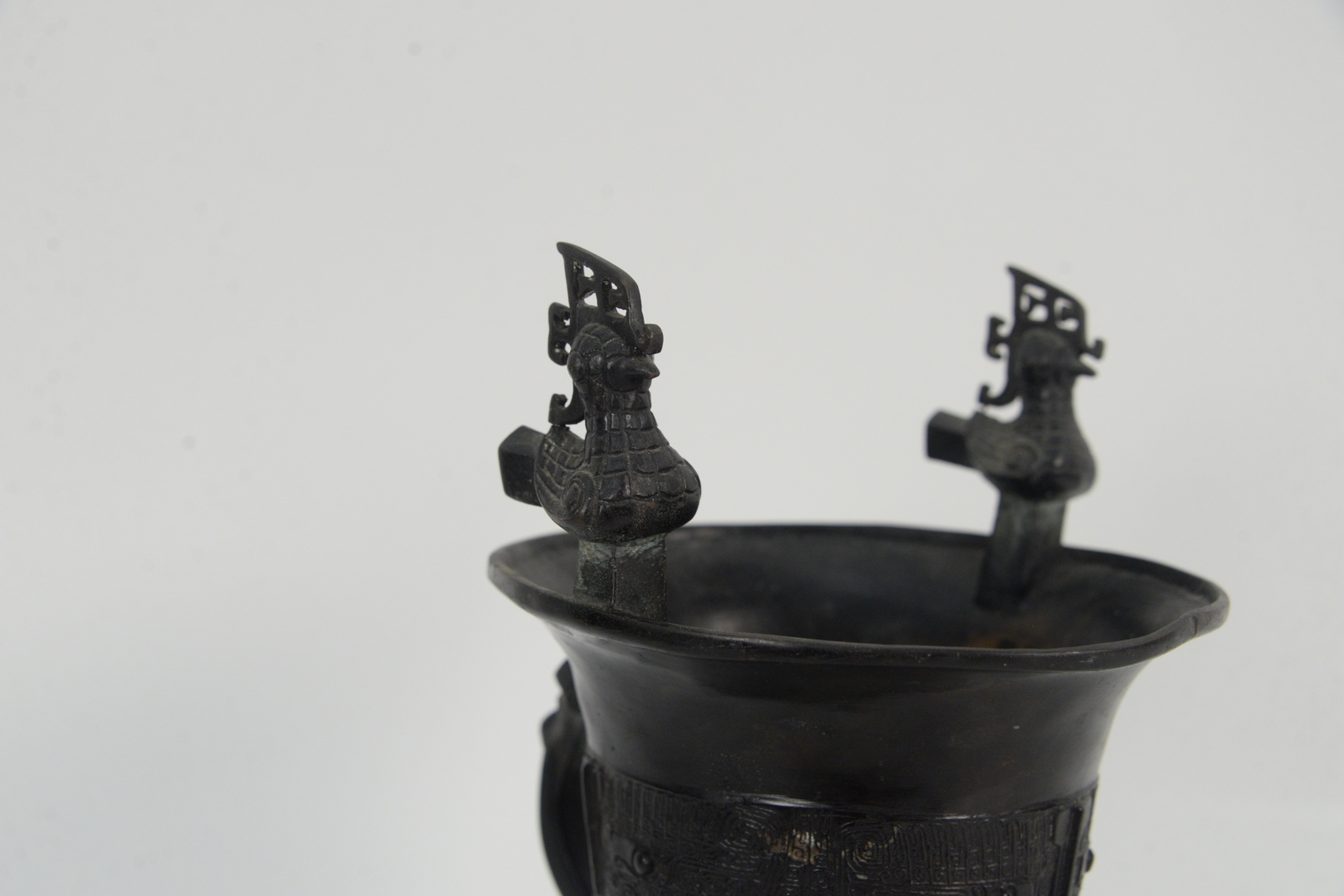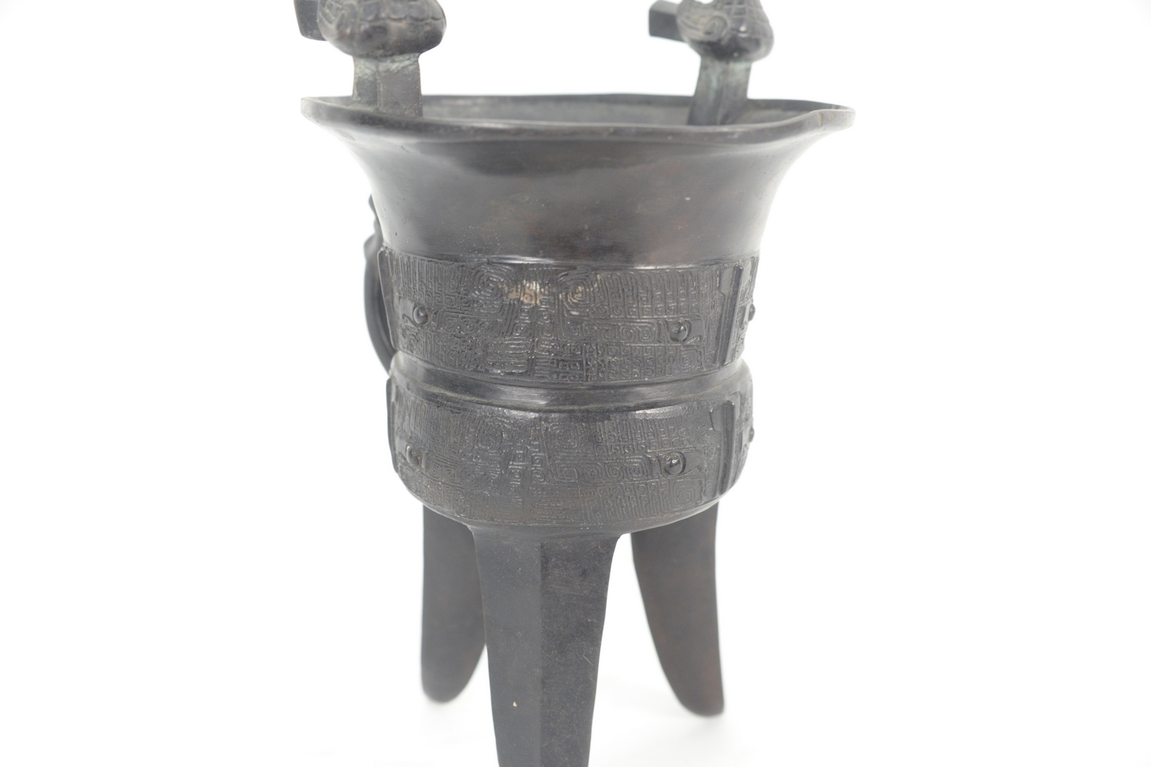 Lot 151: Chinese Bronze in Archaic Form of a Jue, ding with bird and daodieh mask handle and decoration, 19th century, height 10 inches.