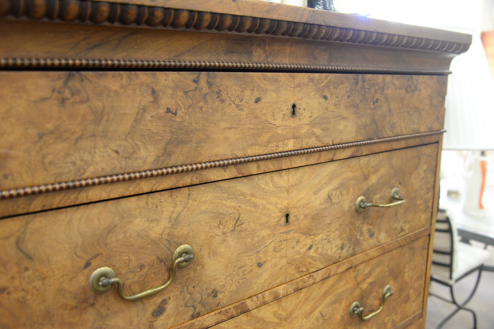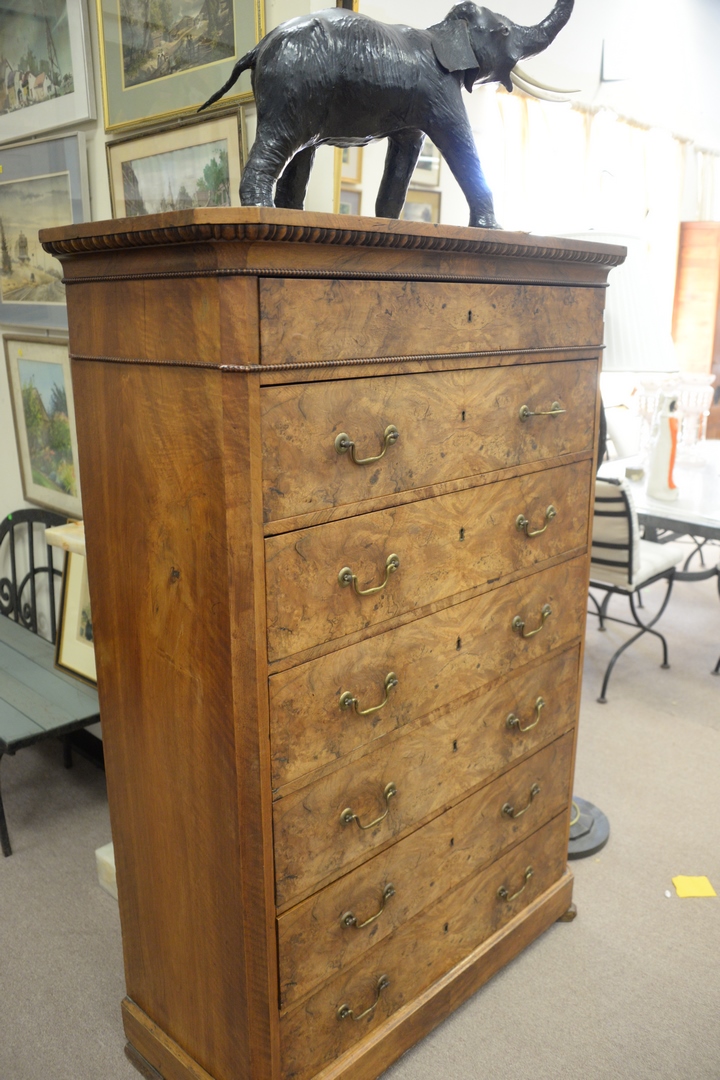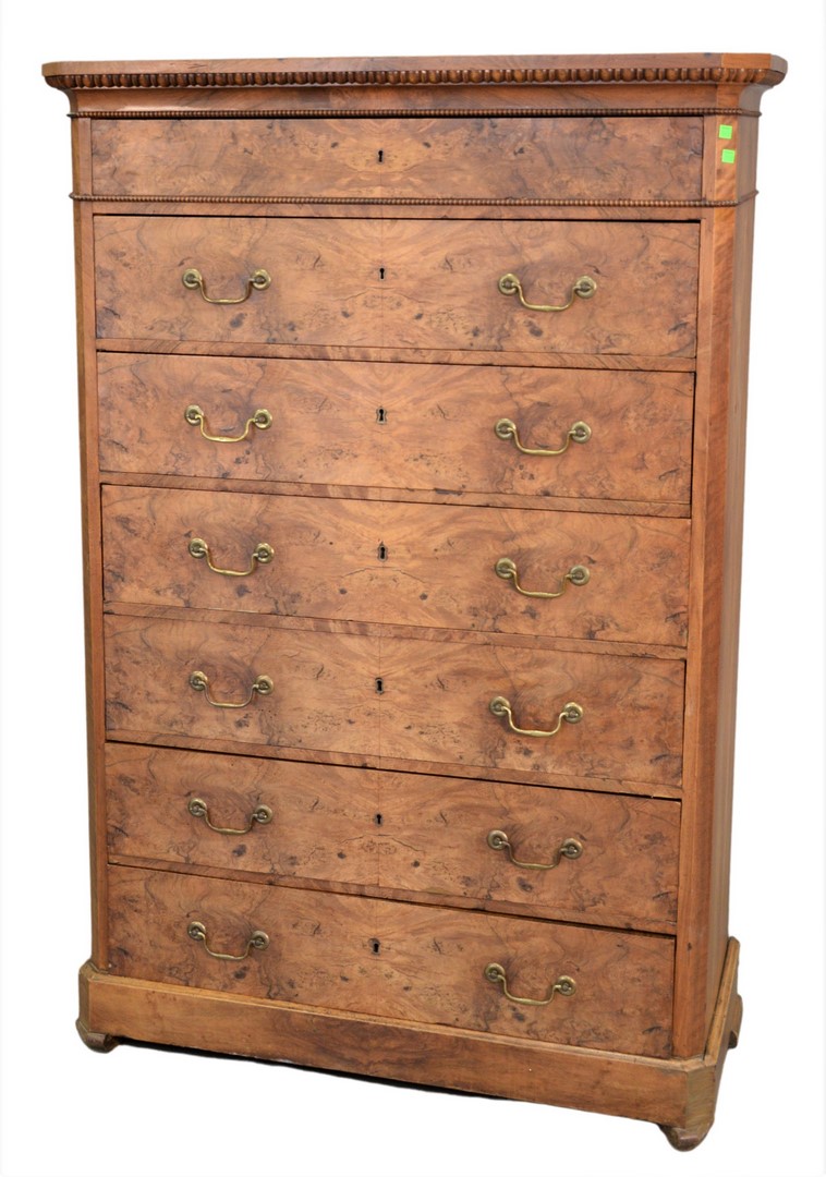 Lot 151: Continental Burlwood Tall Chest, having seven drawers, 19th century, height 62 3/4 inches, top 42 3/4″ x 18 1/2″.