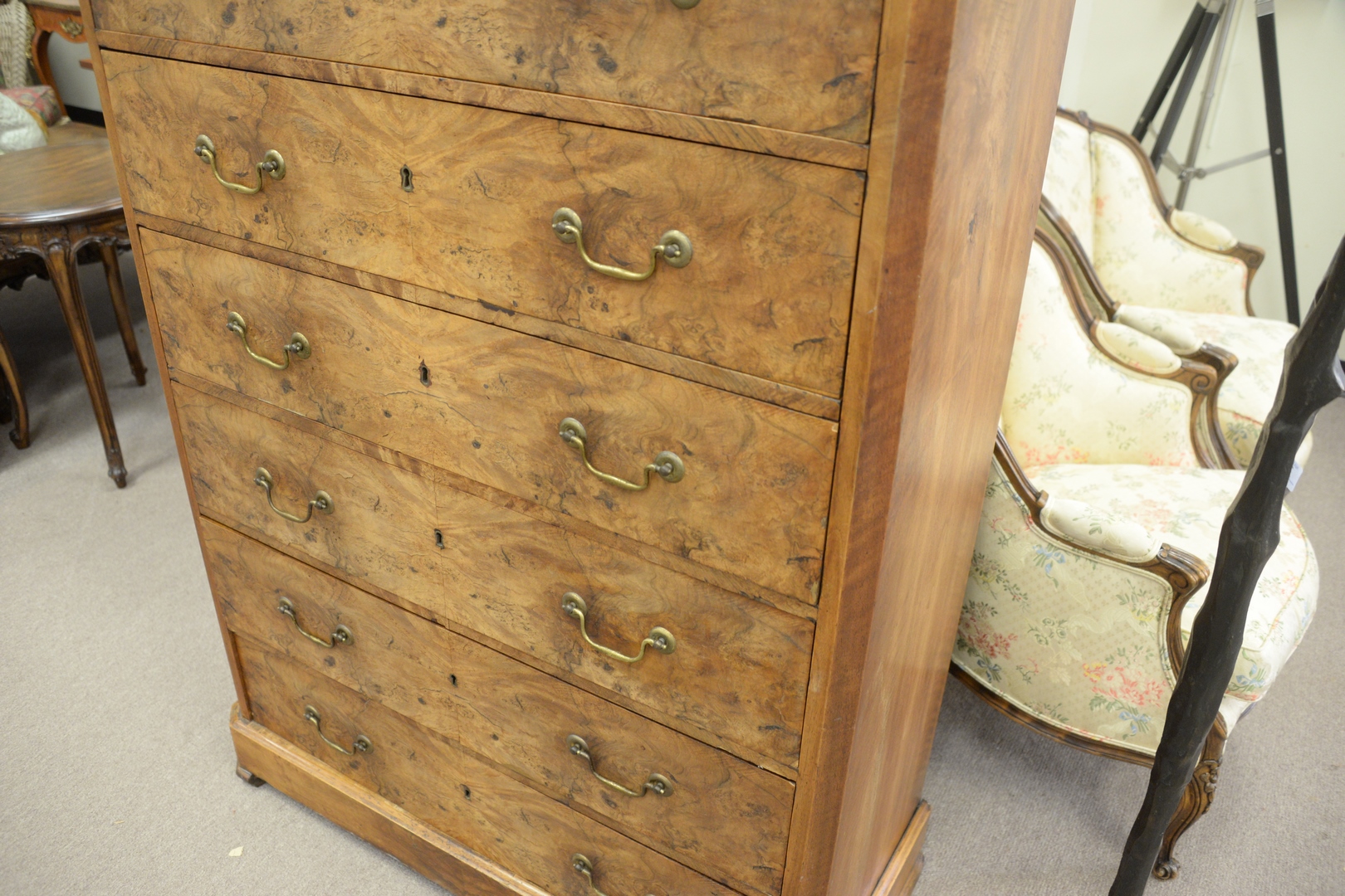 Continental Burlwood Tall Chest, having seven drawers, 19th century, height 62 3/4 inches, top 42 3/4″ x 18 1/2″.