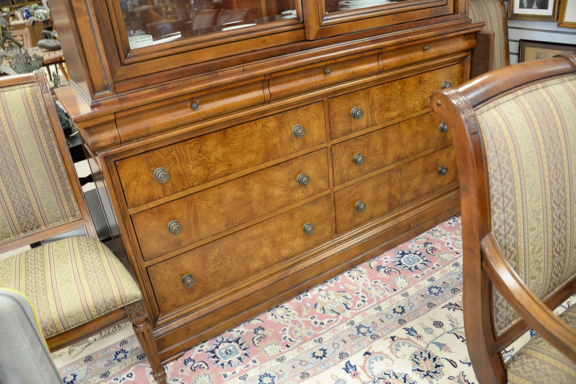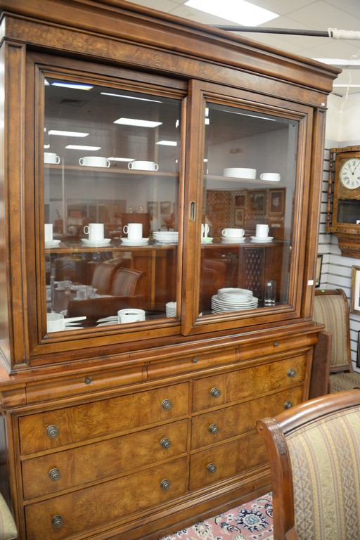 Ethan Allen breakfront having sliding glass door top over burlwood base with drawers, ht. 92in., wd. 68in., dp. 19in.