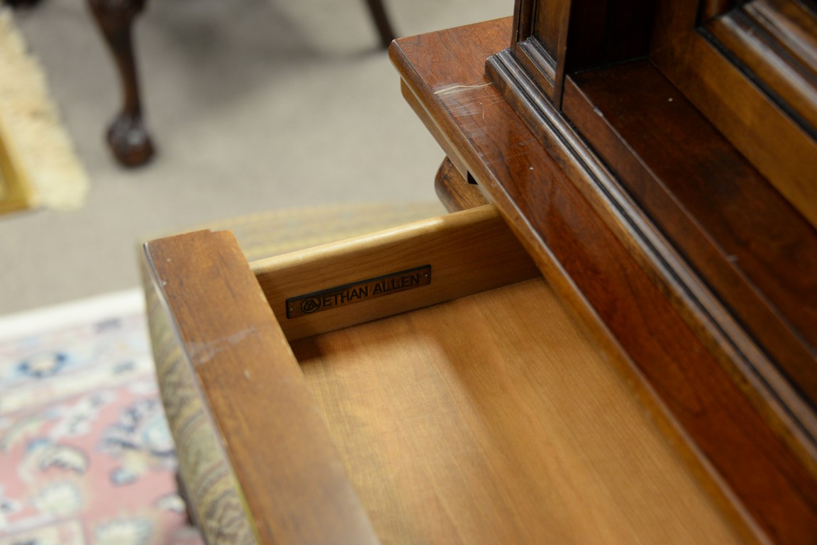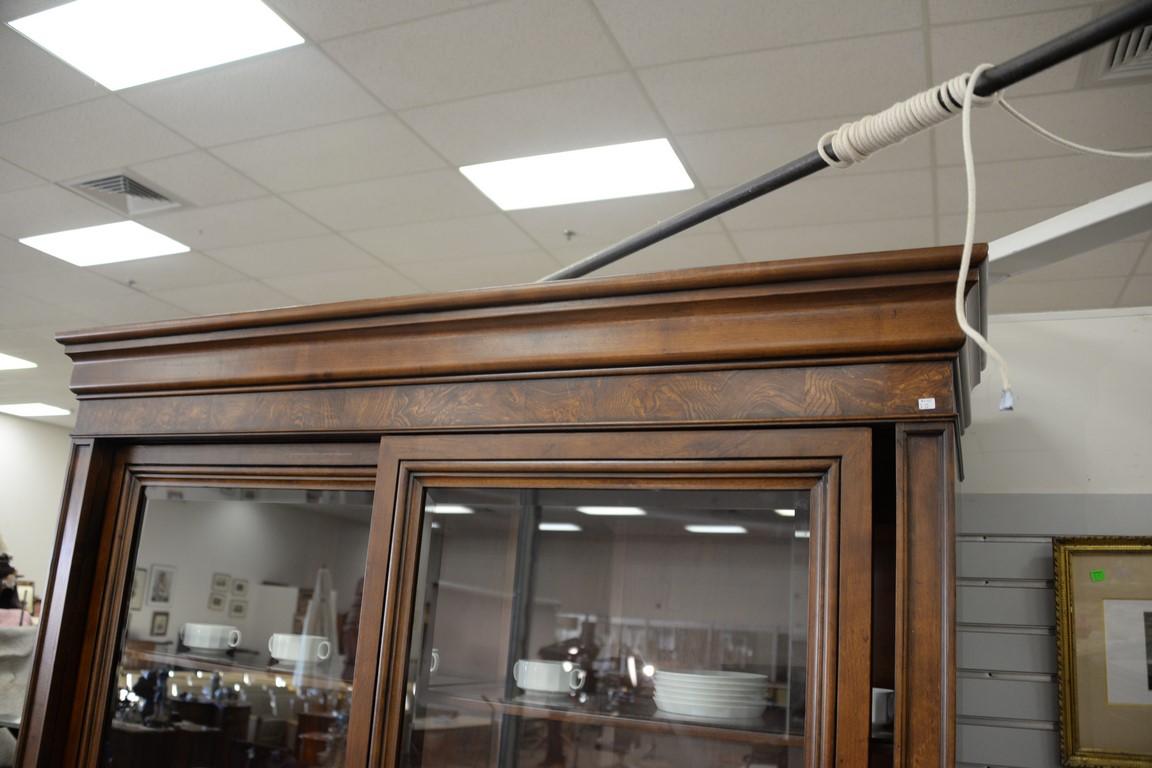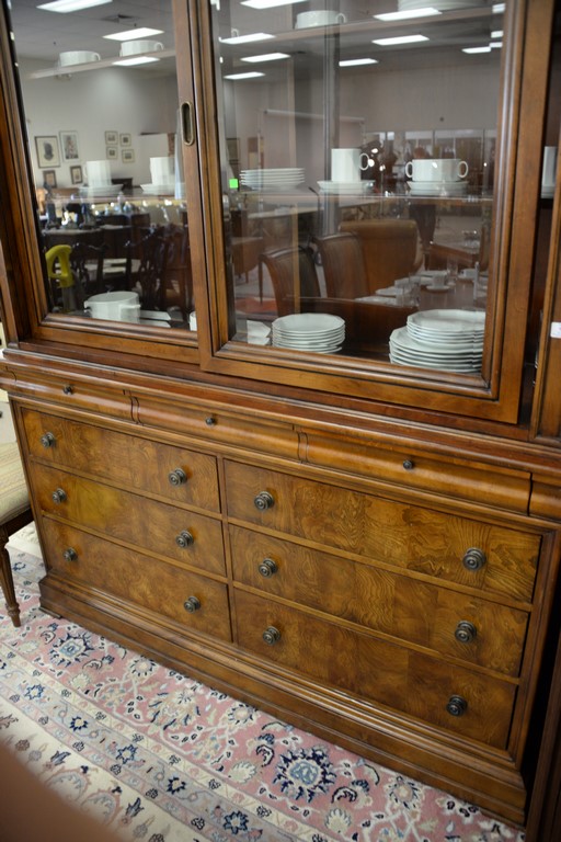 Lot 151: Ethan Allen breakfront having sliding glass door top over burlwood base with drawers, ht. 92in., wd. 68in., dp. 19in.