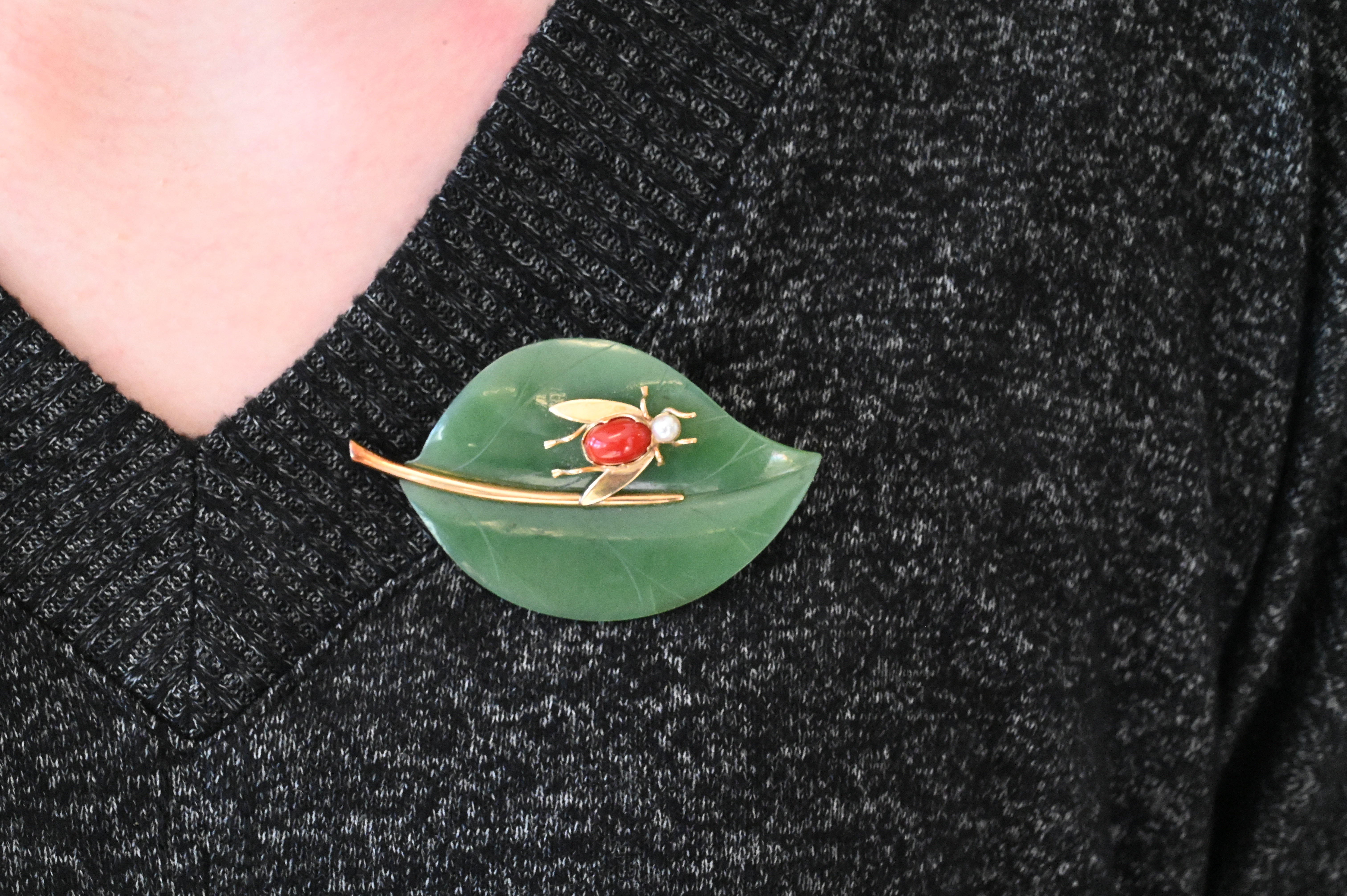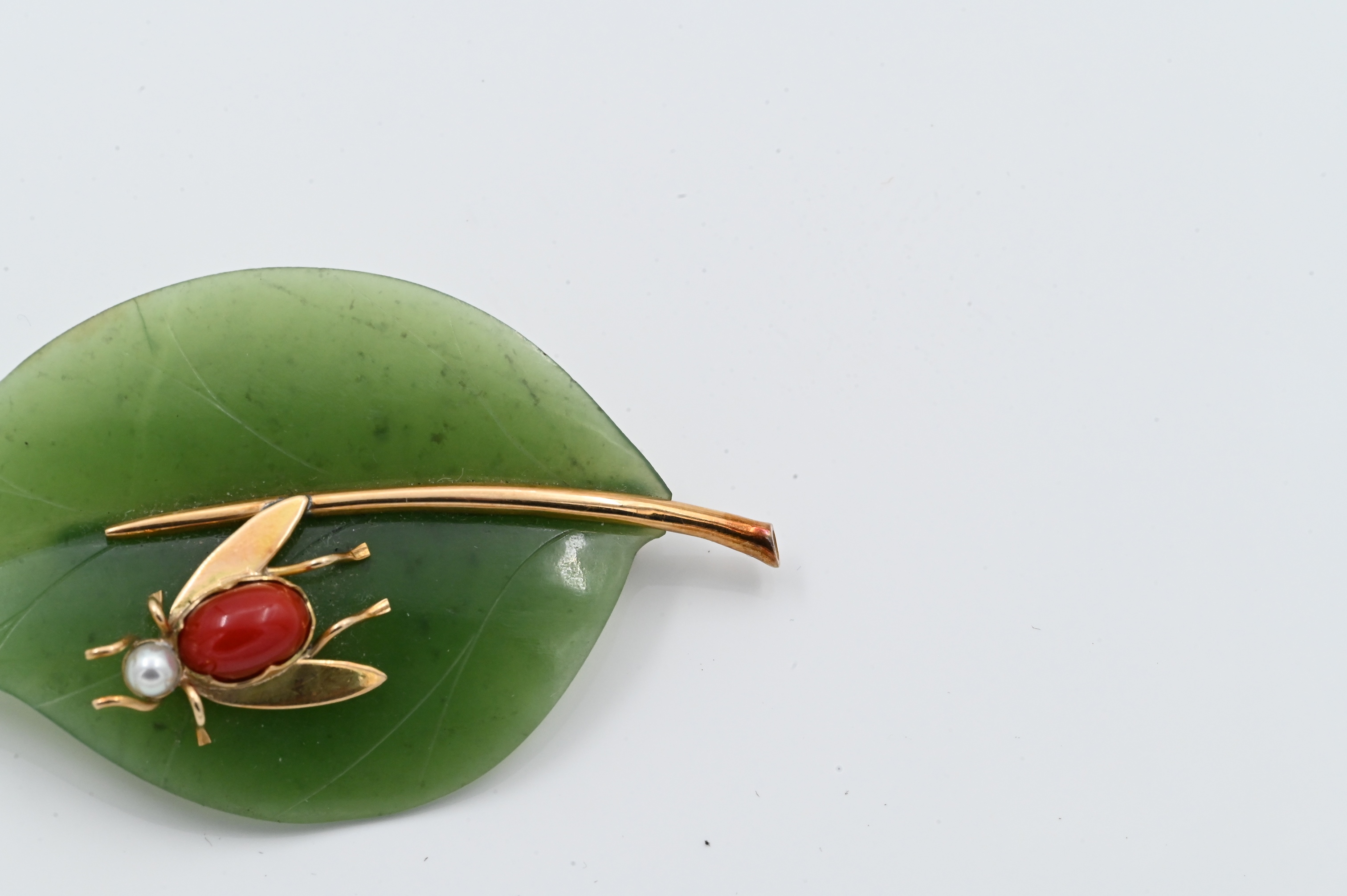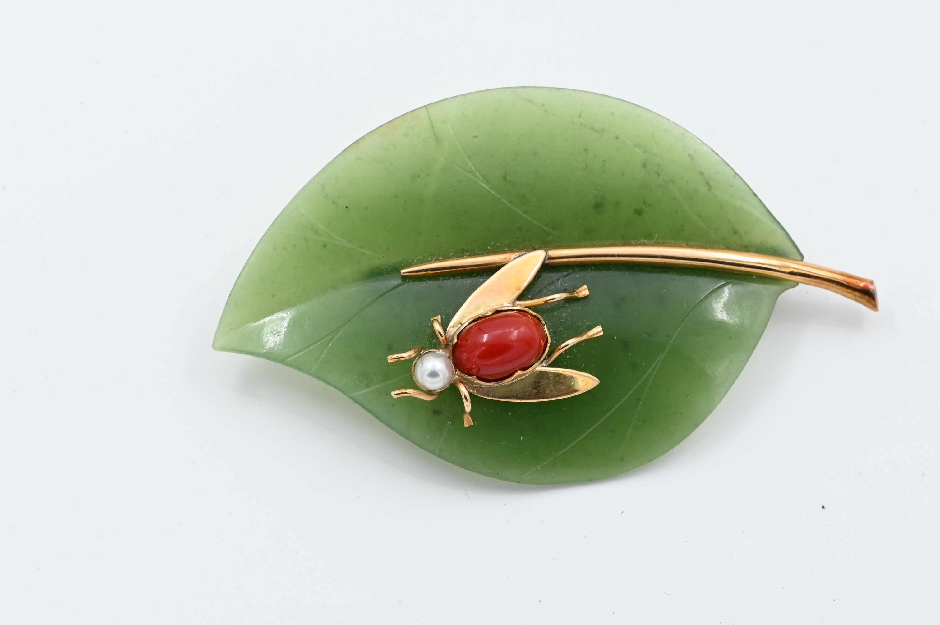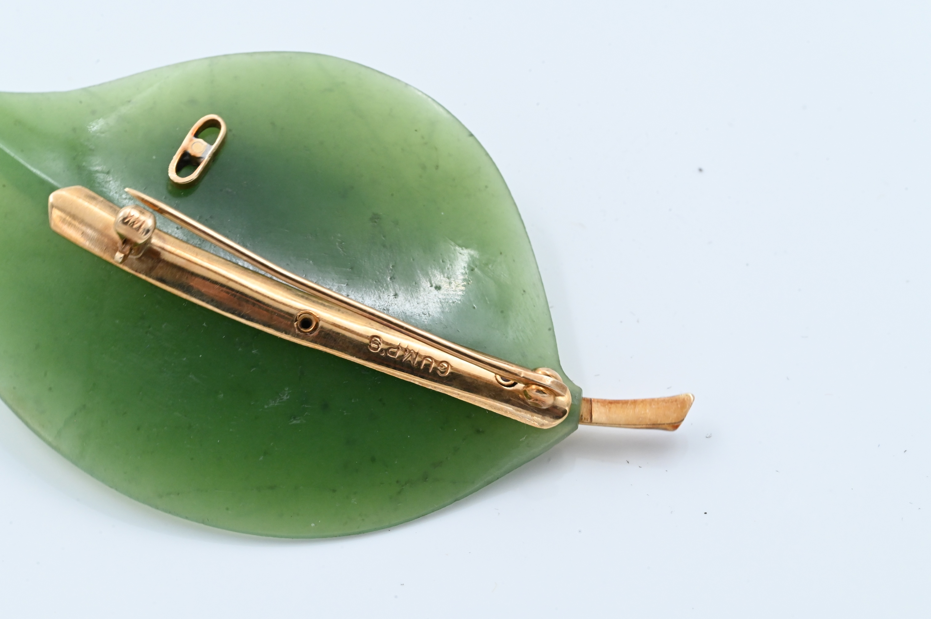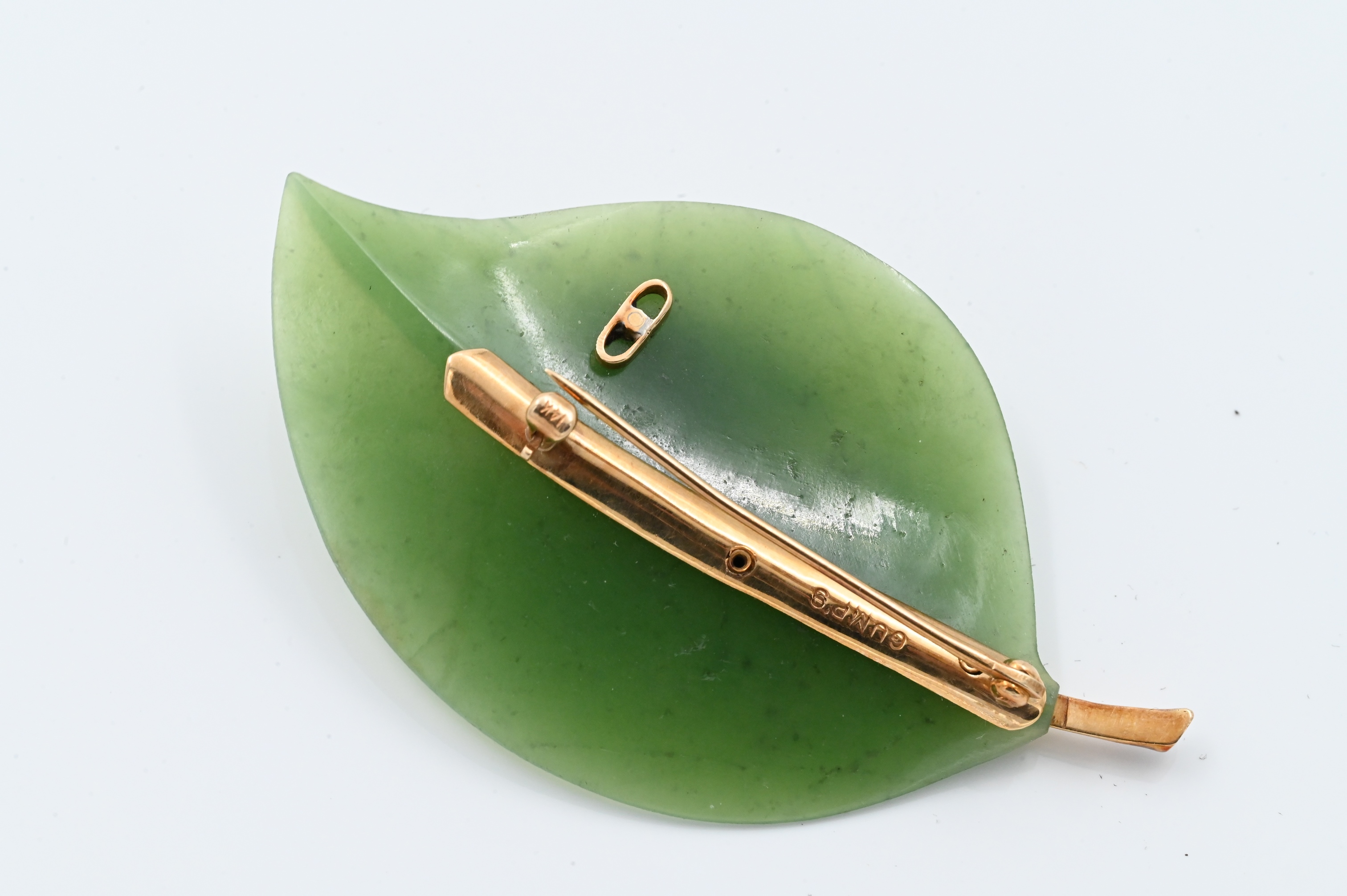 Lot 151: Gumps 14K Yellow Gold Mounted Nephrite Jade Leaf
