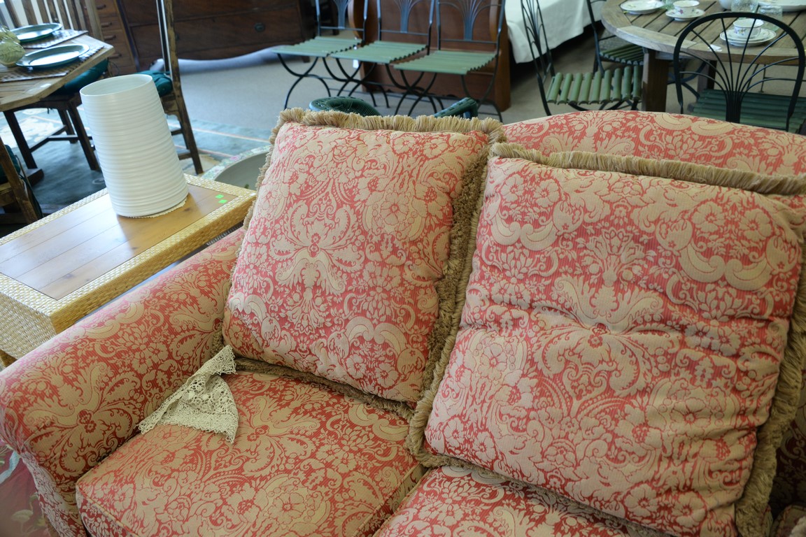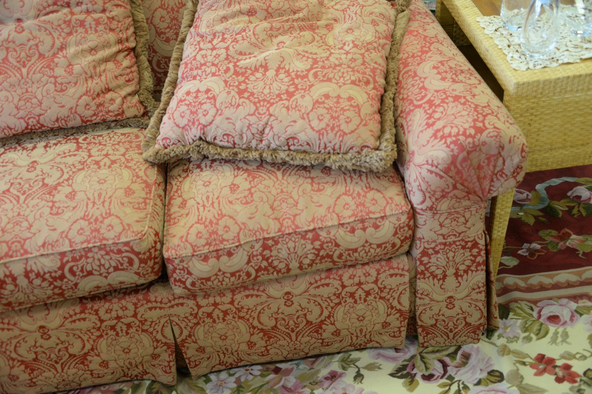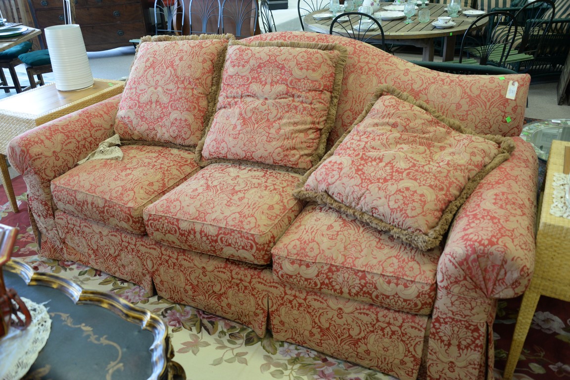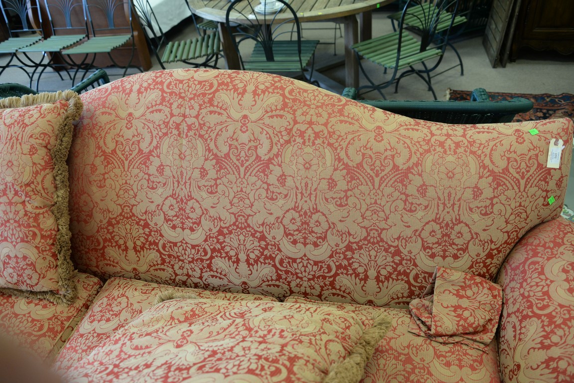 Henredon red and tan paisley upholstered sofa having rolled arms and back. lg. 88in.
