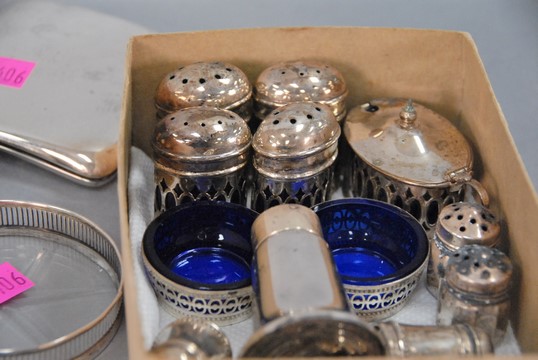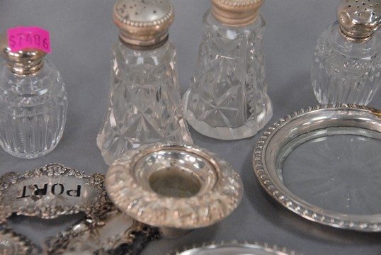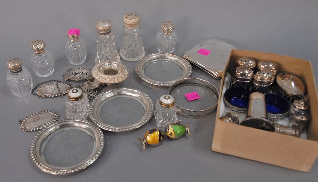 Lot to include sterling cigarette case, salt and peppers, two enameled fish, coasters.