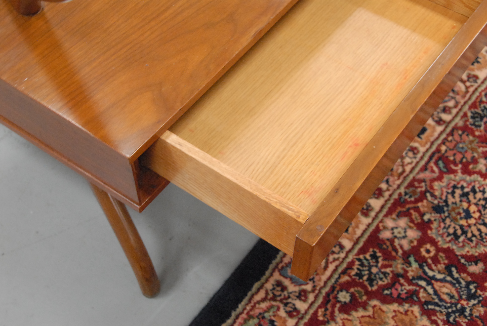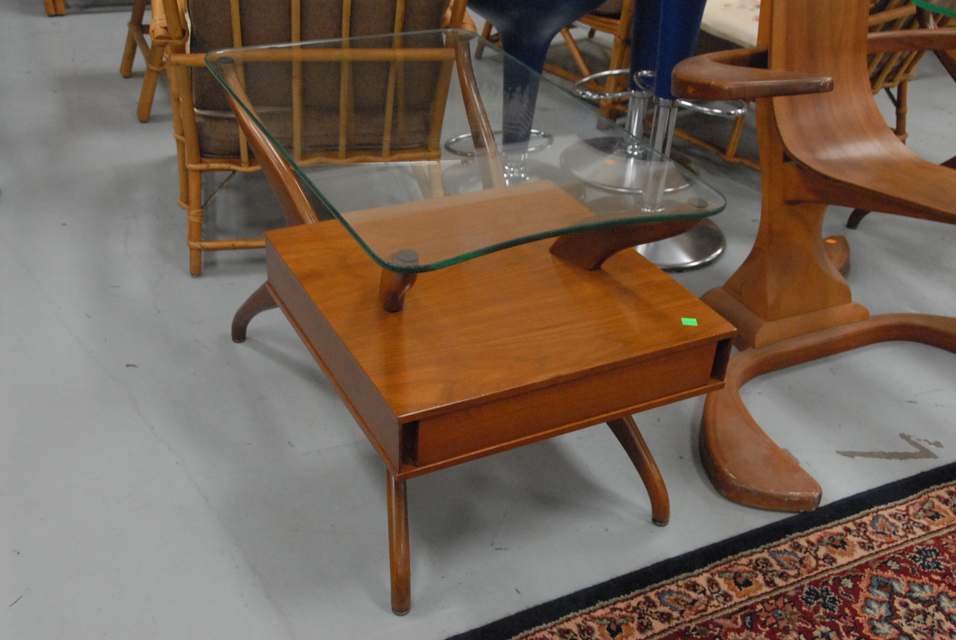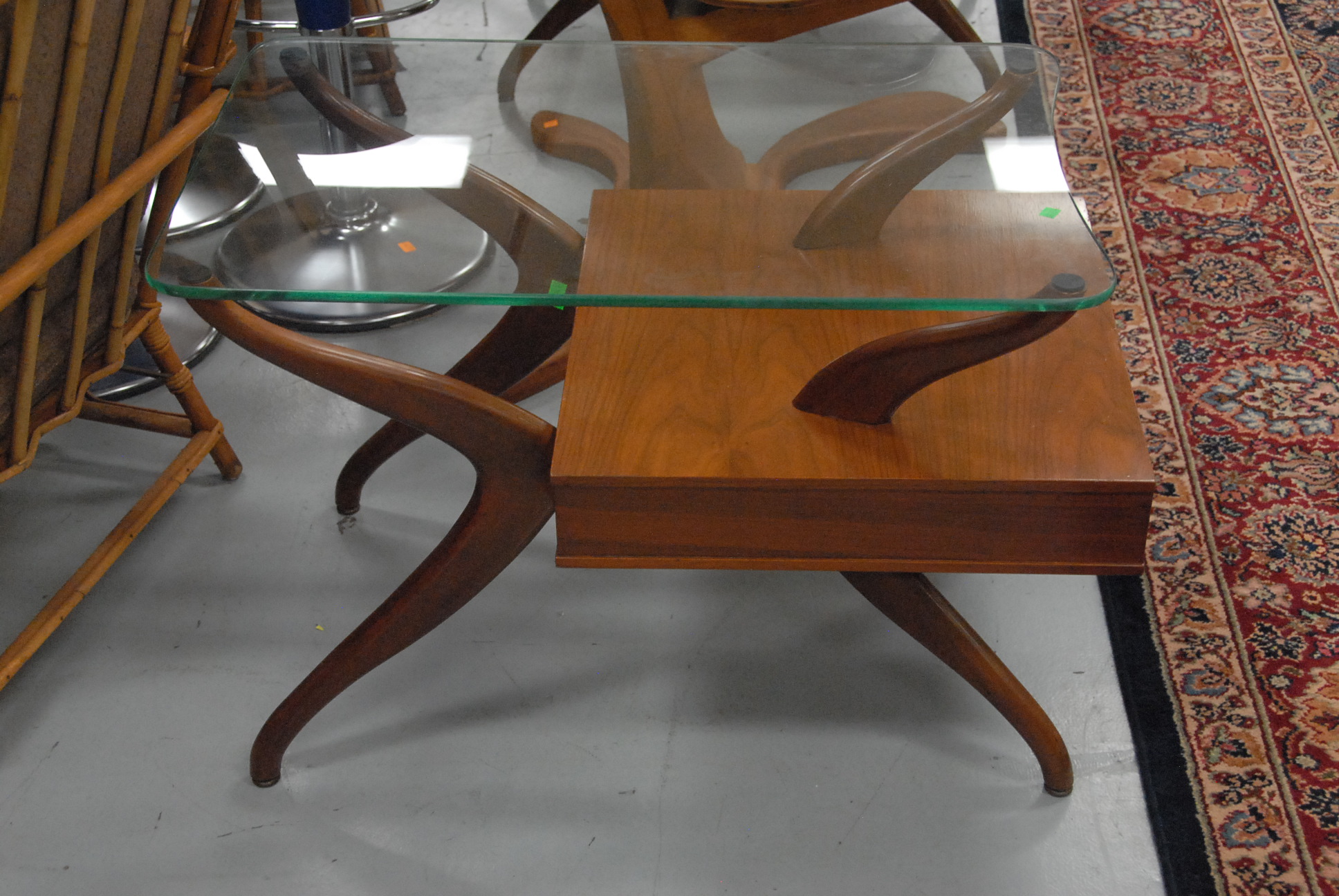 Pair of Vladimer Kagan style walnut end tables with glass tops, ht. 22in. tops: 20 x 31.