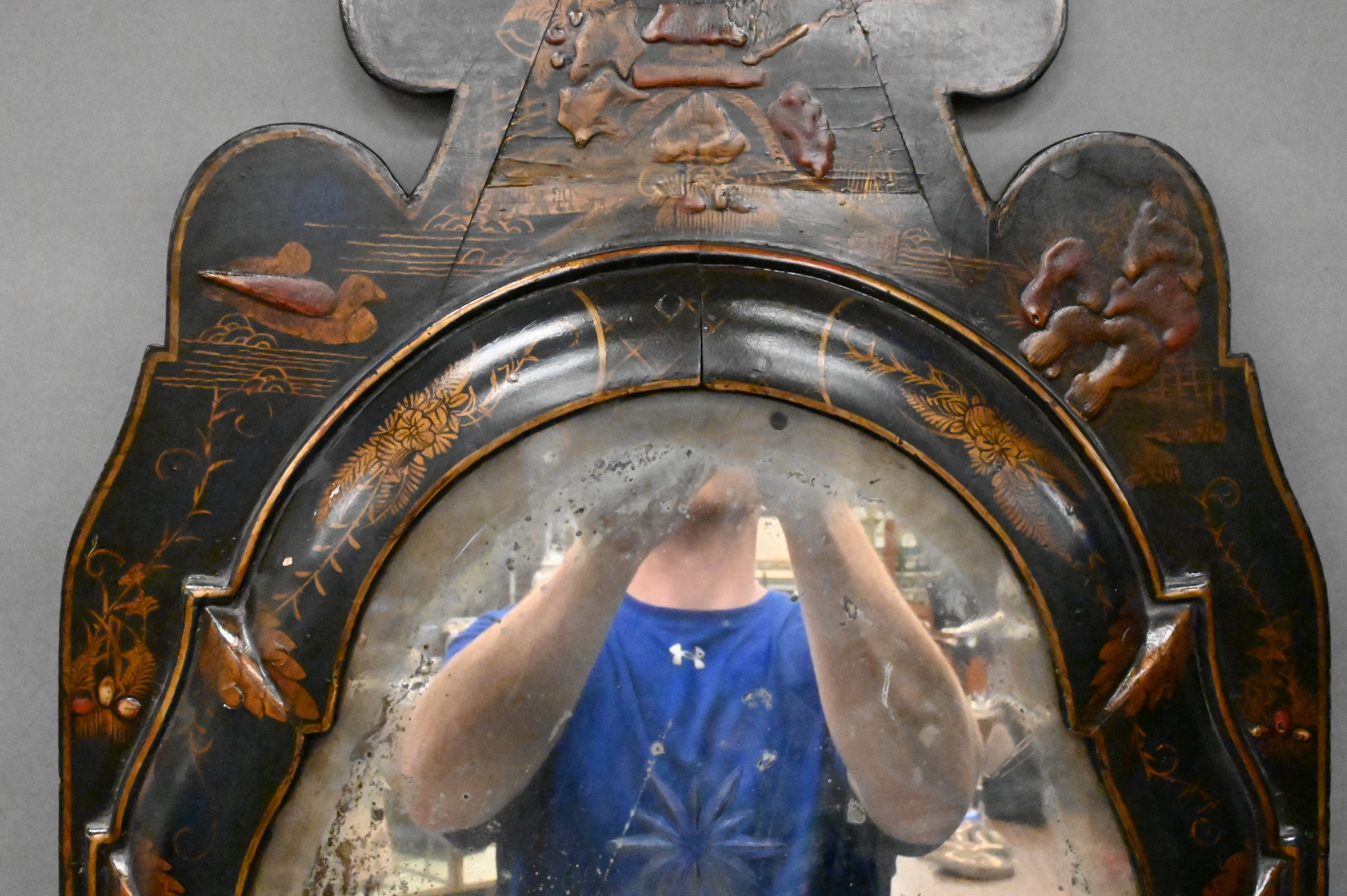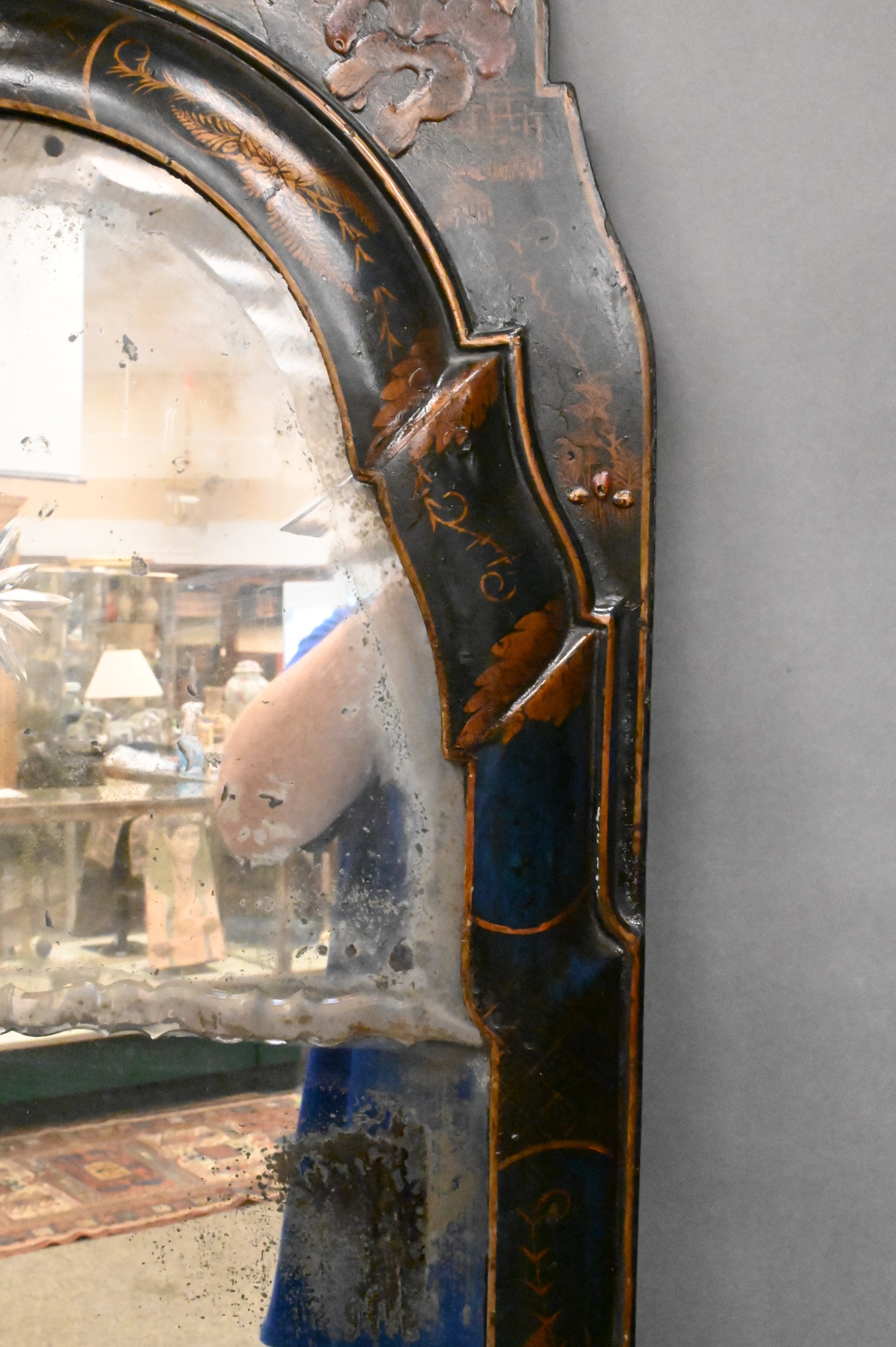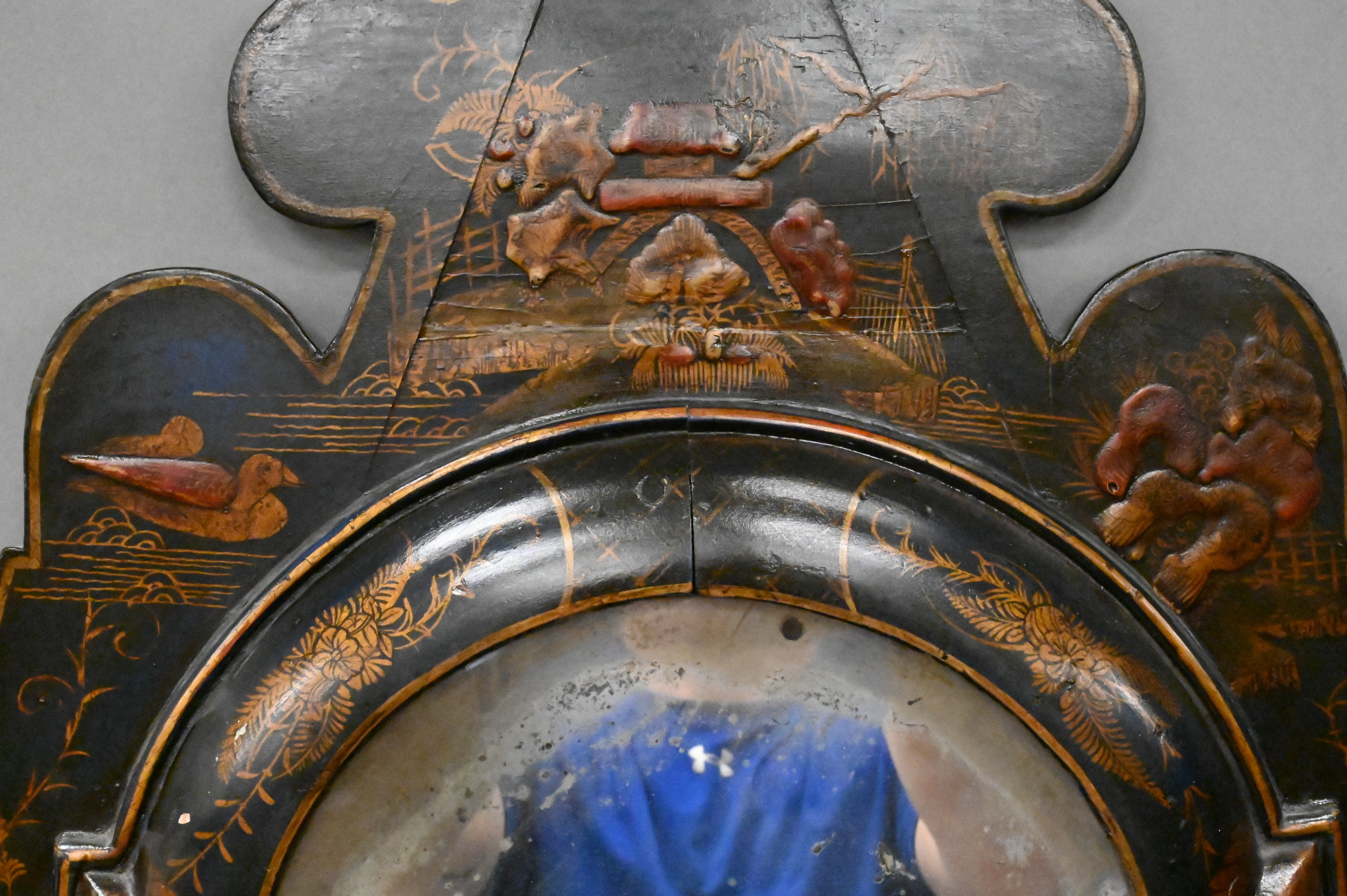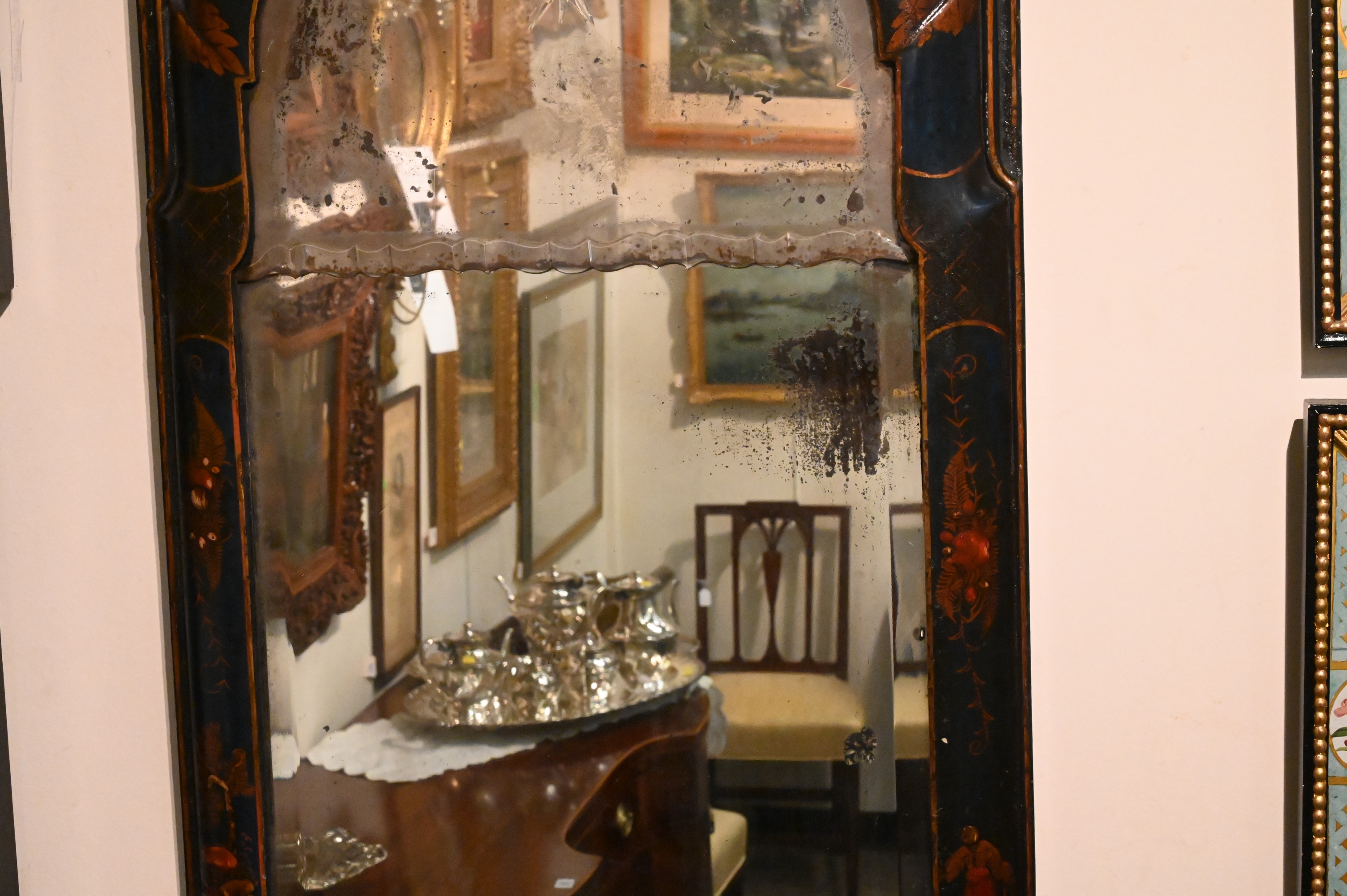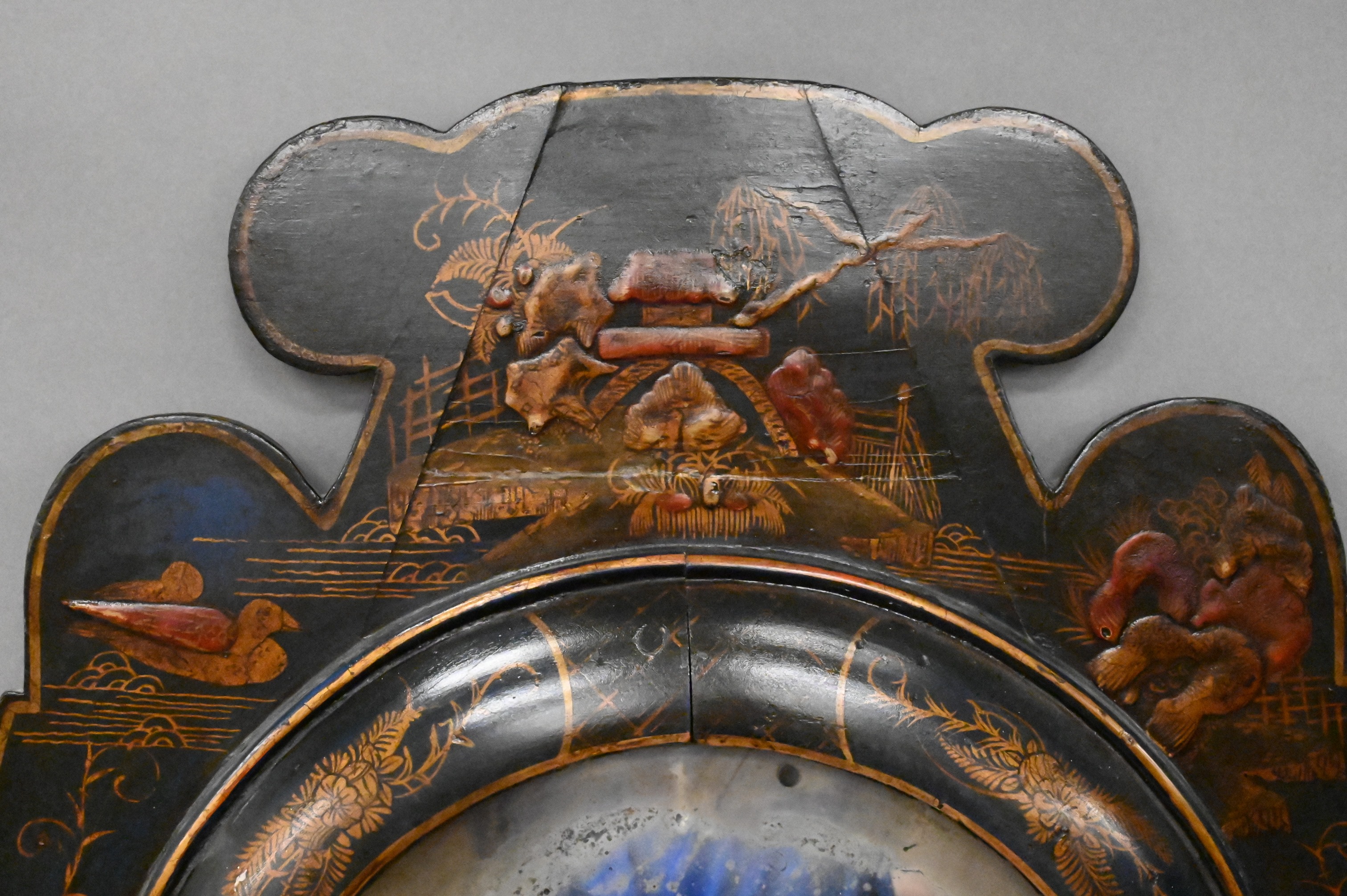 In black lacquer with chinoiserie decoration and original back, circa 1710