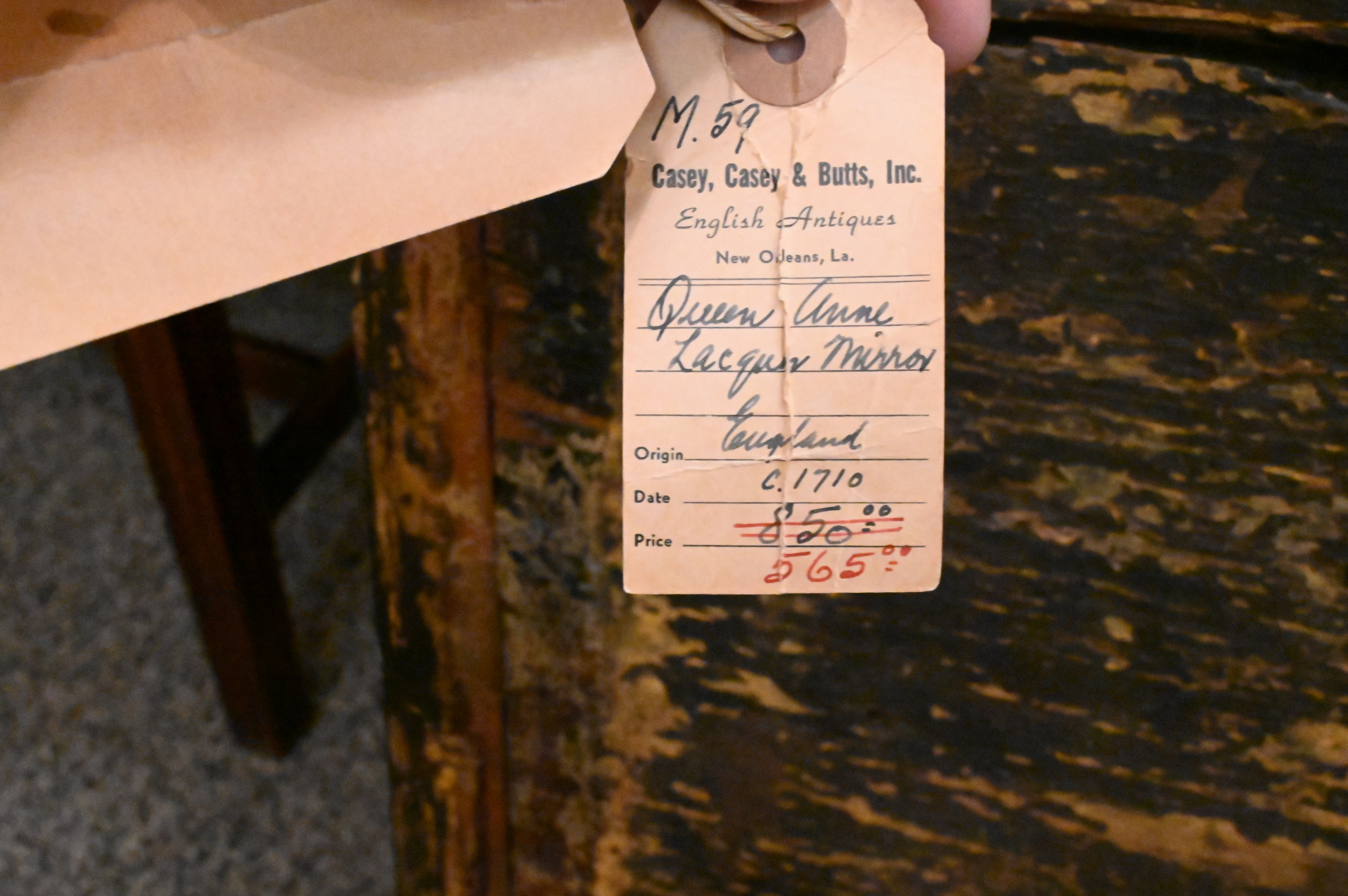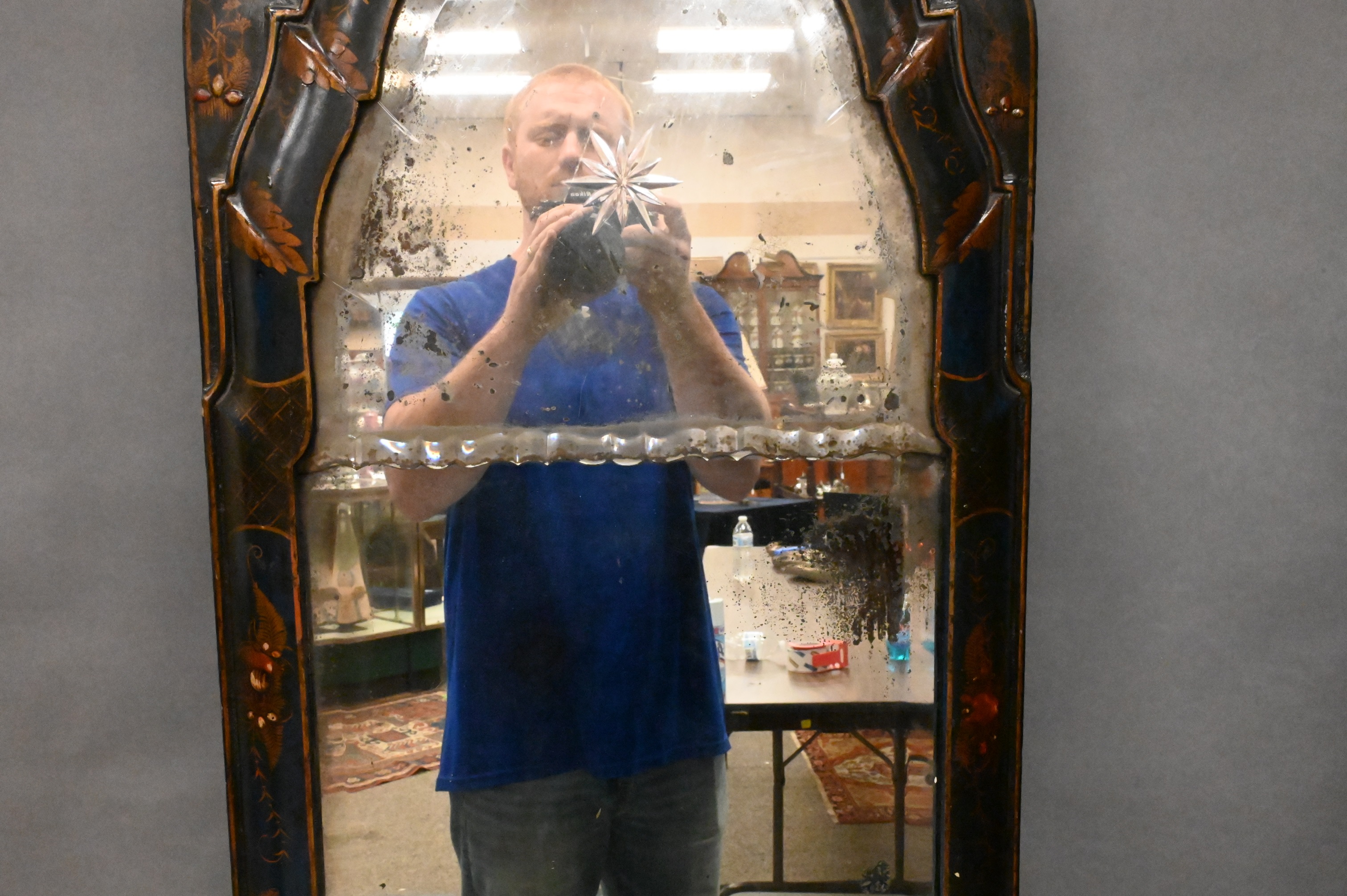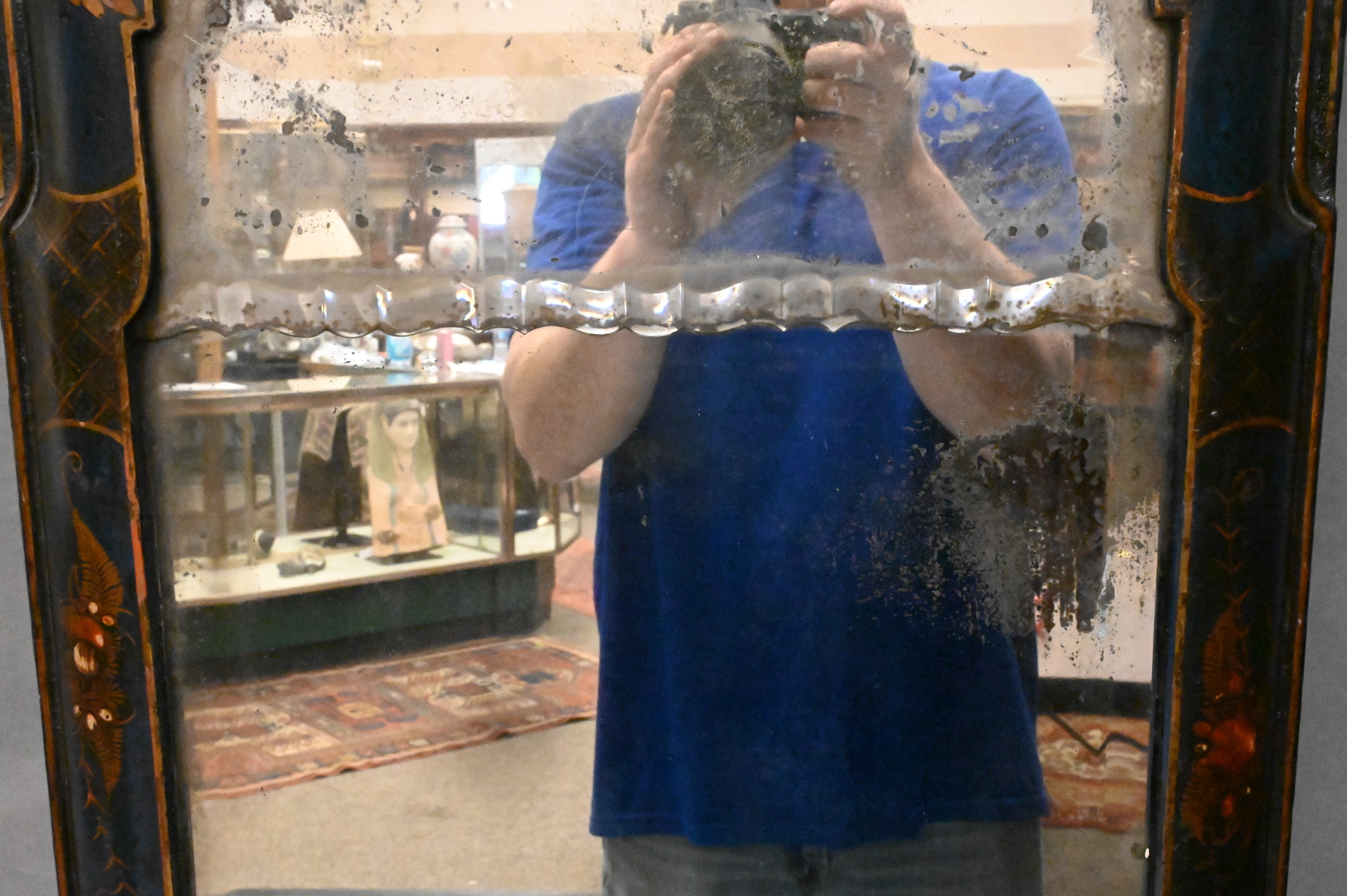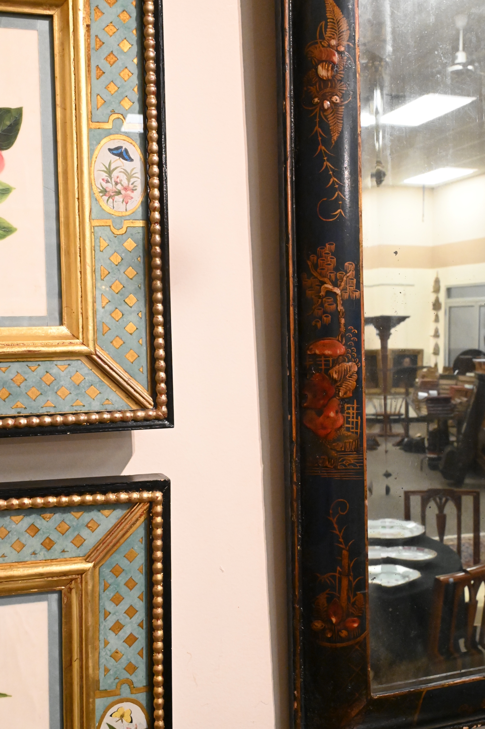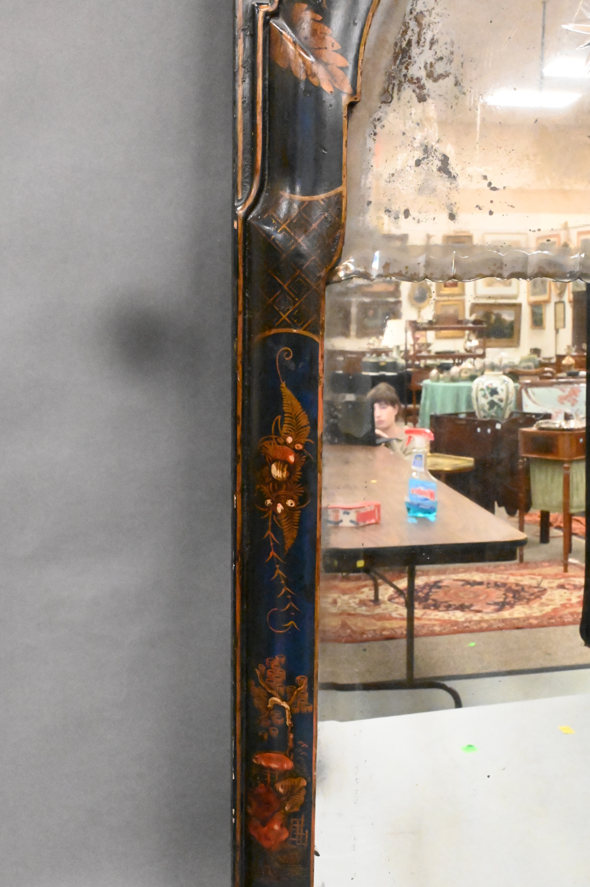 In black lacquer with chinoiserie decoration and original back, circa 1710