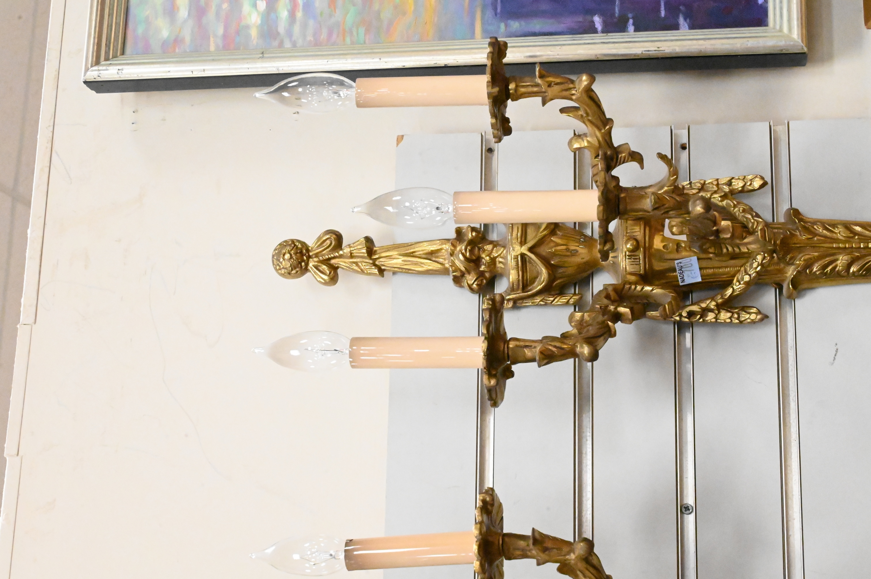 each having three lights, rose filled urns with garlands and tassels to body as well as scrolling foliate motif throughout