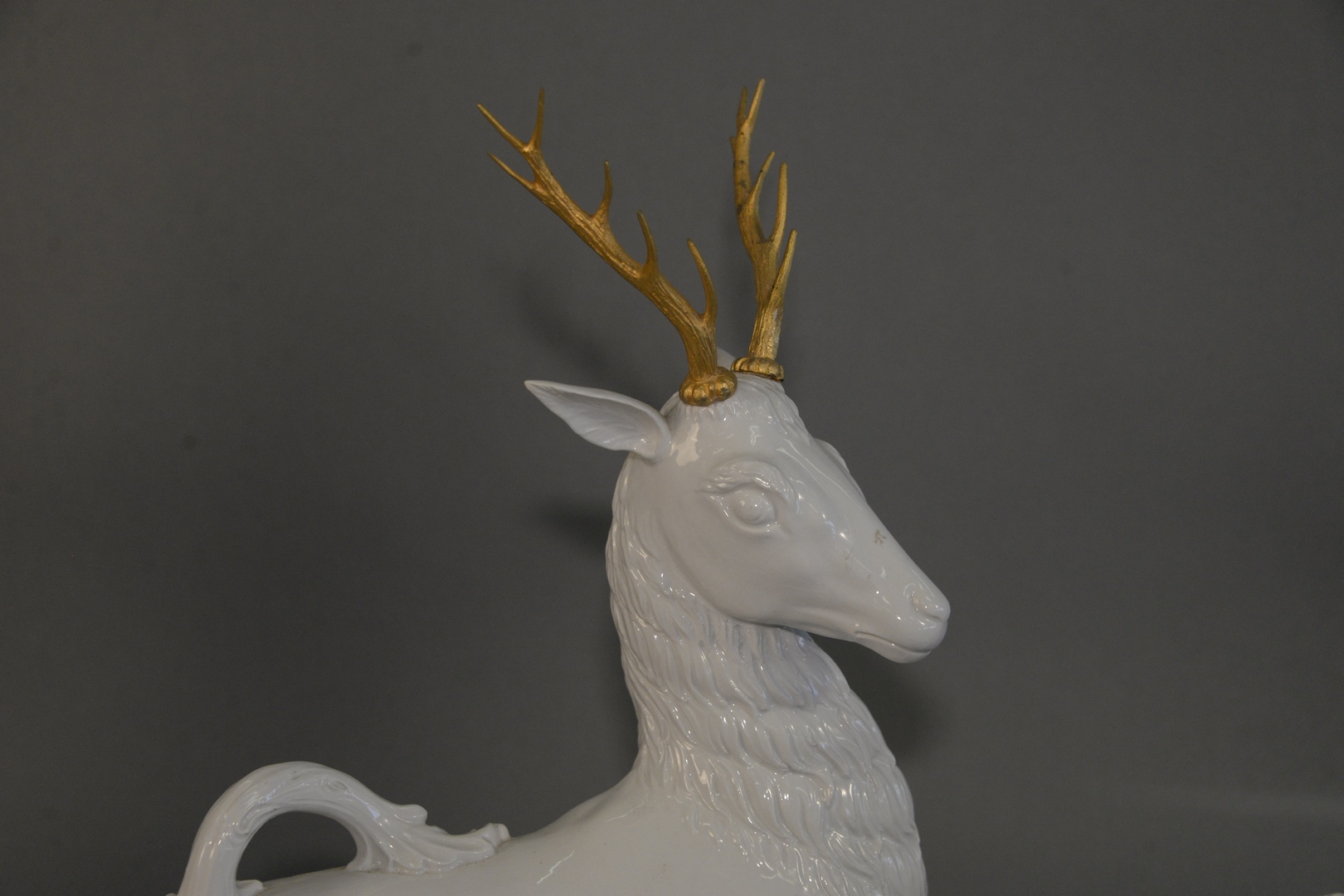 Two Large Porcelain Pieces to include a Royal Worcester covered dish with bird motif, along with a Mottahedeh porcelain stag tureen each marked to the underside height 16 inches, width 15 inches stag Provenance: The Estate of Diana Atwood Johnson