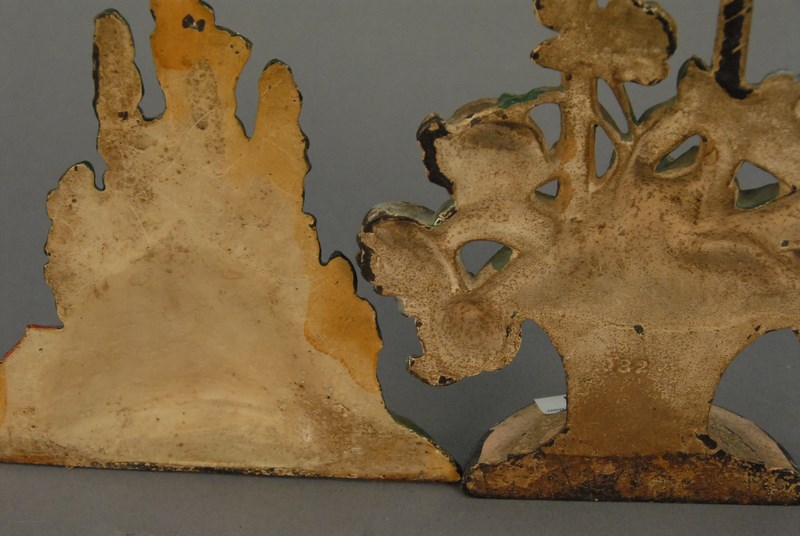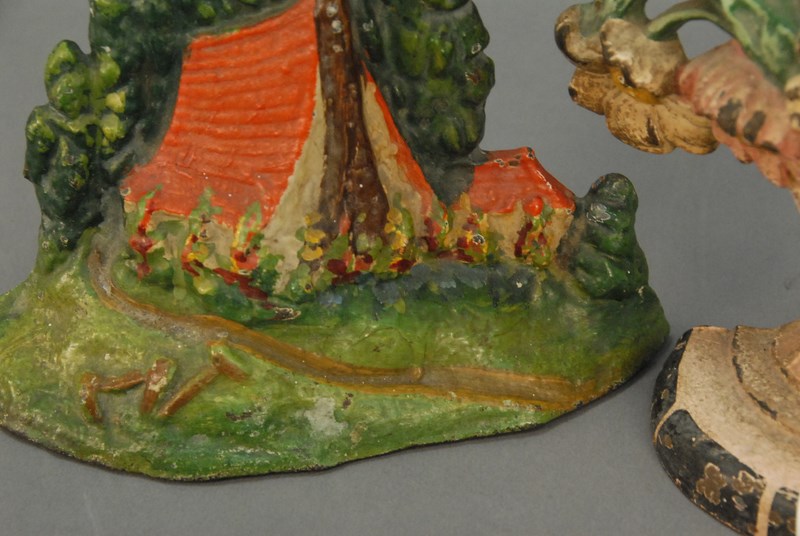 Lot 151: Two painted iron door stops, one is basket of flowers ht. 9in. and other is house in the woods ht. 8 1/2in.