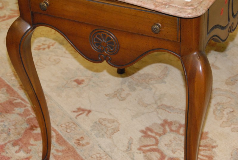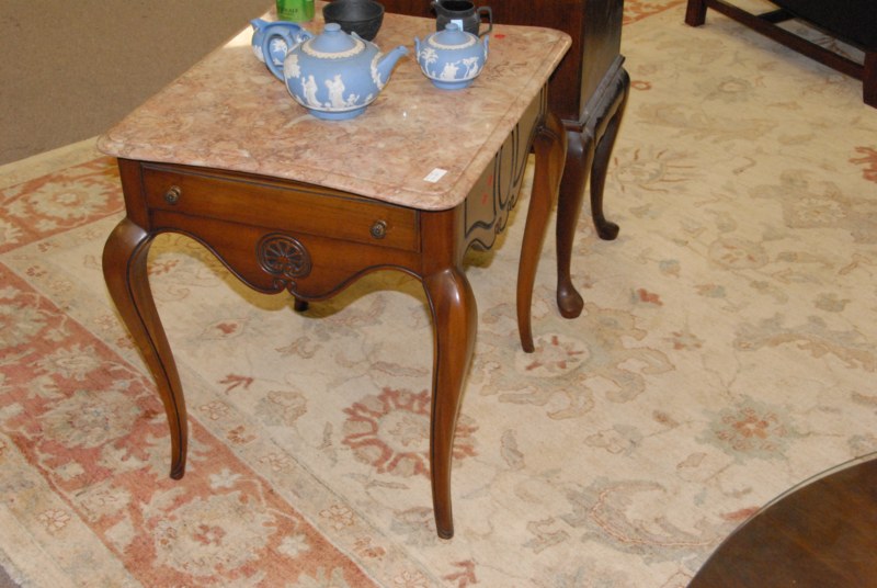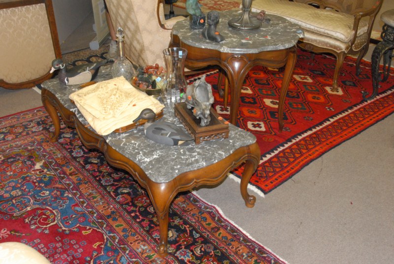 3 French style marble top tables, 2 grey marble, 1 pink marble.