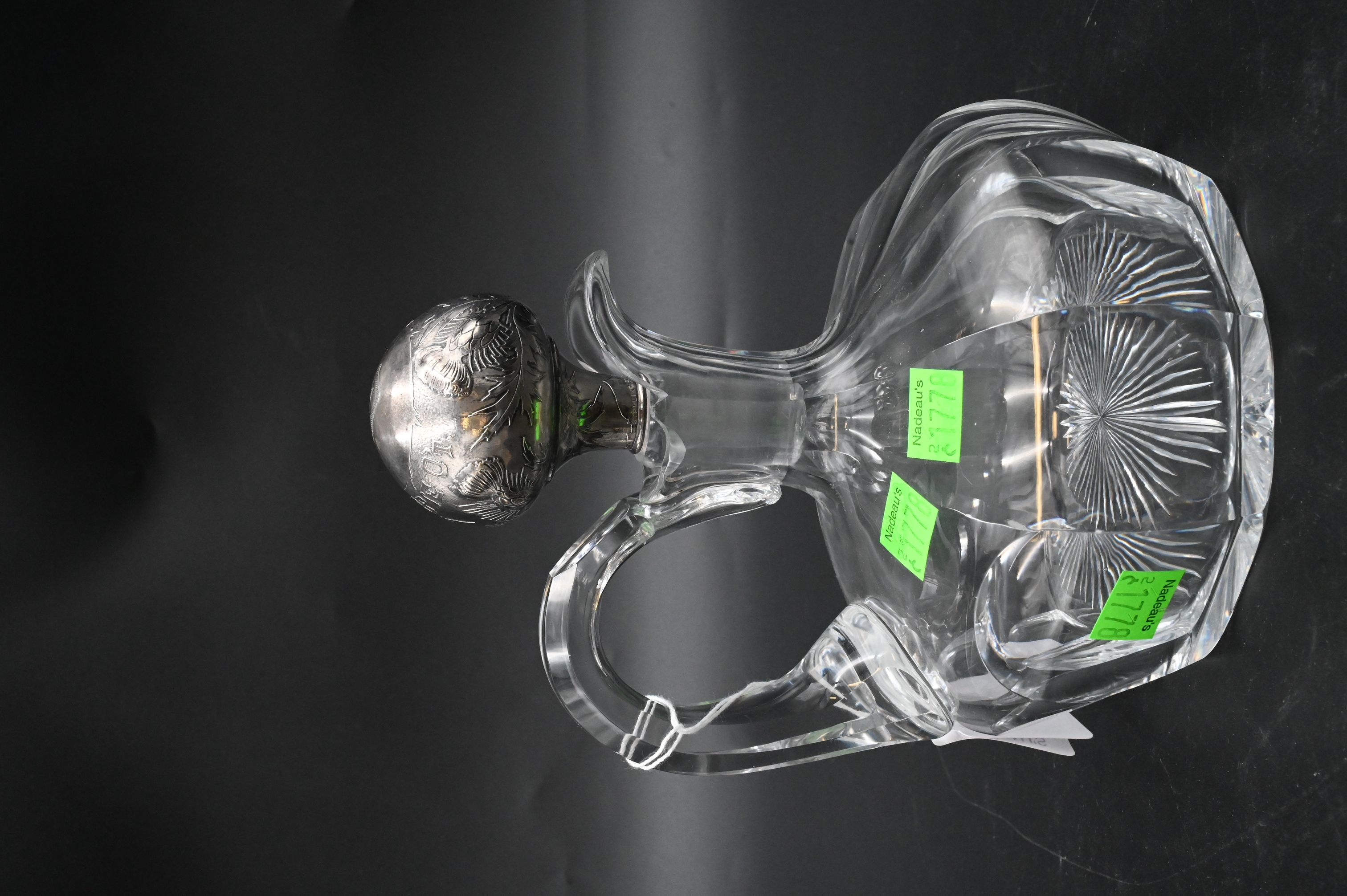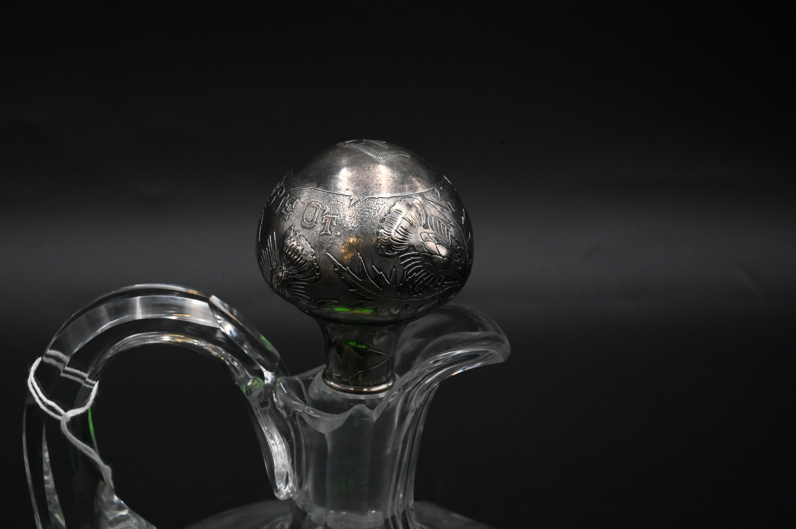 having applied scrolled handle and matching embossed sterling silver bulb shaped stopper