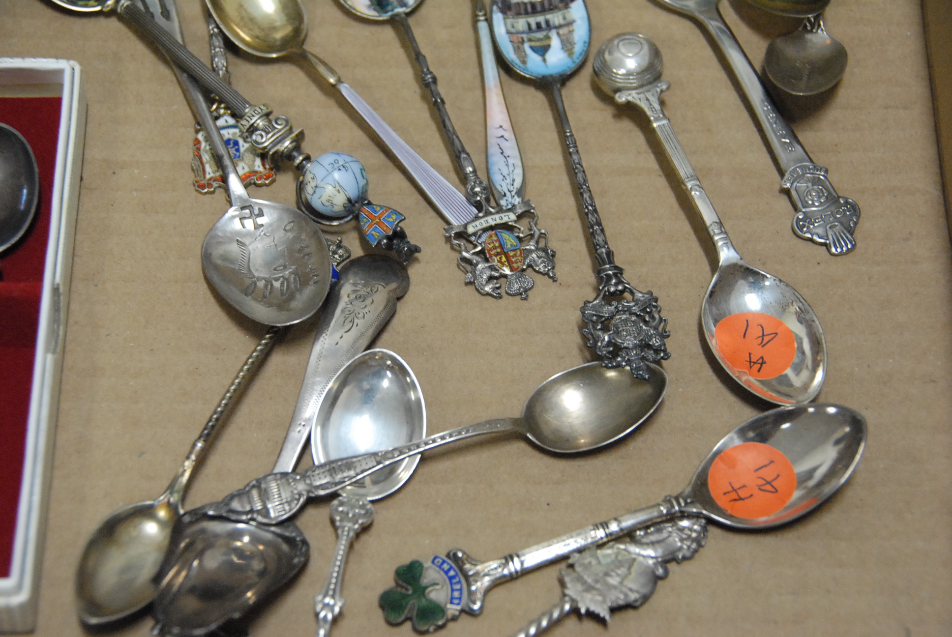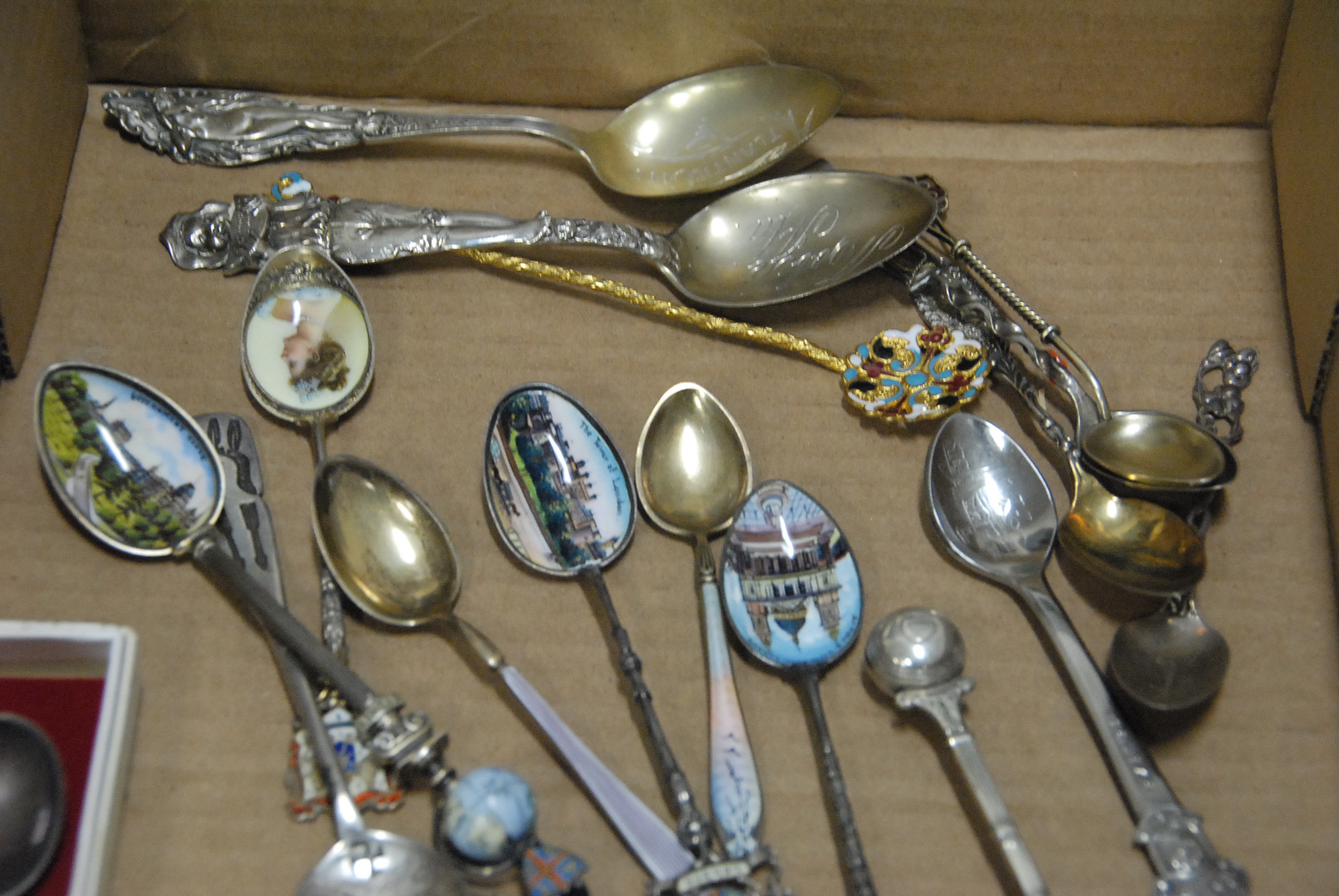 Box lot of souvenir spoons, one Navajo, six are enameled, approximately 4.5 troy oz.