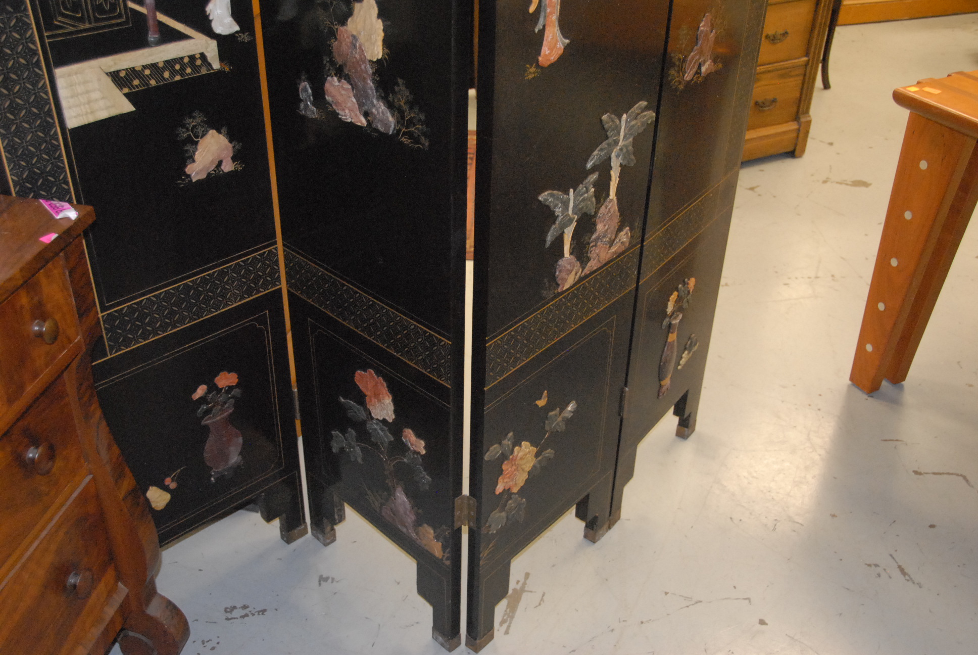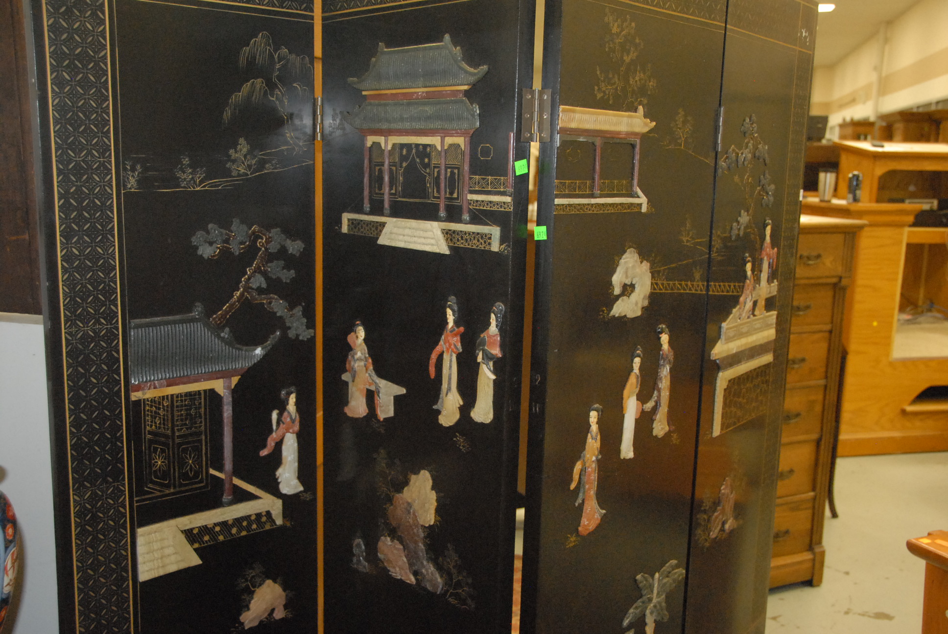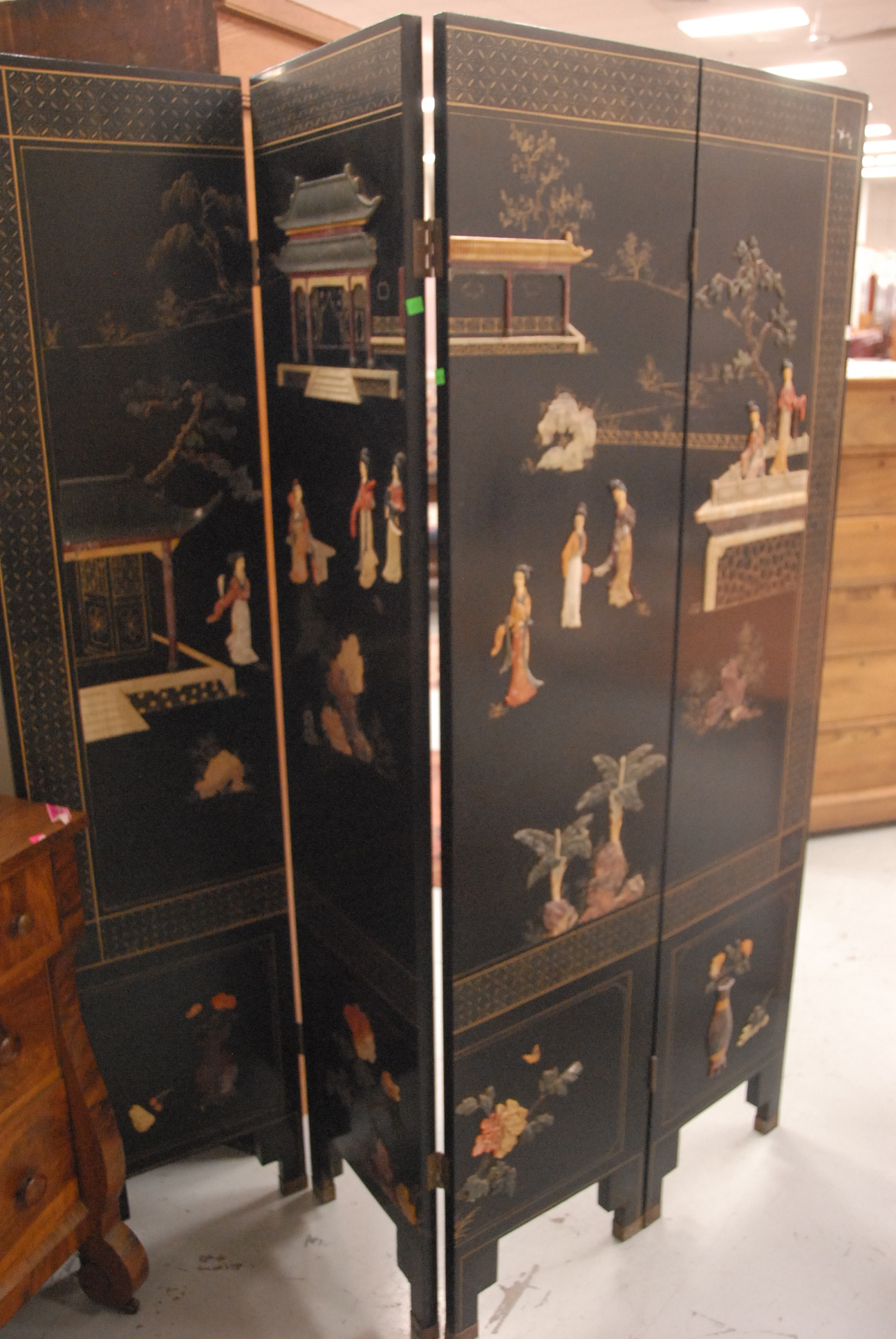 Chinese four fold screen with three dimensional soapstone designs, ht. 72 in. lg. 64 in.
