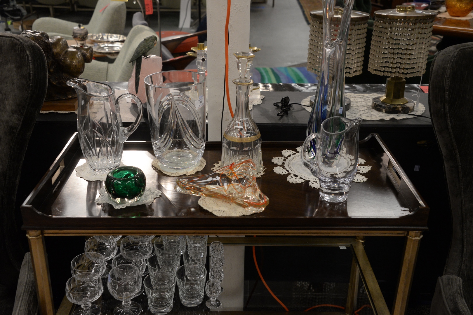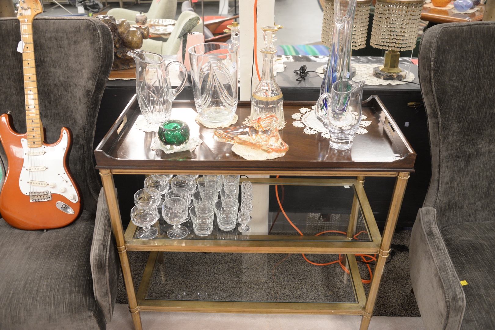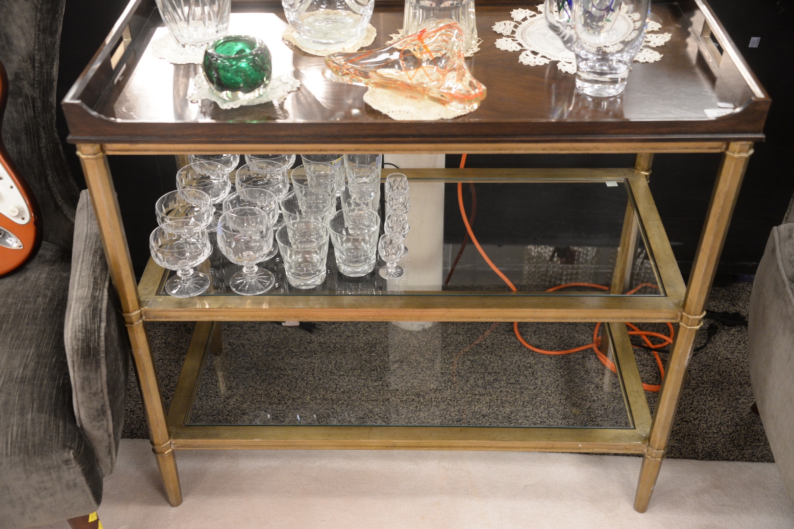Lot 152: Contemporary Three-Tier Bar Cart, mahogany tray top with metal, gold-wash legs and shelves, possibly Mr. Brown, London, height 34 inches, width 36 inches.