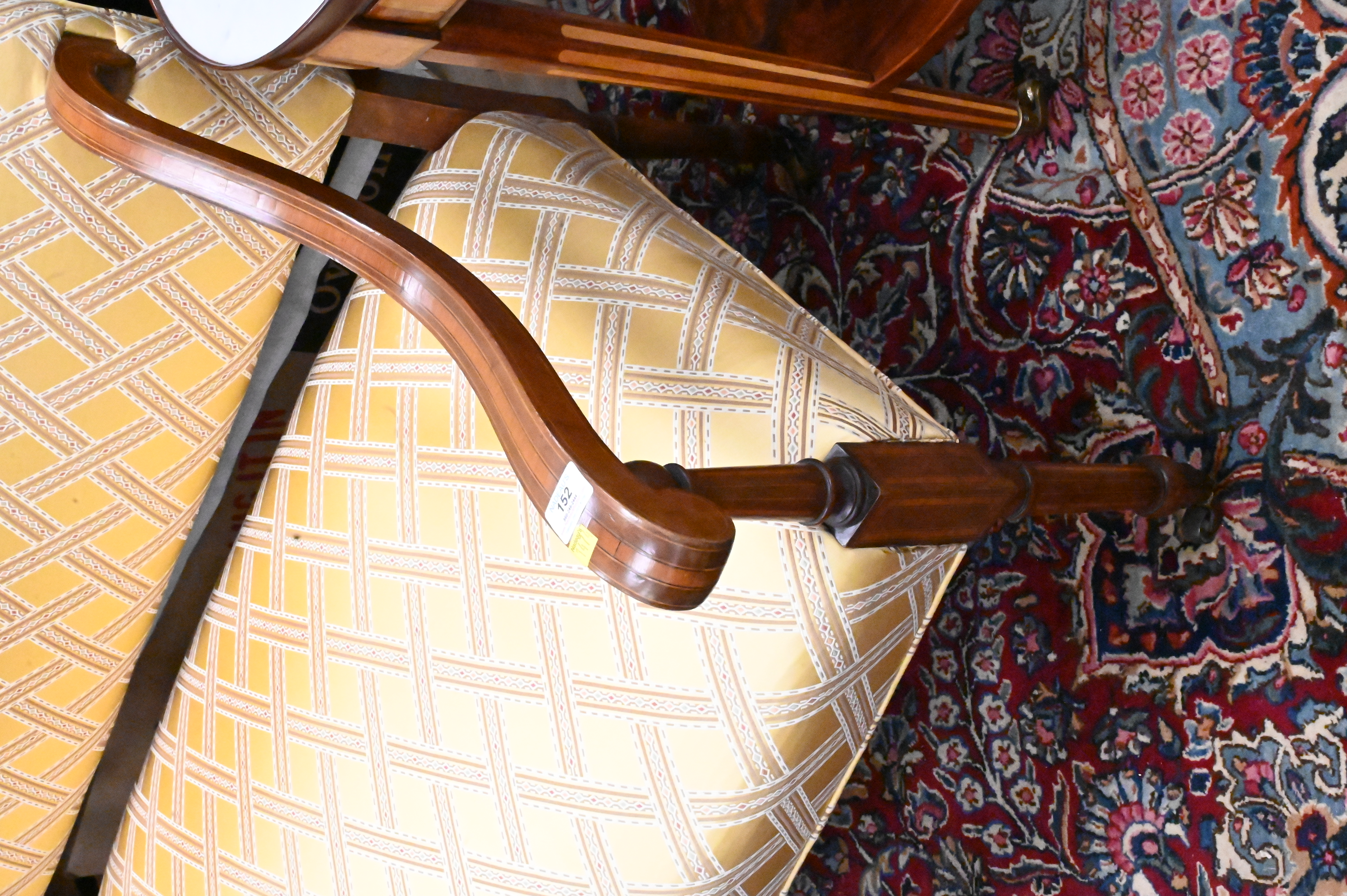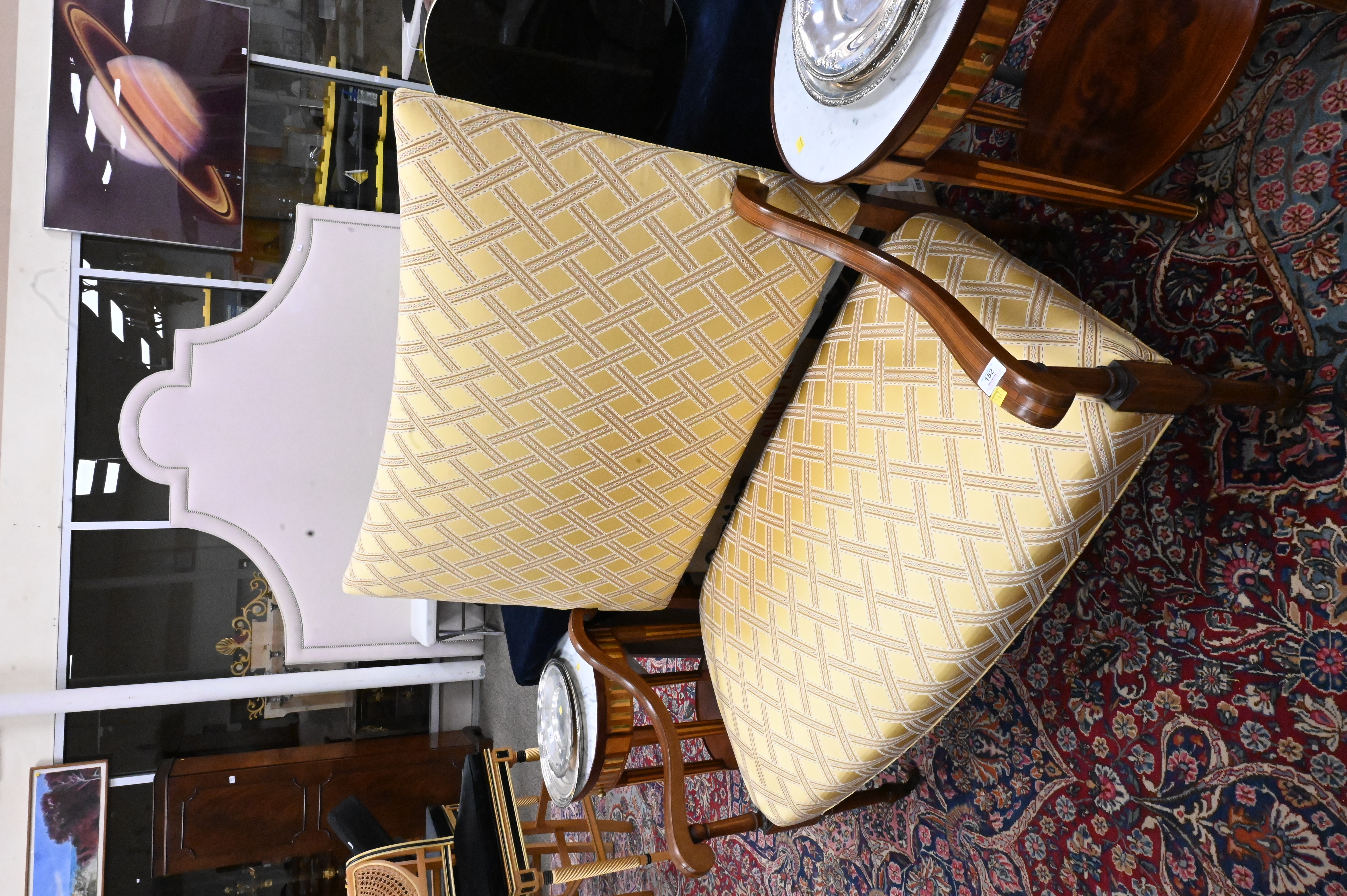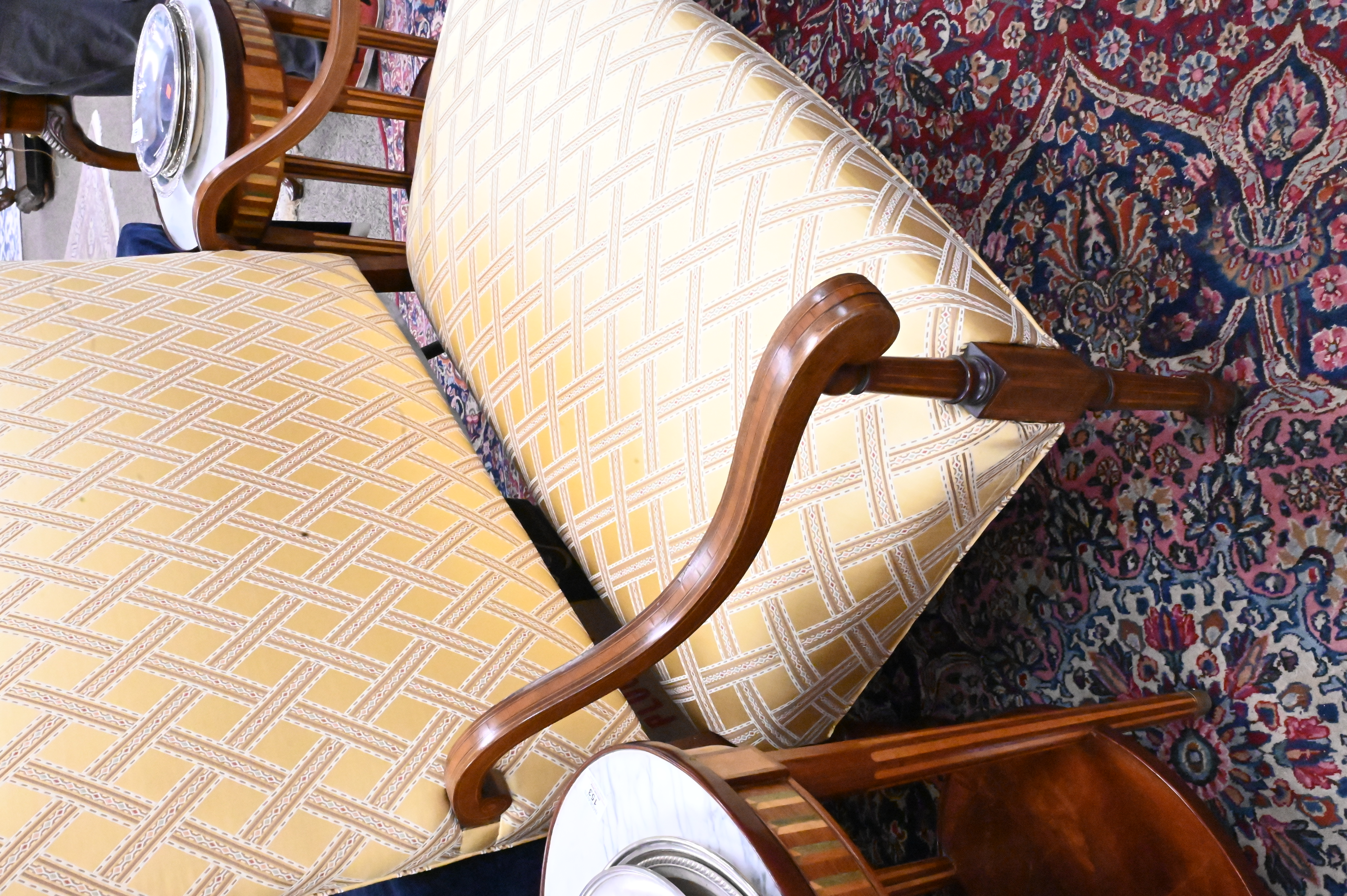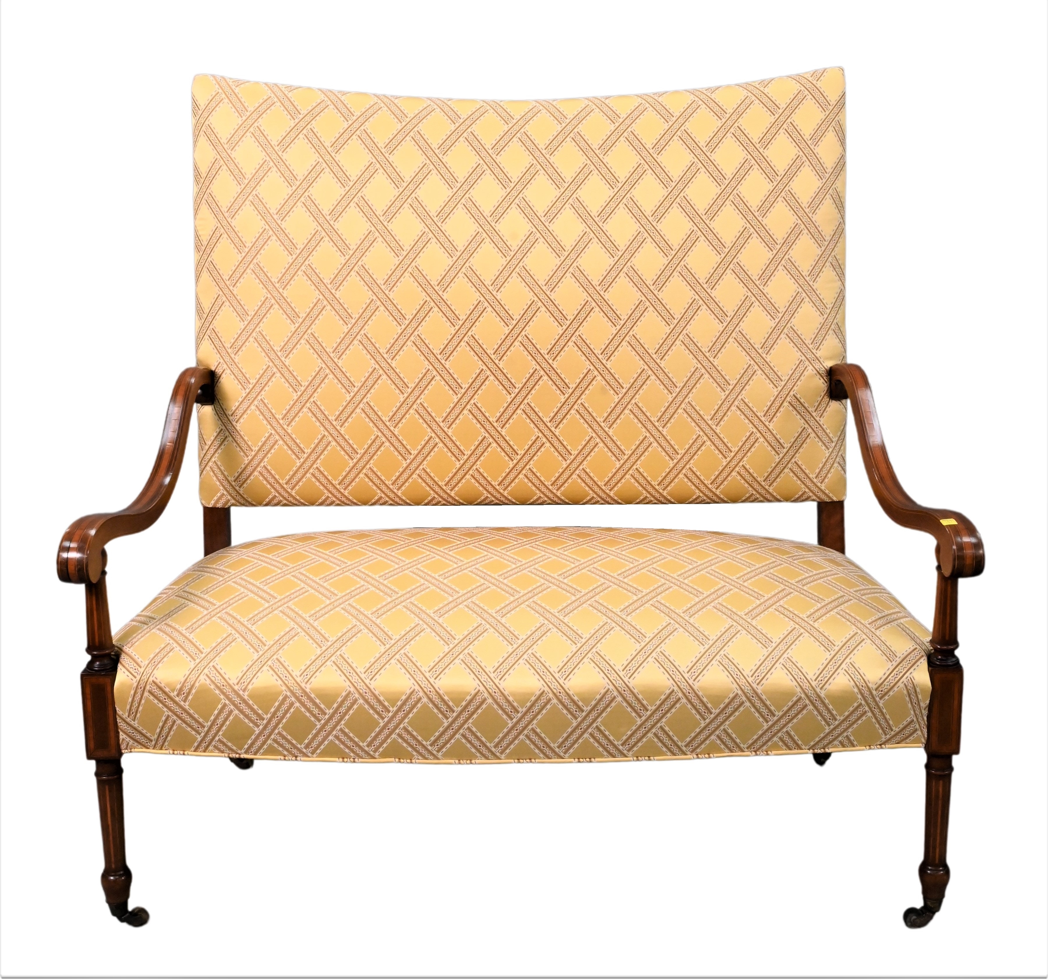 Custom Upholstered Federal Settee, having inlaid frame set on inlaid fluted legs ending in brass casters, height 47 inches, width 48 1/2 inches, depth 26 inches.