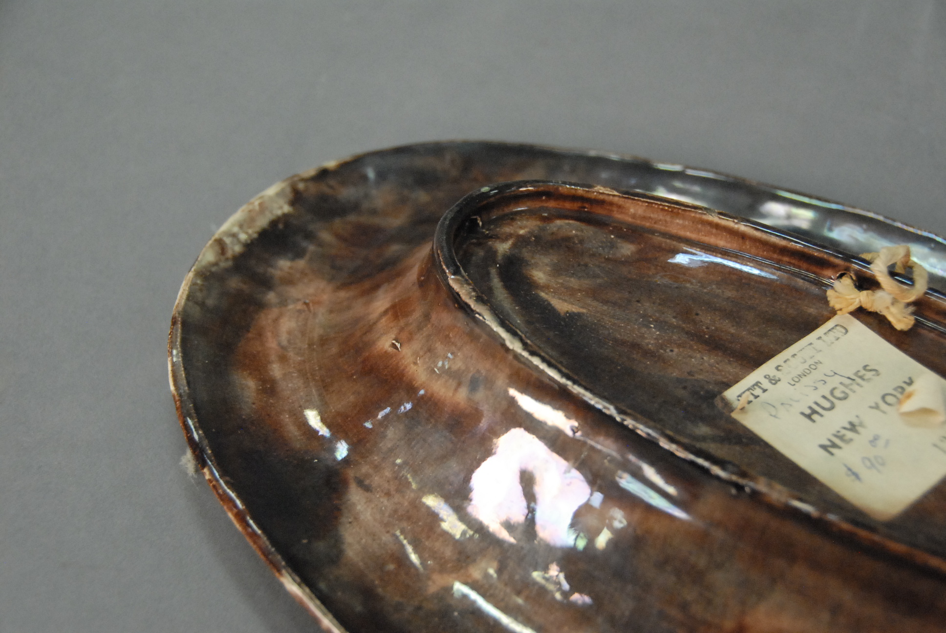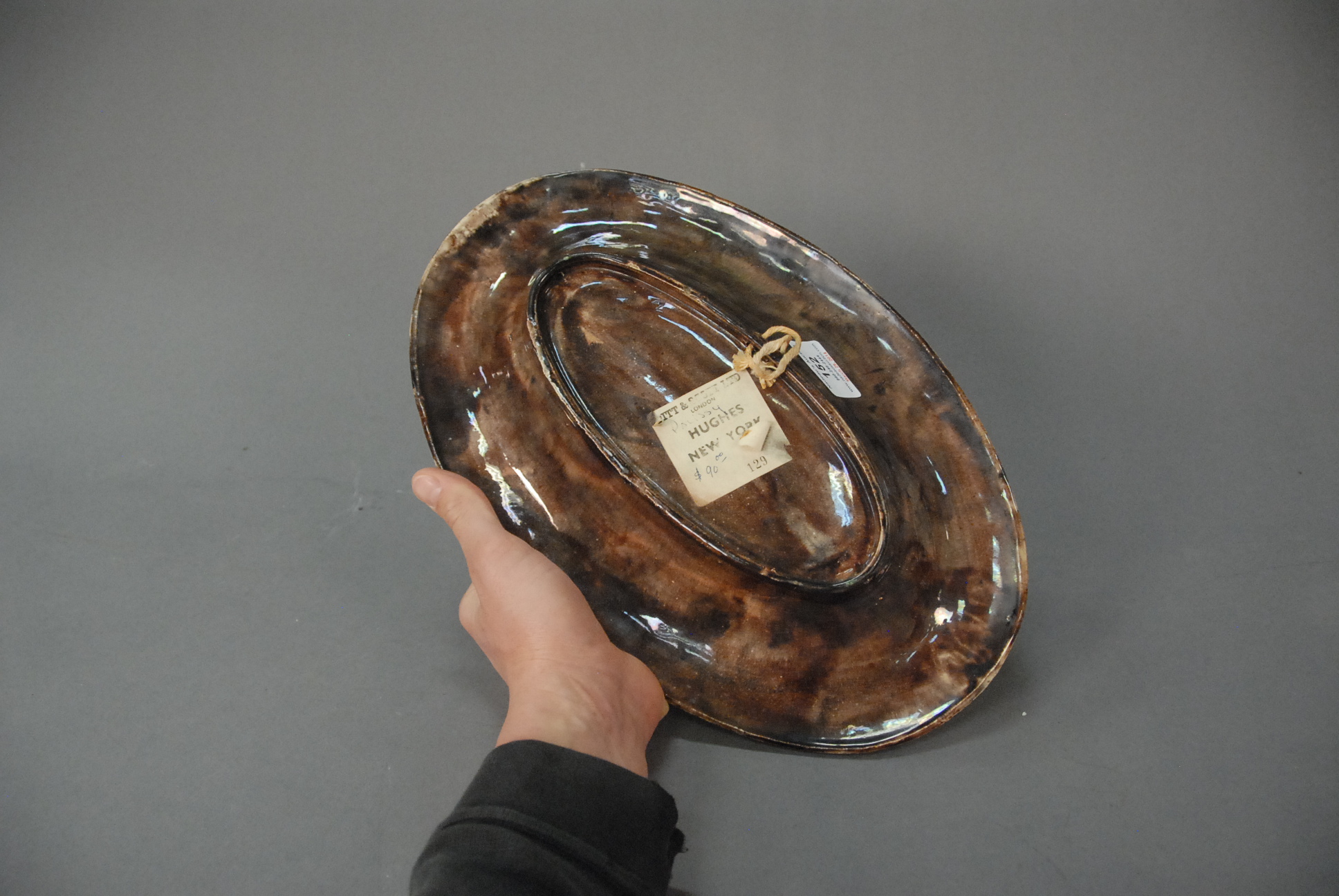 Lot 152: French Majolica Barbizet Palissy style Trompe l’Oeil oval fish platter with Hughes New York label on bottom, 19th century. 14 x 9