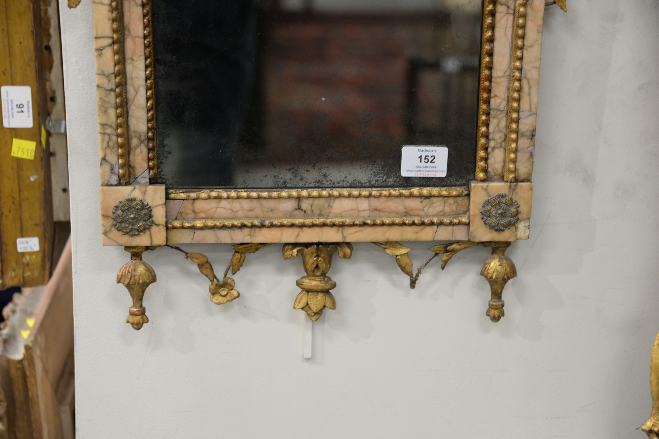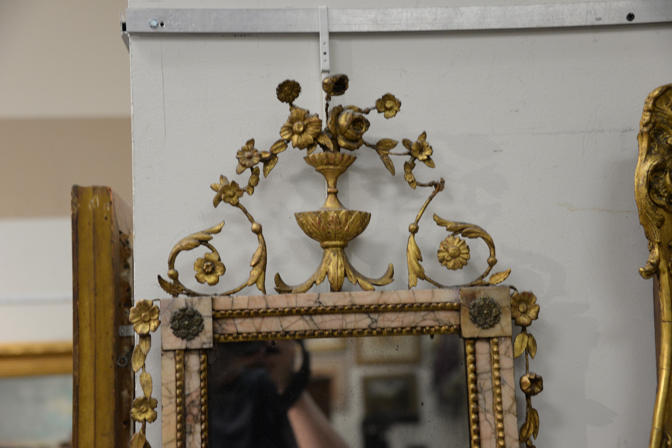 Lot 152: Gilded wood and marble veneer Bilbao mirror, flower filled urn crest flanked by scrolling floral vines, over rectangle mirror, all o…