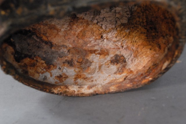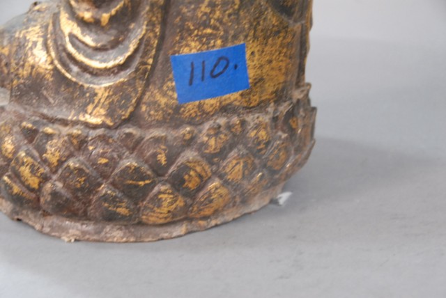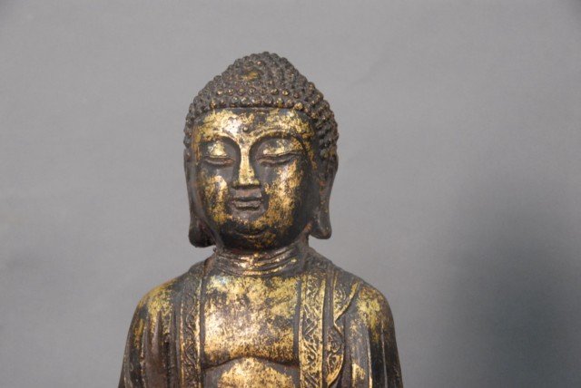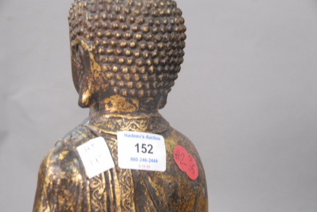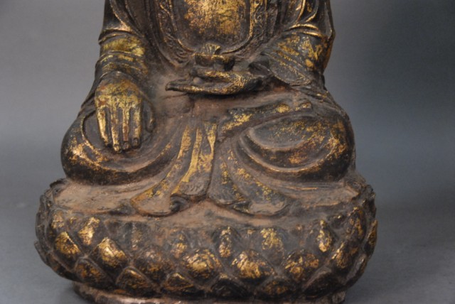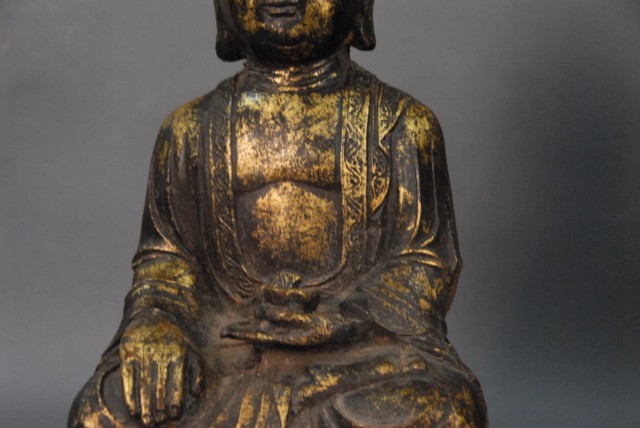 Iron sitting Buddha statue having tight. curls and long pendent earlobes sitting with his legs crossed on a lotus