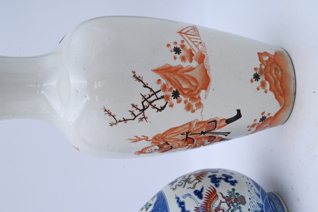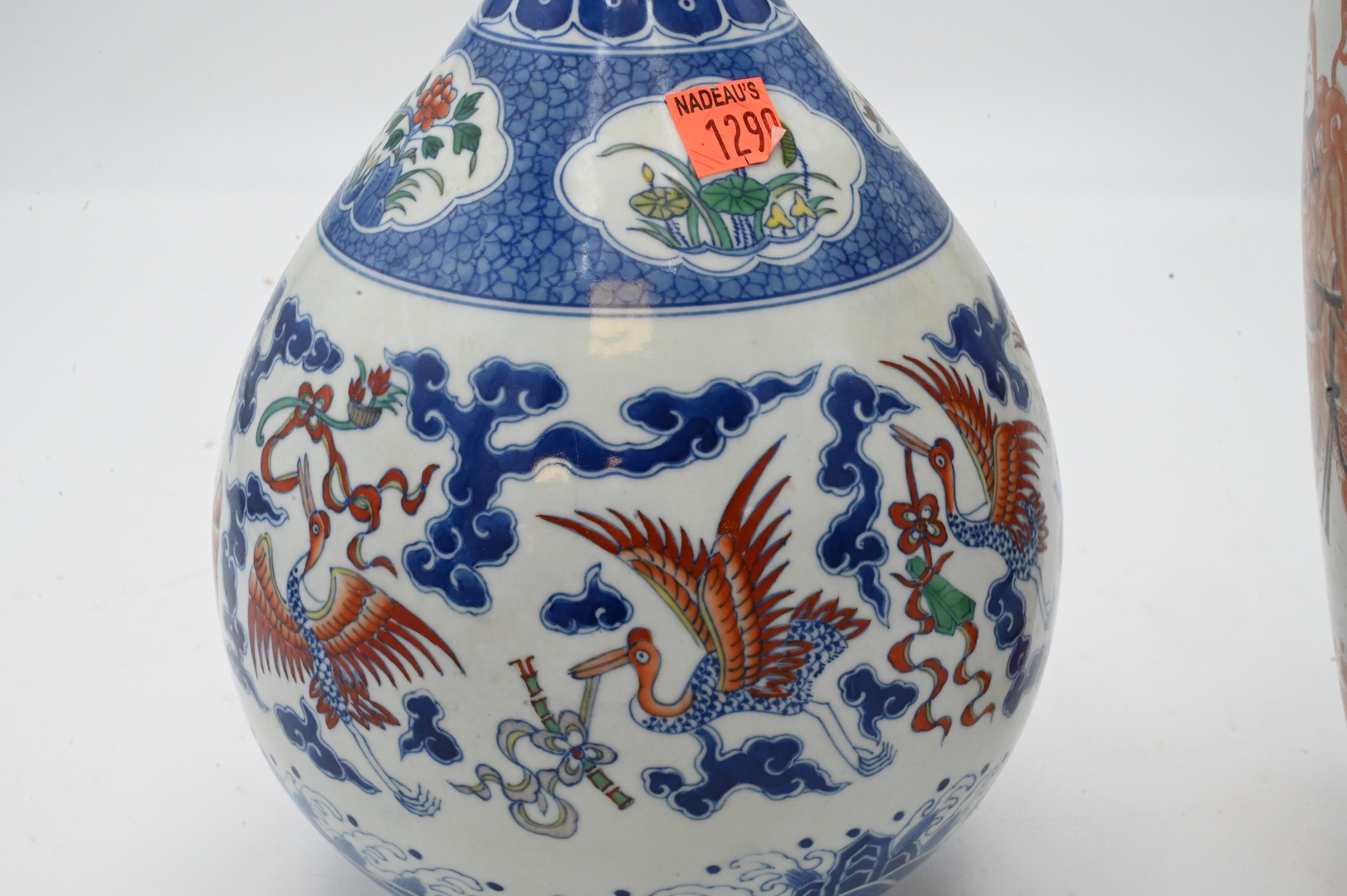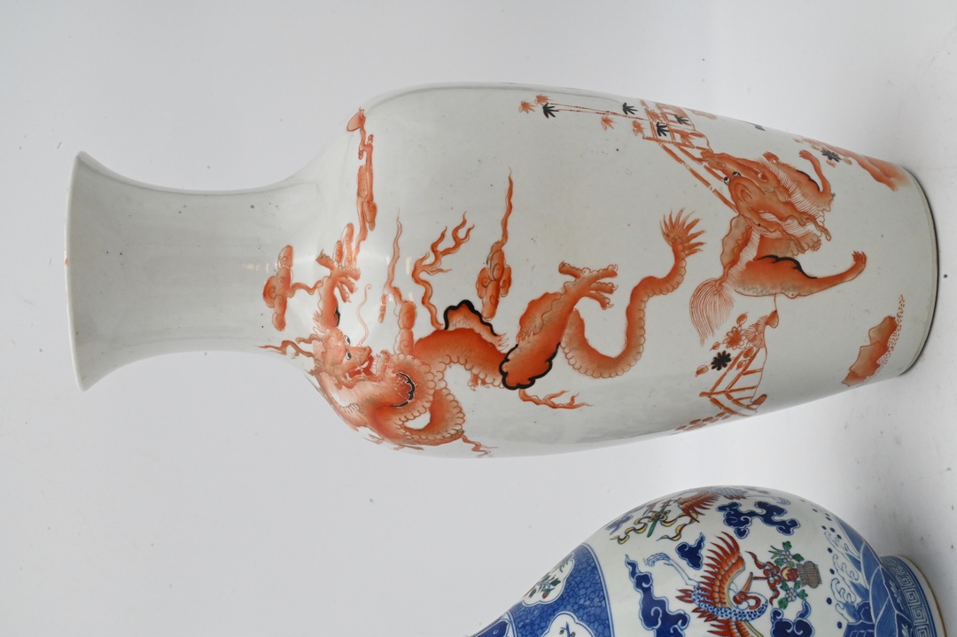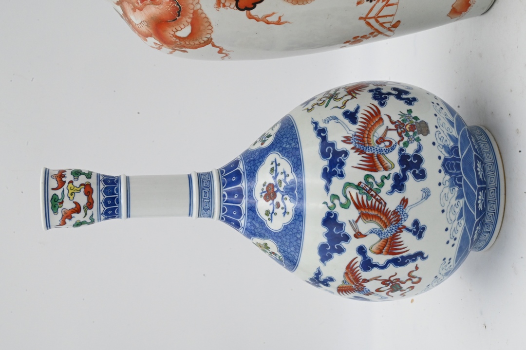 Two Chinese Porcelain Vases, to include an orange and red dragon vase, height 15 1/2 inches; along with a blue, red, and white bottle vase, height 13 3/4 inches.