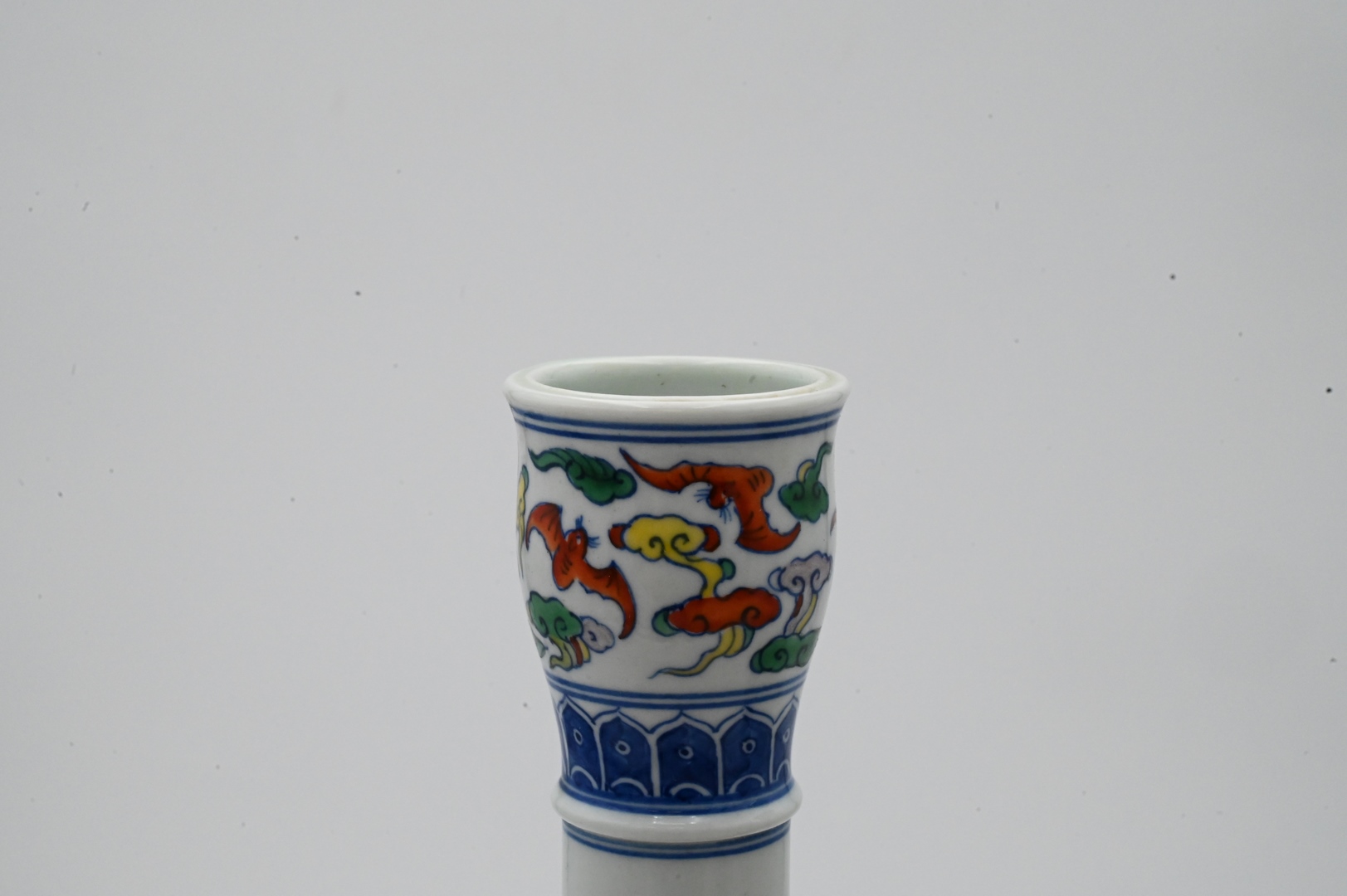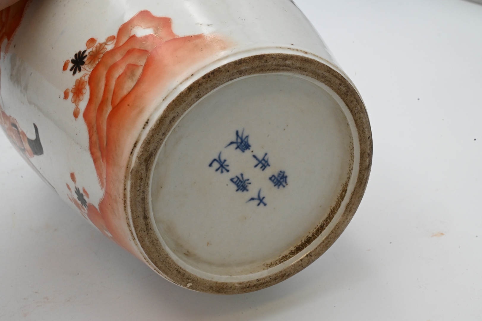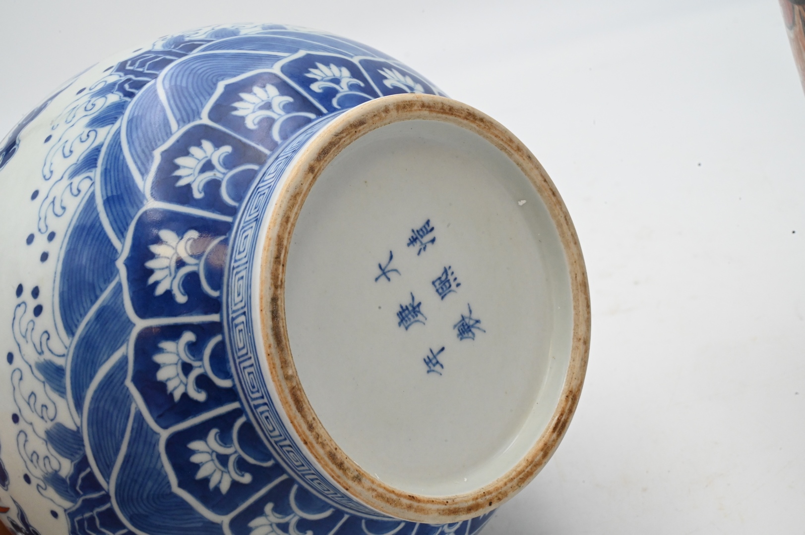 Two Chinese Porcelain Vases, to include an orange and red dragon vase, height 15 1/2 inches; along with a blue, red, and white bottle vase, height 13 3/4 inches.