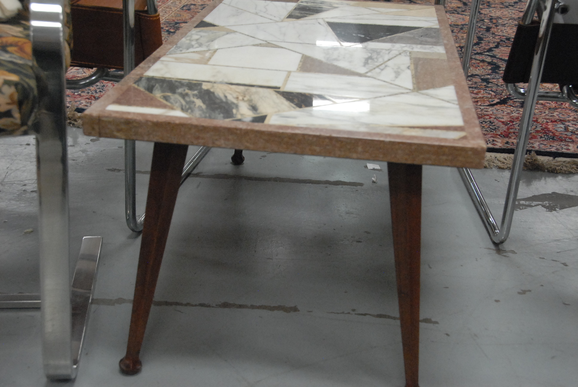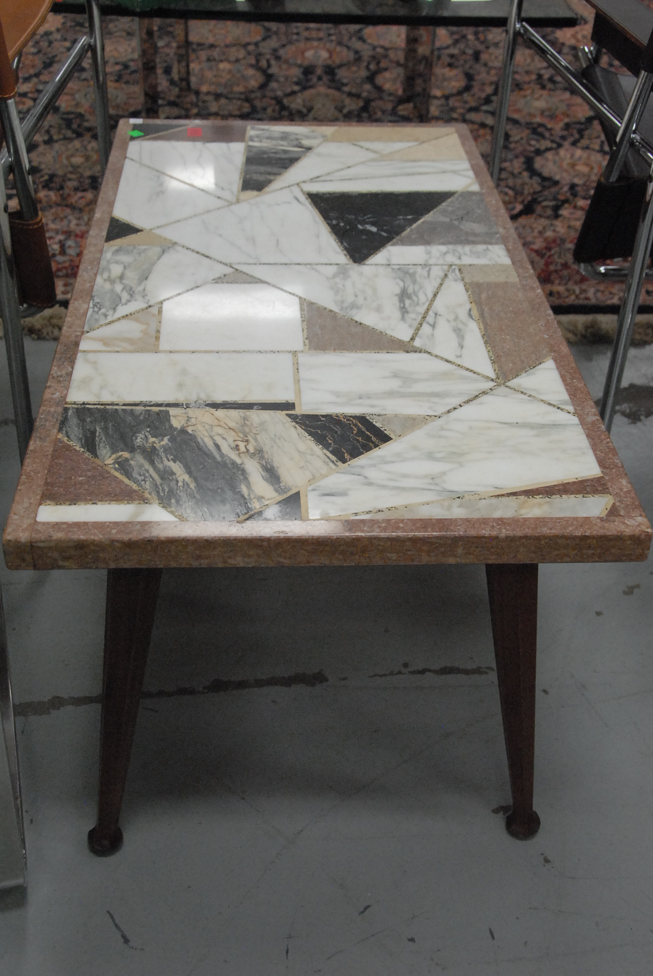 Lot 152: Mid-Century Modern coffee table with marble top of inset geometrical shaped marble of different colors supported by four, shaped wal…