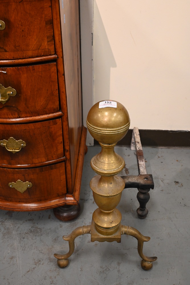 Lot 152: Pair of Federal Brass Andirons having cannonball tops on spurred legs and ball feet probably Boston circa 1830 missing log stops height 21 1/2 inches