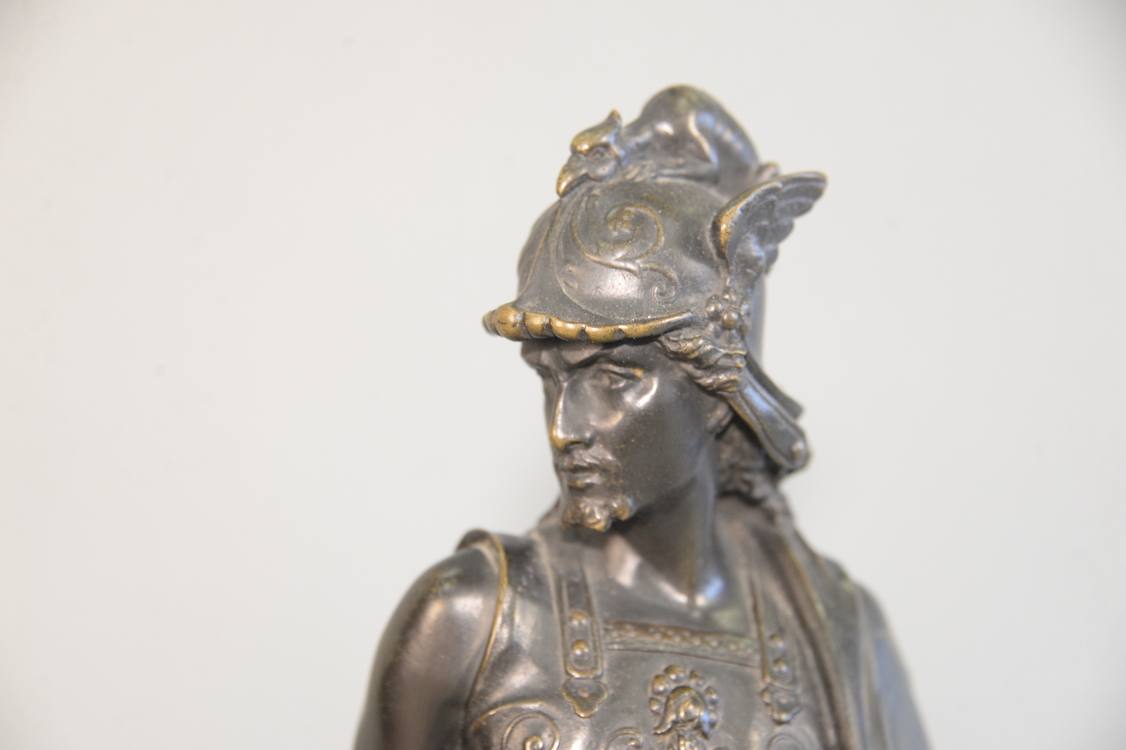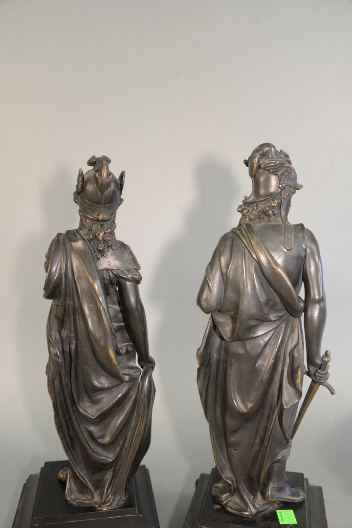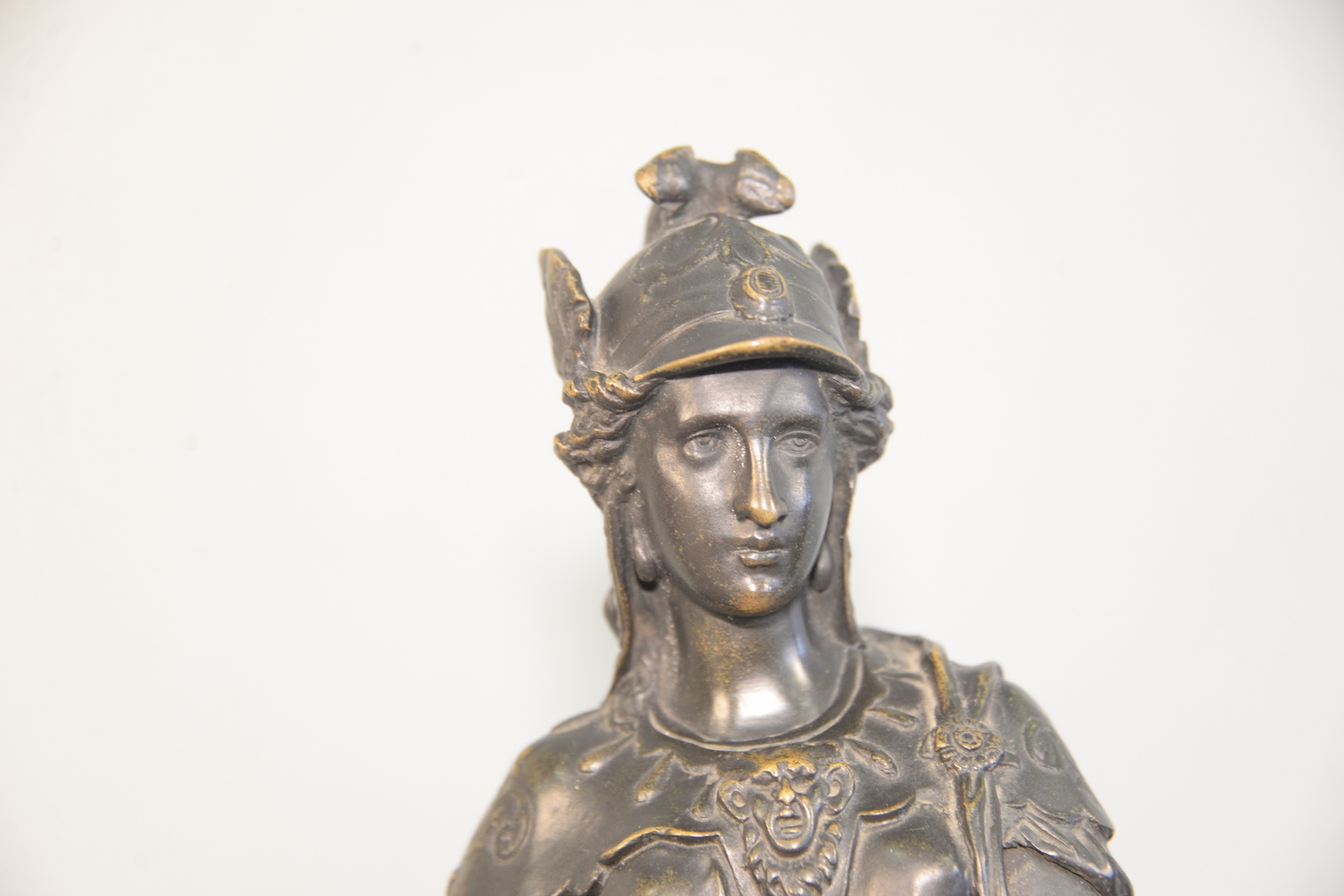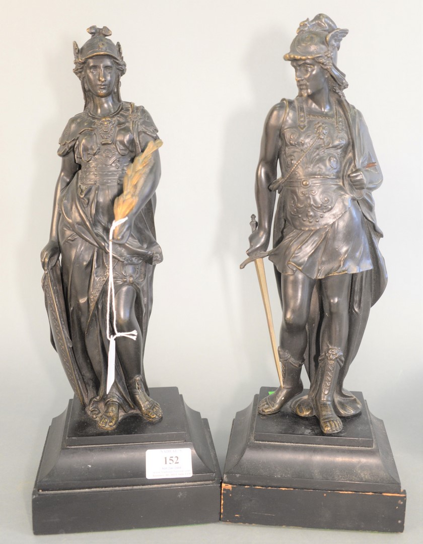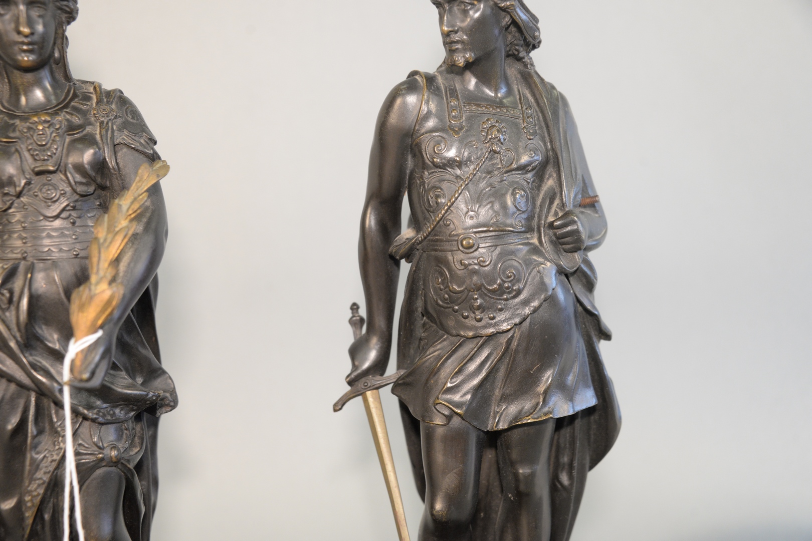 Lot 152: Pair of Greek Goddess Bronze Figures man holding a sword, and woman holding wreath, standing on granite bases total height 16 1/4 in…