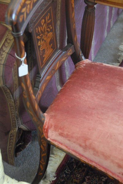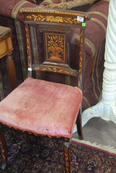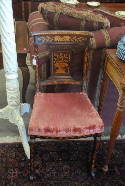 Lot 152: Pair of marquetry inlaid side chairs repairs.