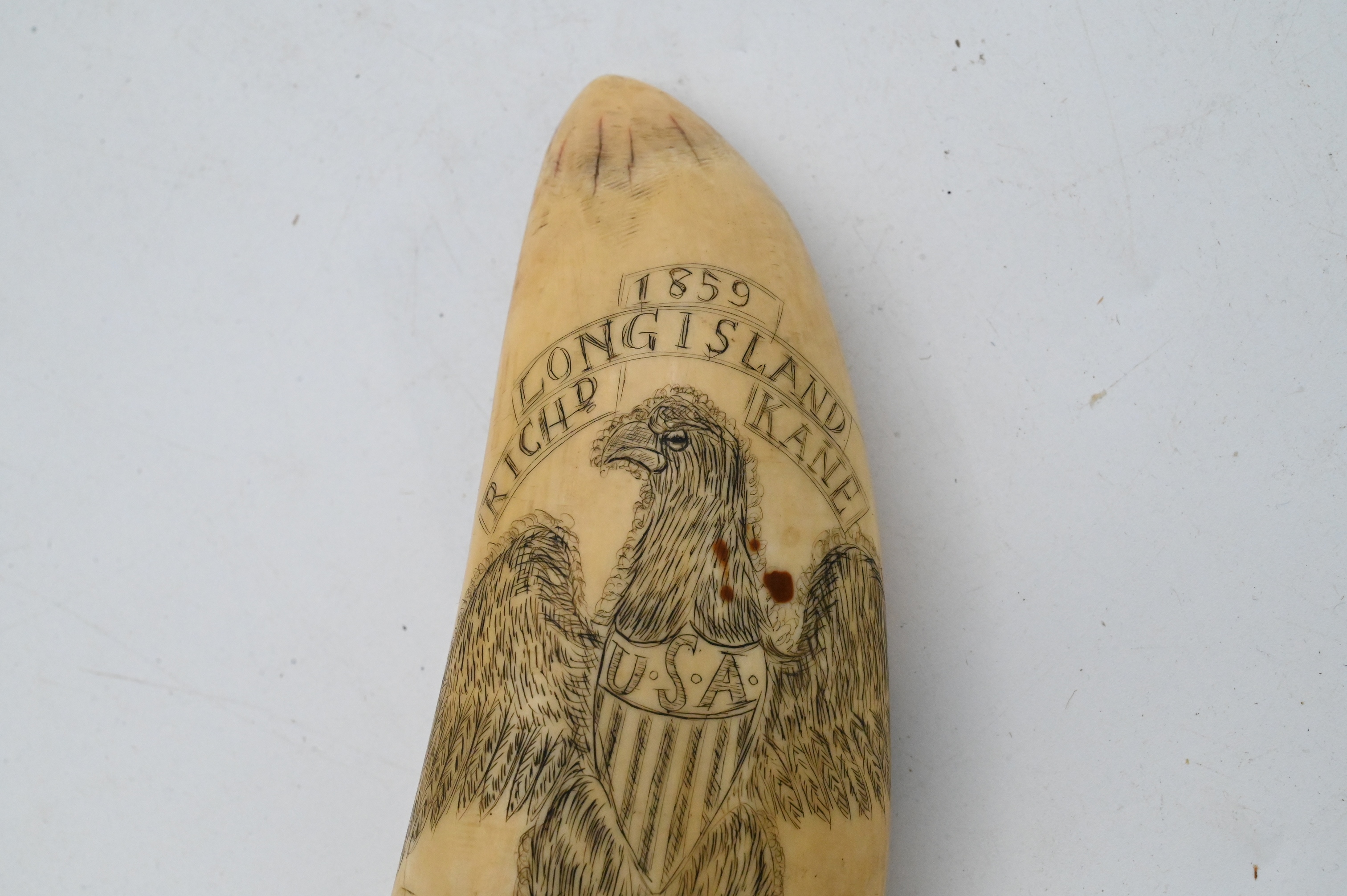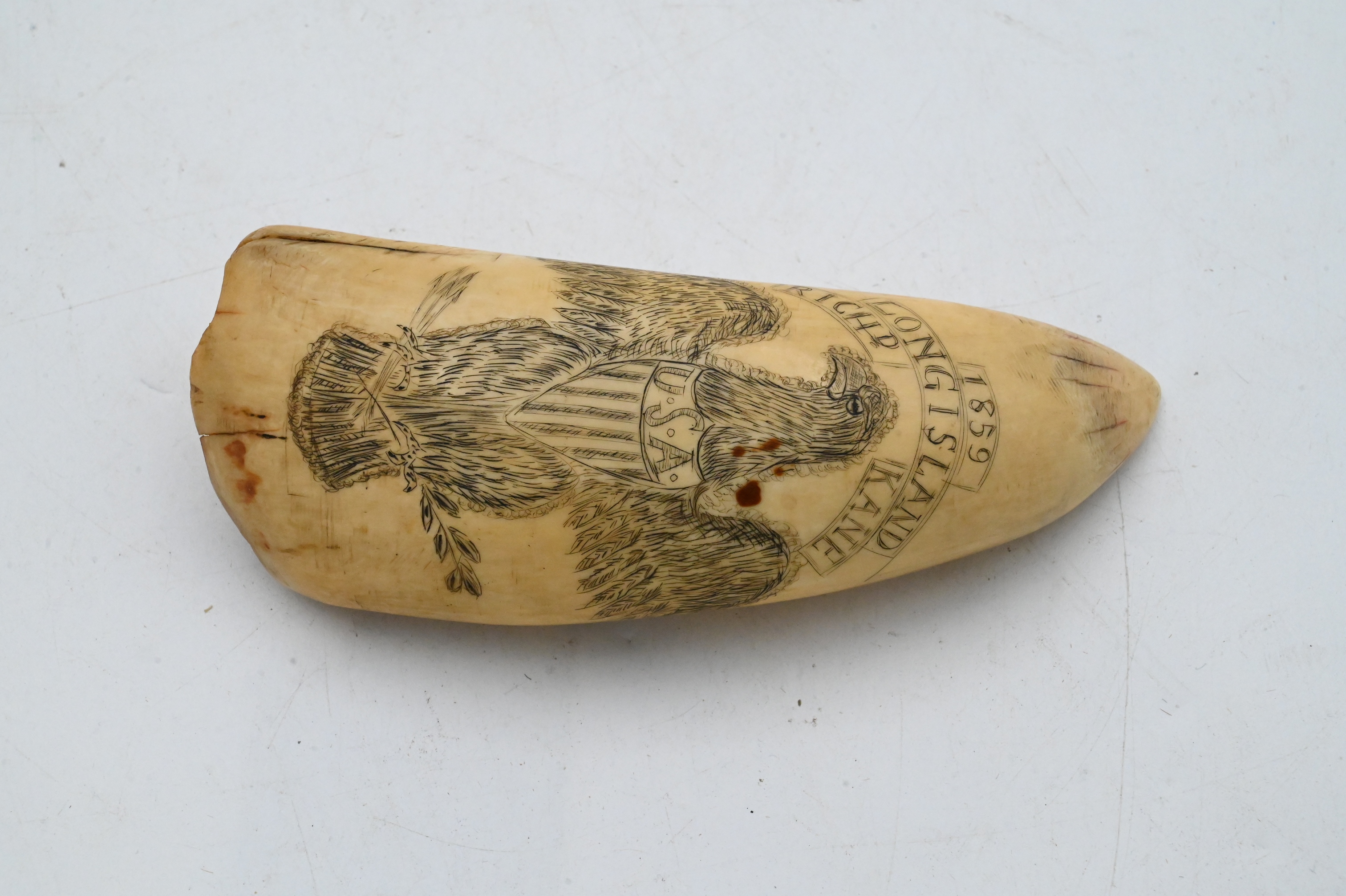 A finely engraved scrimshaw whale’s tooth depicting a spread-winged American eagle with shield marked “U.S.A.,” clutching arrows and an olive branch. Above inscribed “1859 / LONG ISLAND / RICHD KANE.” Warm age patina throughout.