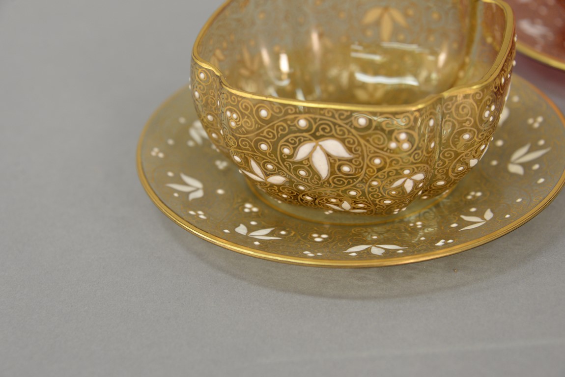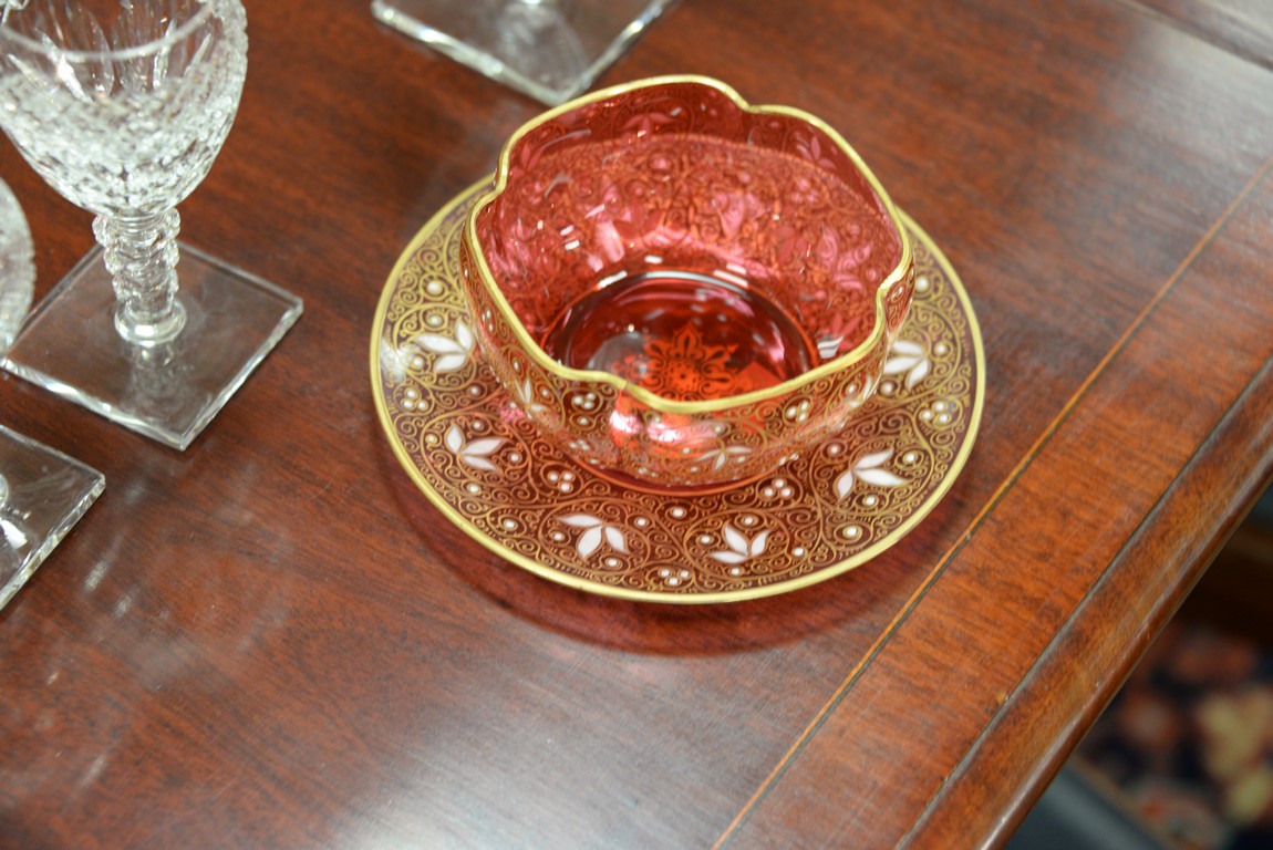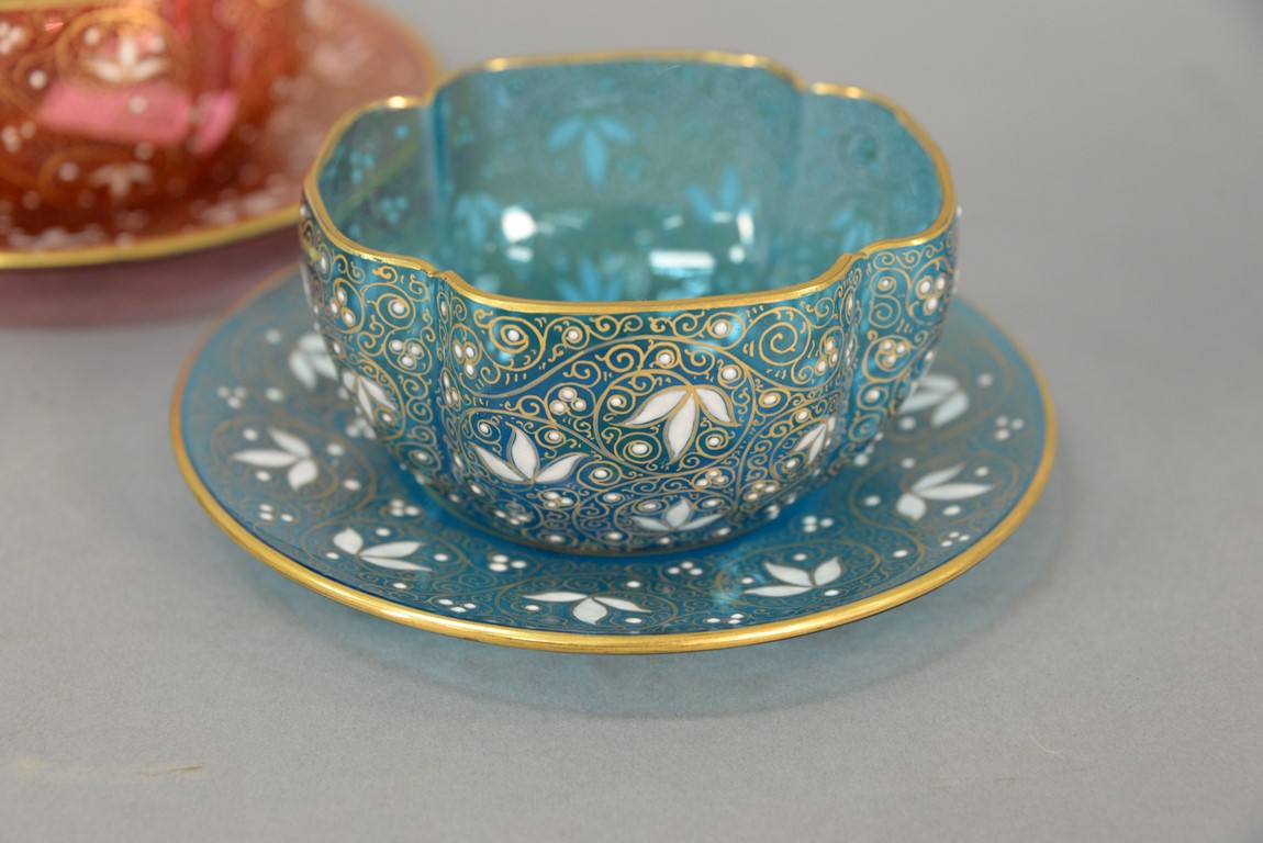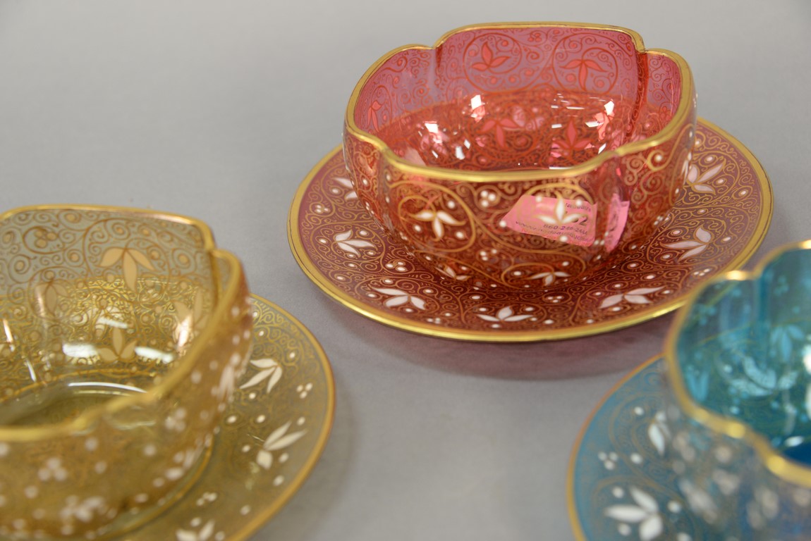 Lot 152: Set of twelve Moser shaped finger bowls and underplates with floral enameling, three red, five blue, and four gold