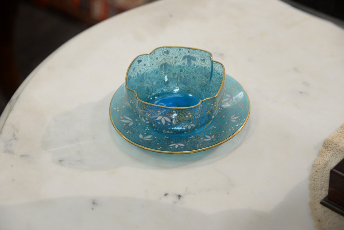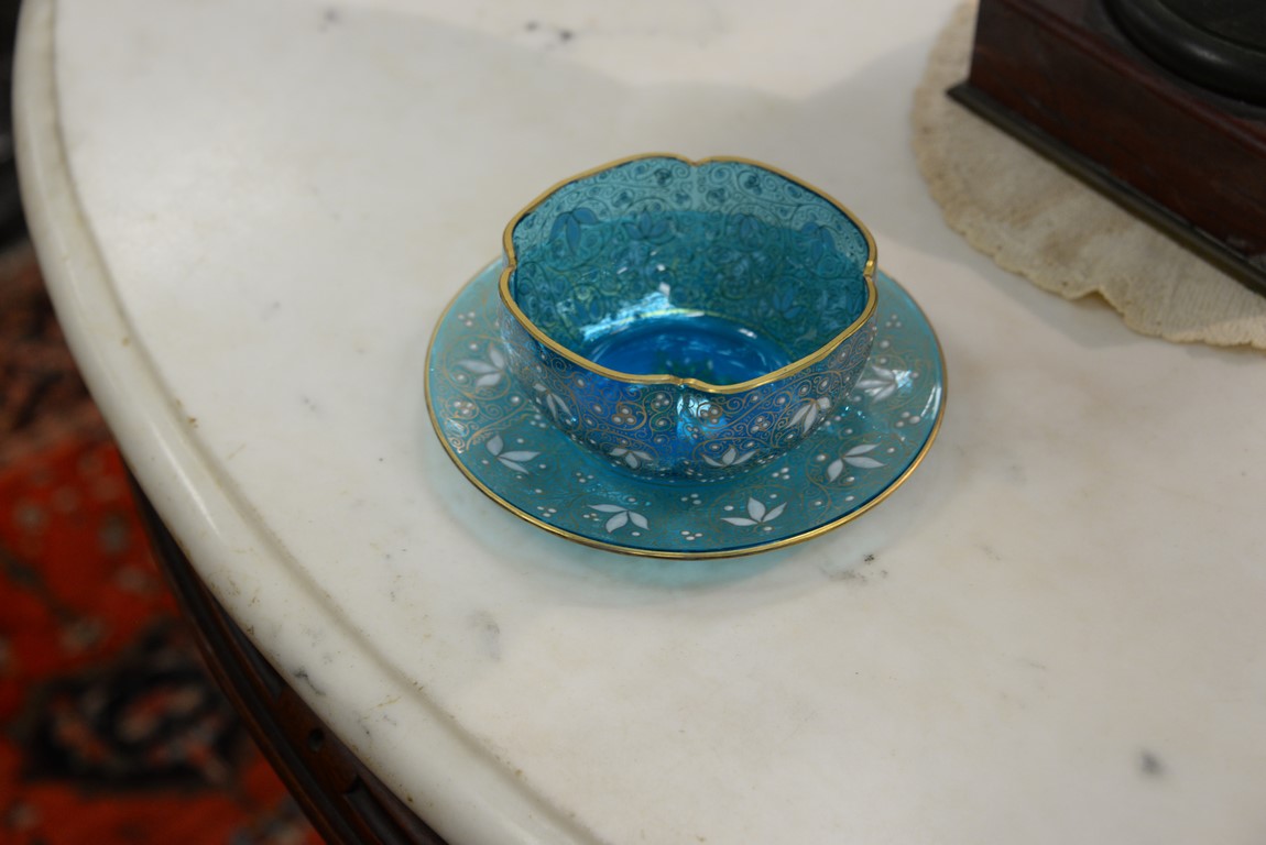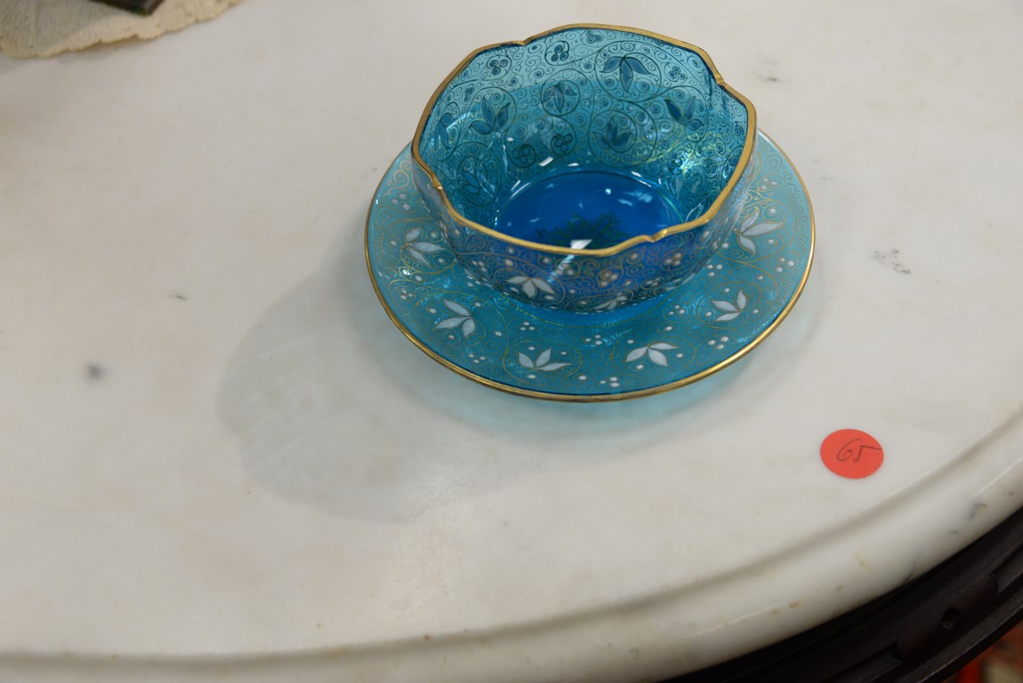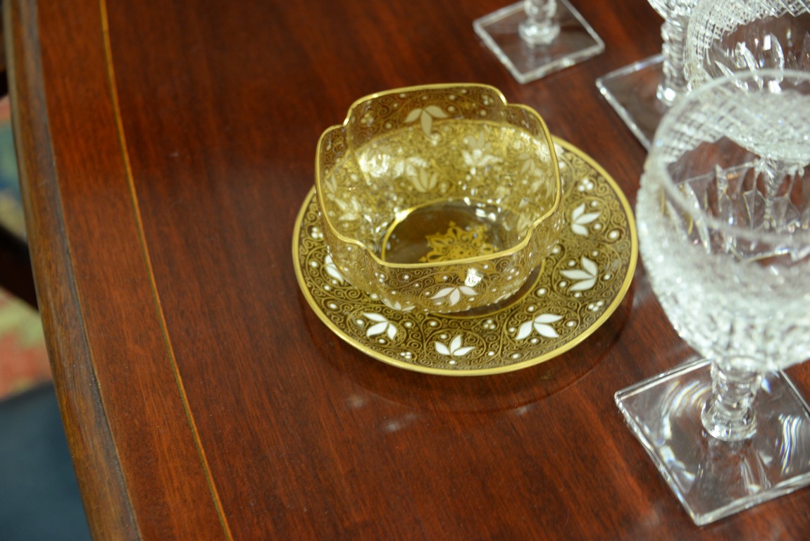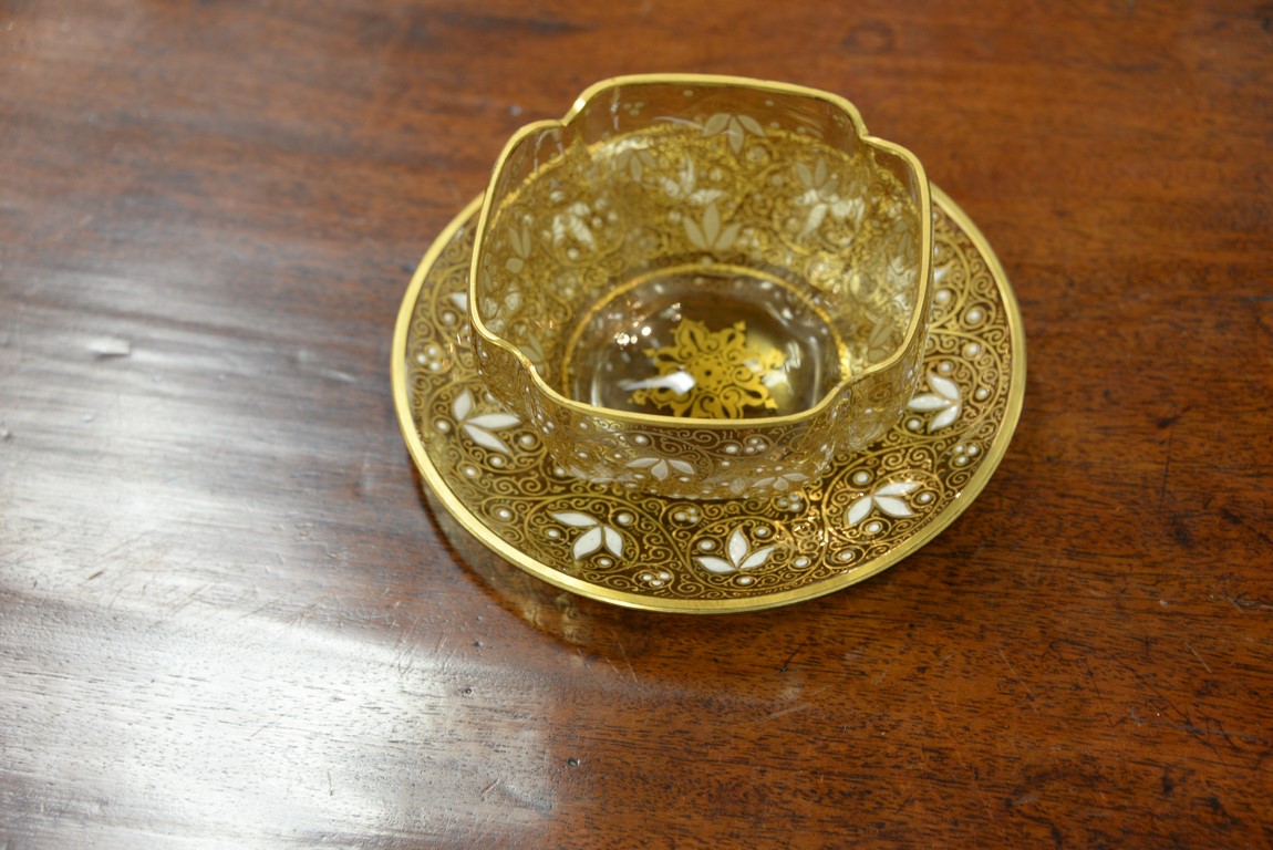 Lot 152: Set of twelve Moser shaped finger bowls and underplates with floral enameling, three red, five blue, and four gold