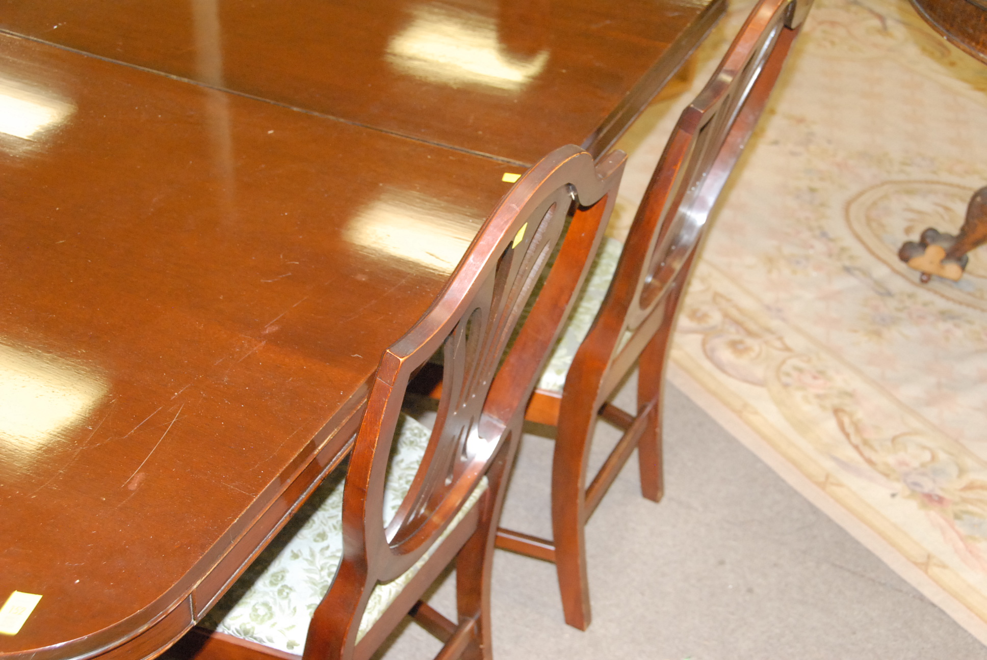 Seven piece dining set six shield back chairs and Duncan Phyfe double pedestal style tables.