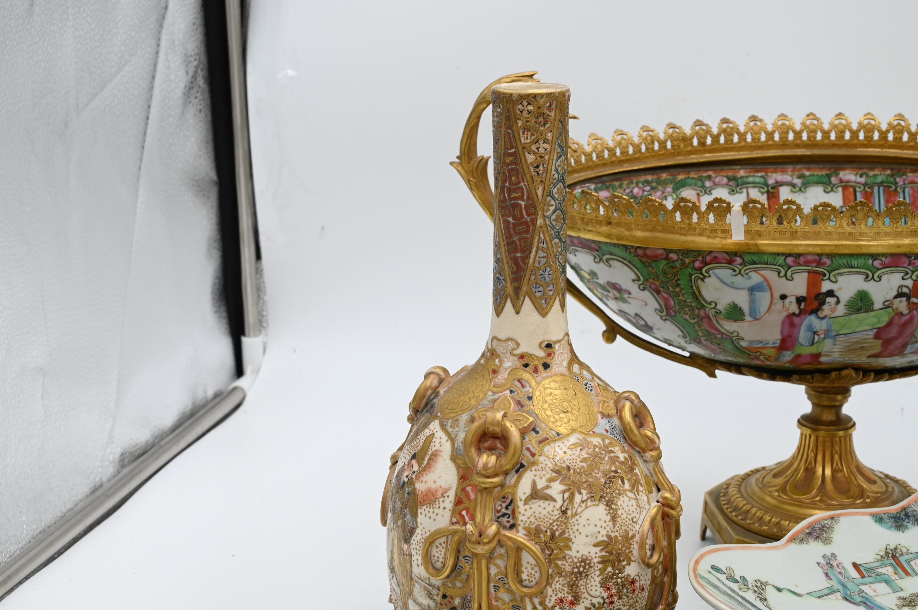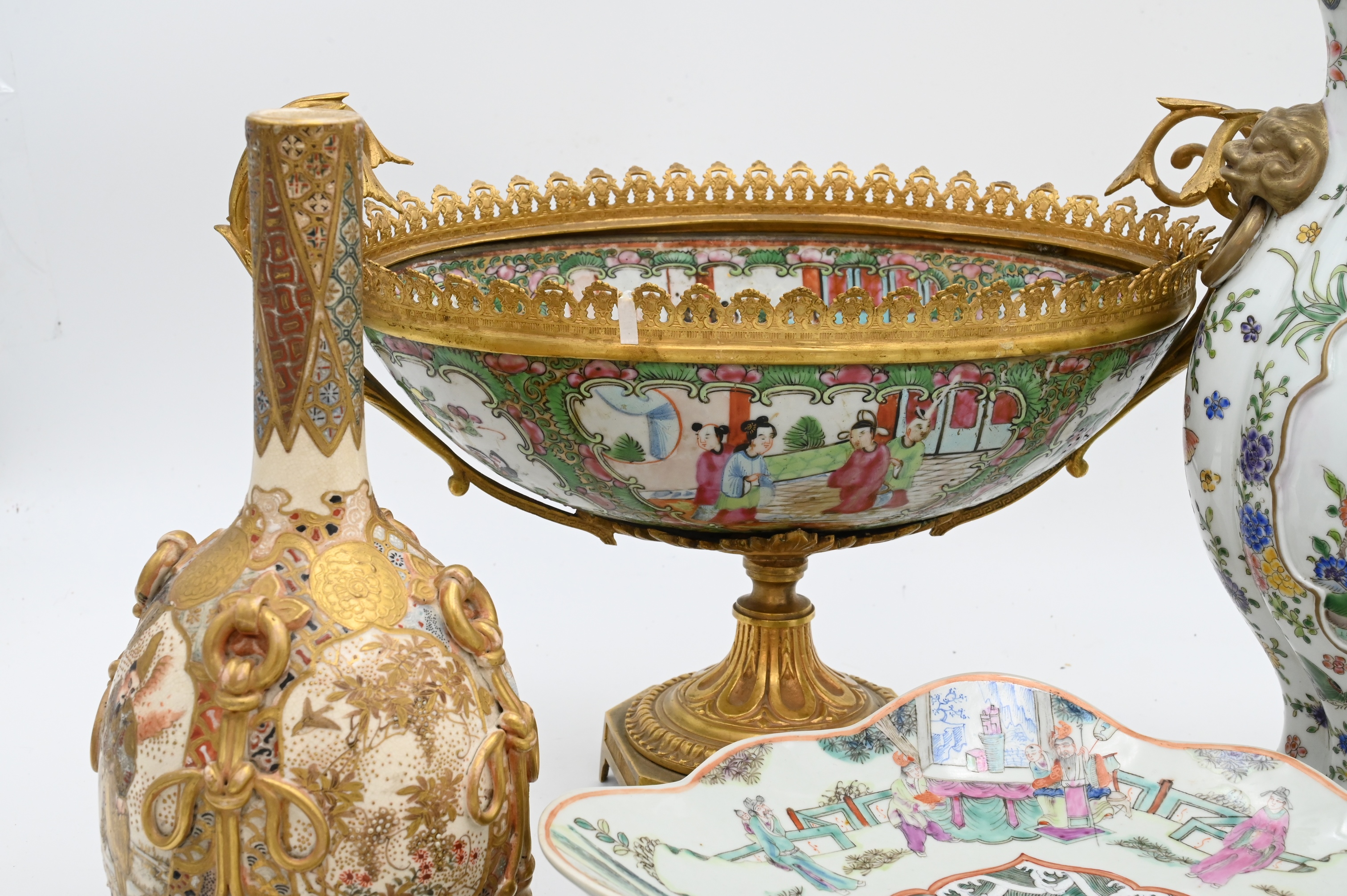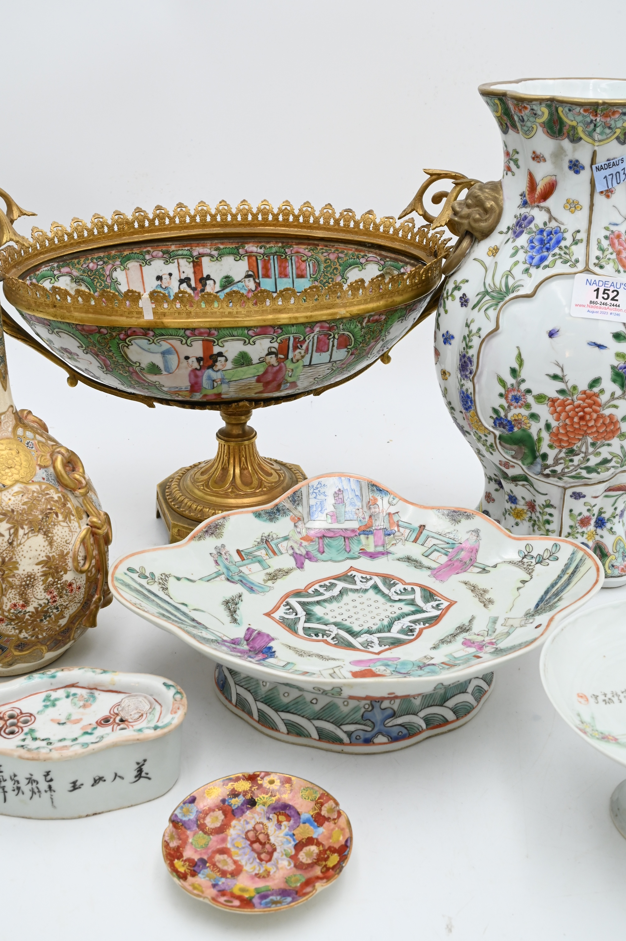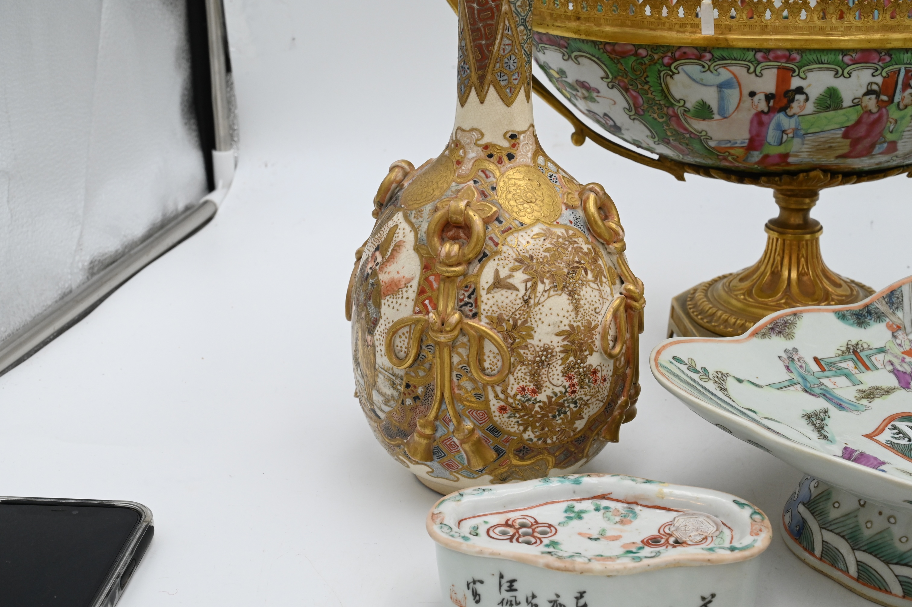 Seven Piece Rose Famille and Gilt Porcelain Lot, to include a satsuma bottle vase with painted figures, a porcelain vase having birds and flowers, gilt foo dog door knocker decor, a soap tray having geishas and flowers with red signature stamp on side, two footed dishes, one to match soap tray, both marked, along with one small dish Chinese export bronze oval centerpiece, marked, vase height 12 1/2 inches.