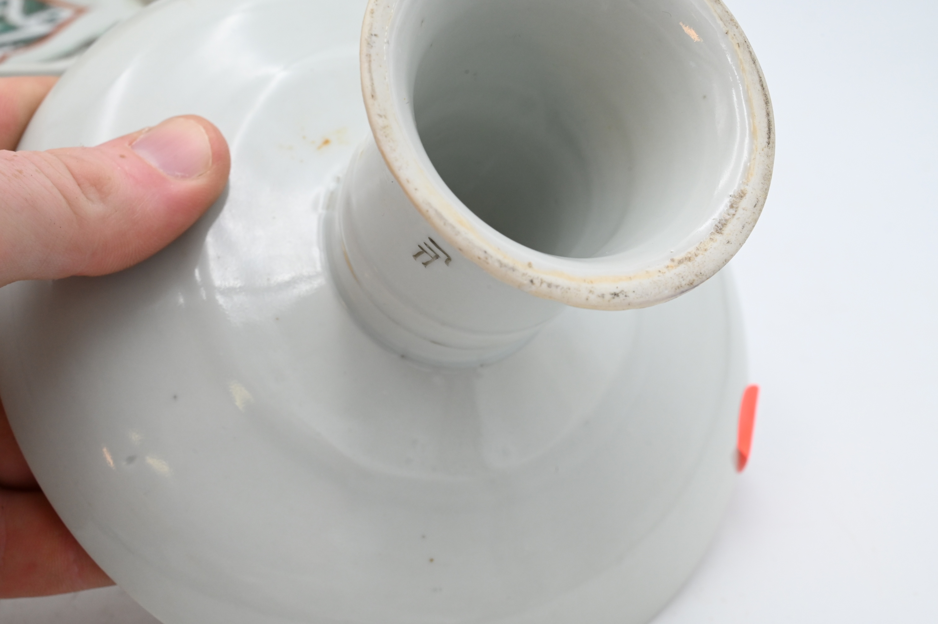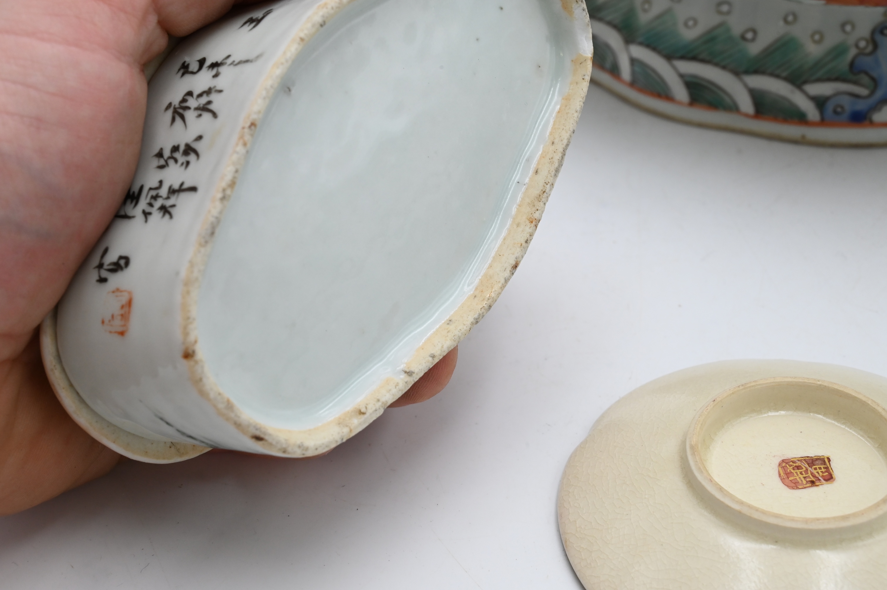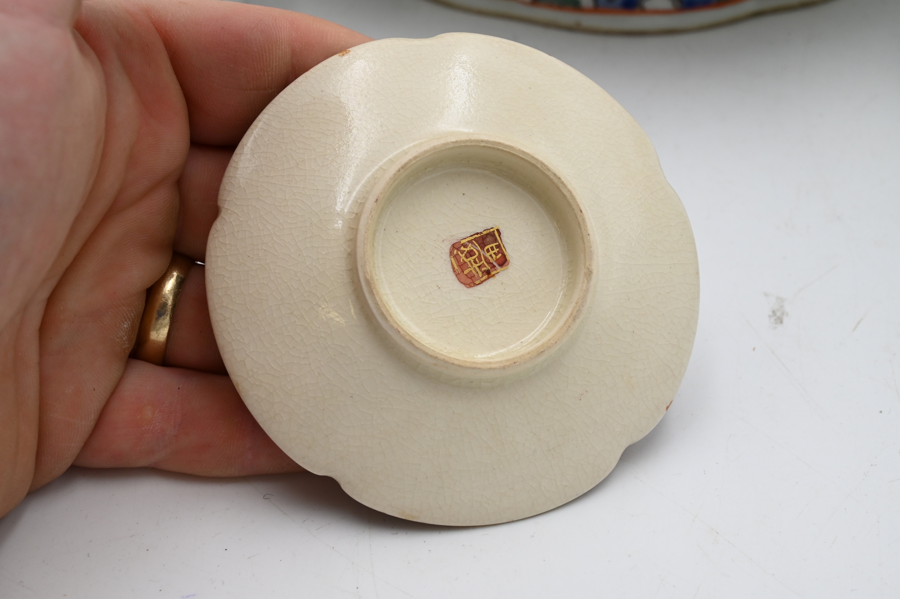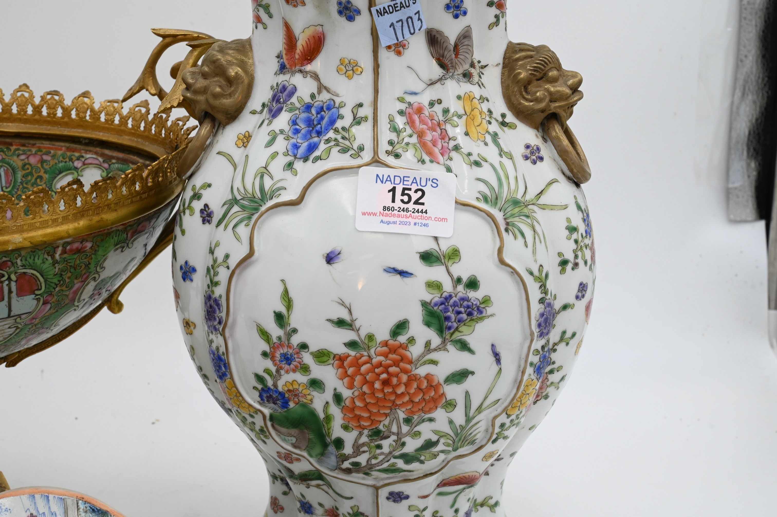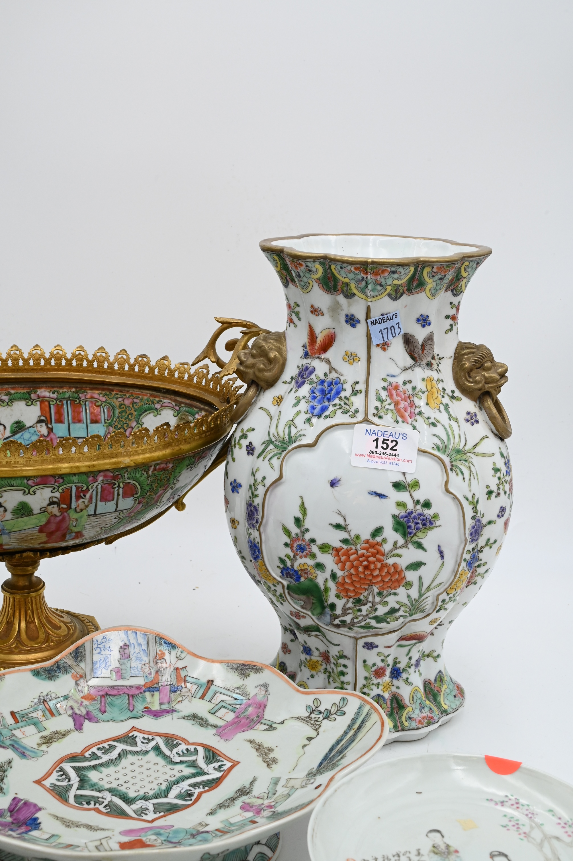 Seven Piece Rose Famille and Gilt Porcelain Lot, to include a satsuma bottle vase with painted figures, a porcelain vase having birds and flowers, gilt foo dog door knocker decor, a soap tray having geishas and flowers with red signature stamp on side, two footed dishes, one to match soap tray, both marked, along with one small dish Chinese export bronze oval centerpiece, marked, vase height 12 1/2 inches.