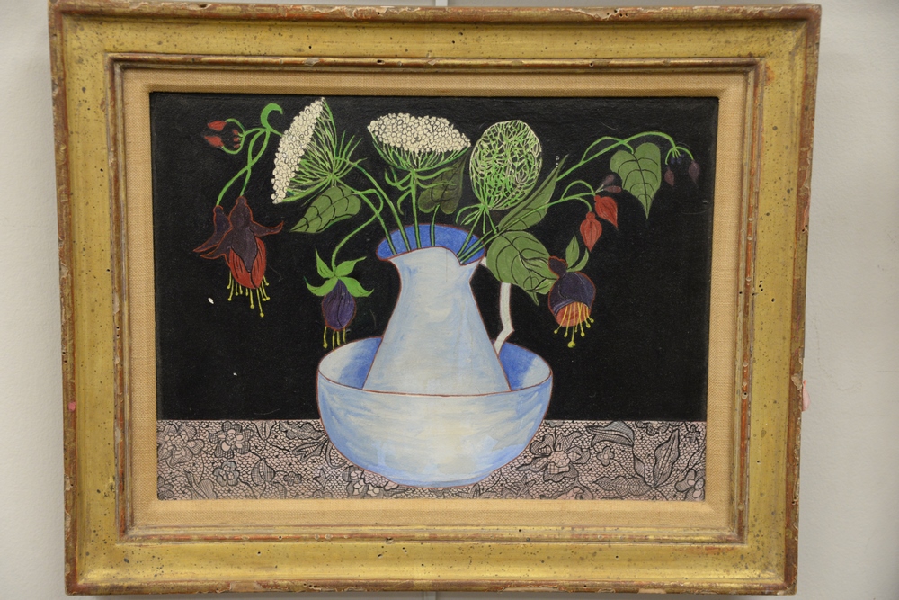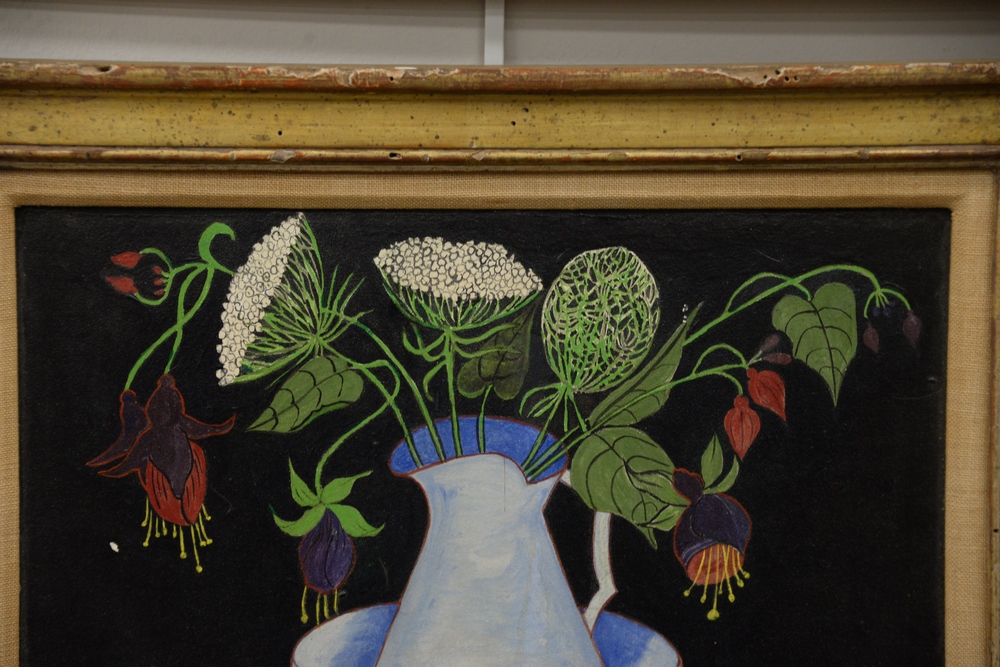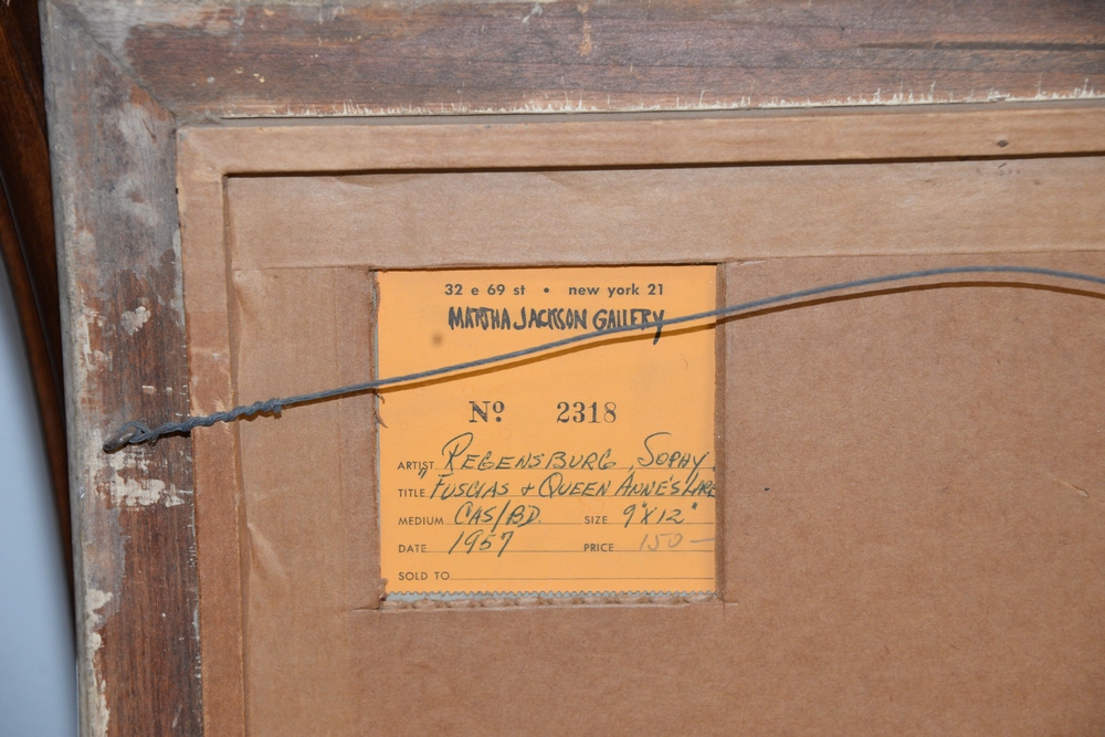 Lot 152: Sophy Regensburg (American 1885 – 1974), “Fuschias and Queen Anne’s Lace”, oil on board, 9″ x 11 1/2″, titled and dated in a Martha …