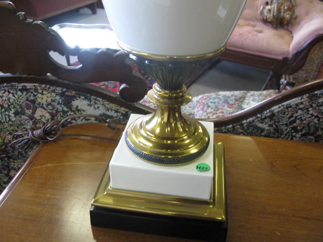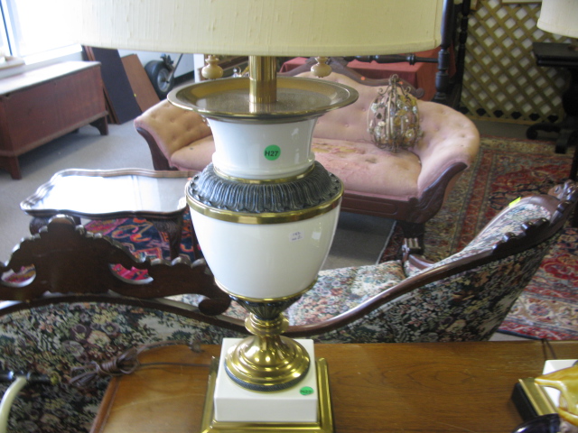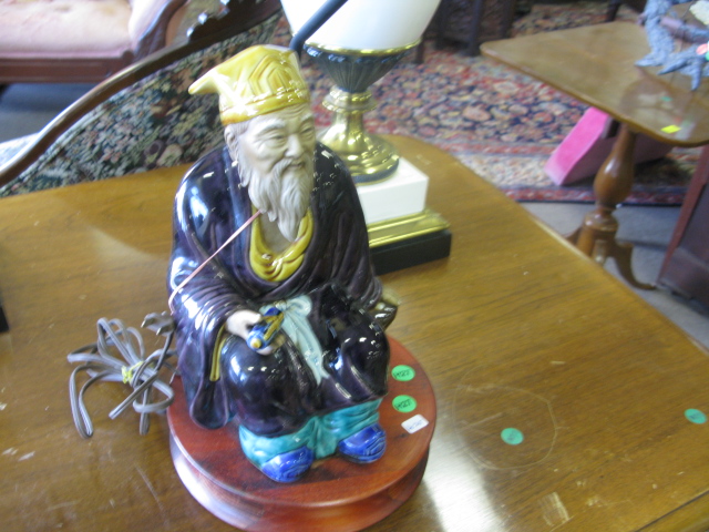Three lamps pair of urn style porcelain lamps with brass mounts and Oriental porcelain seated gentleman made into lamp.