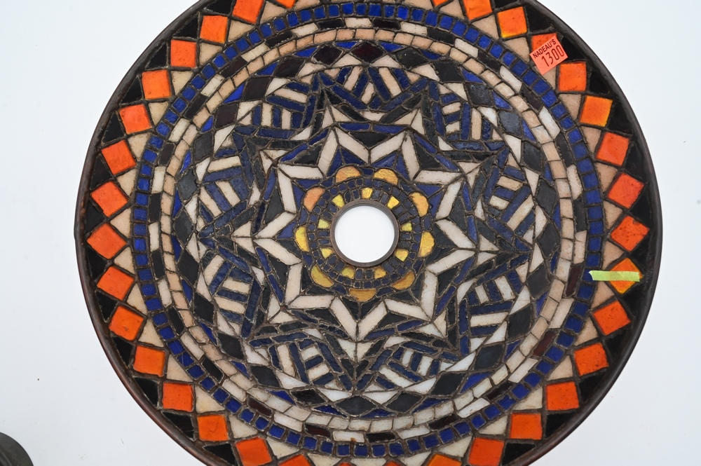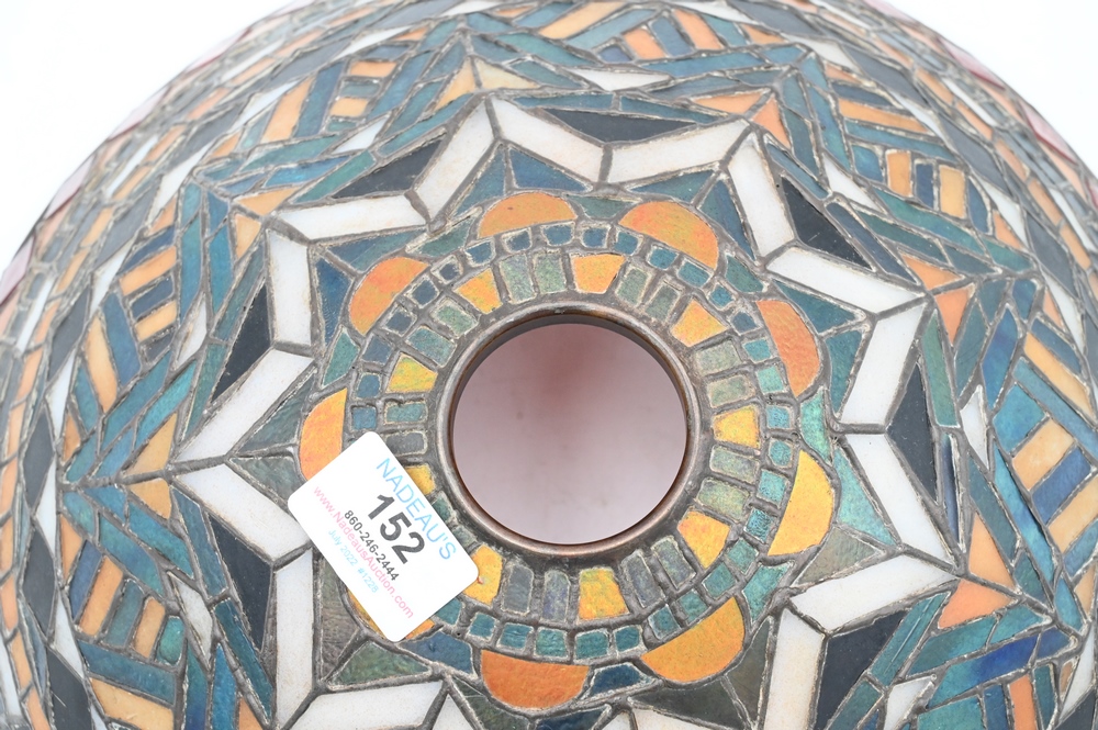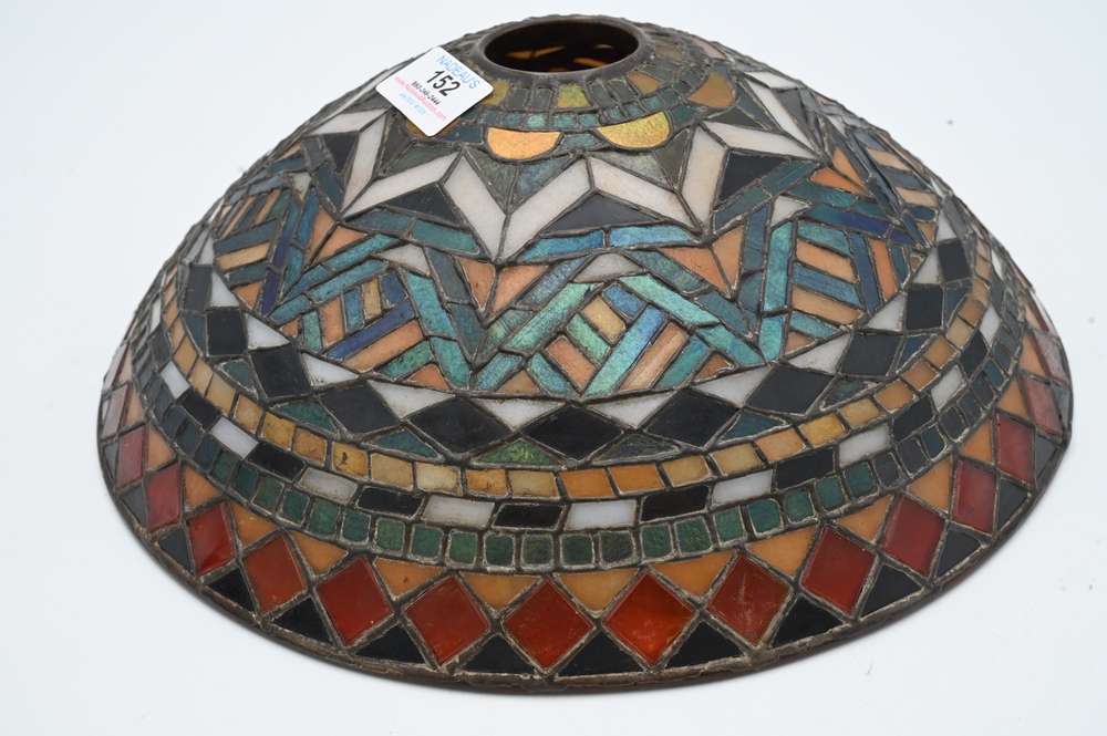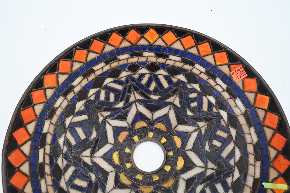 Tiffany Studio Leaded Glass Shade, geometric pattern, signed Tiffany Studios, New York, 2 inch opening at top, diameter 13 1/2 inches, shade only.