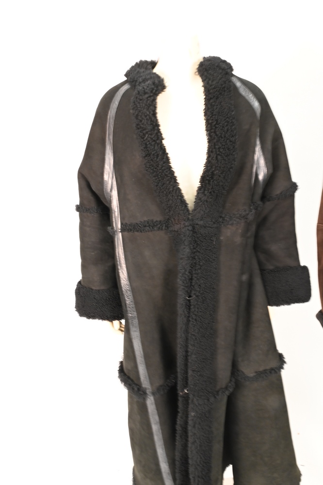 Lot 152: Two Brown and Black Suede Long Coats, to include black suede full length coat with leather trim accents and lambswool lining, along …