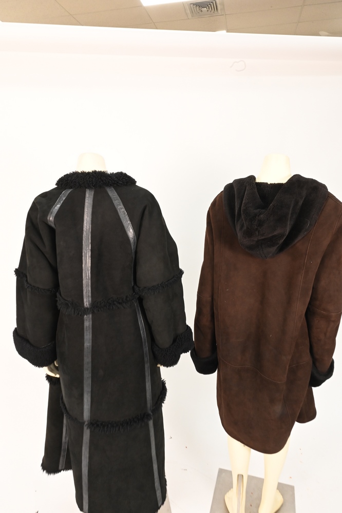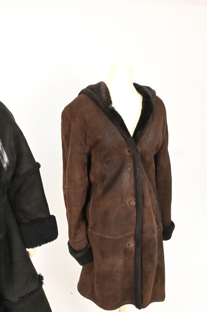 Two Brown and Black Suede Long Coats, to include black suede full length coat with leather trim accents and lambswool lining, along with brown suede coat with sheared lining and hood, both in good condition having normal wear, size Large and X-Large.