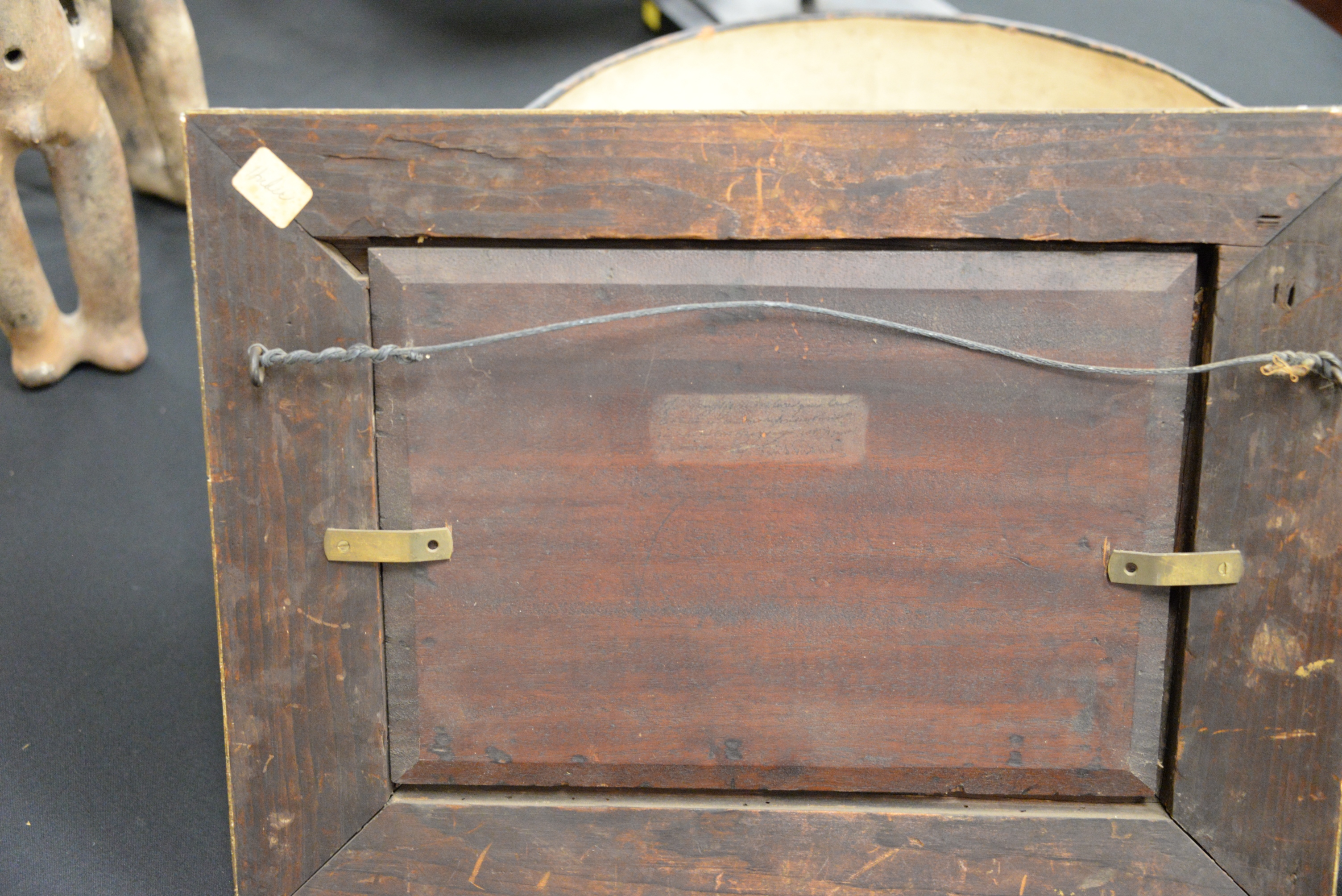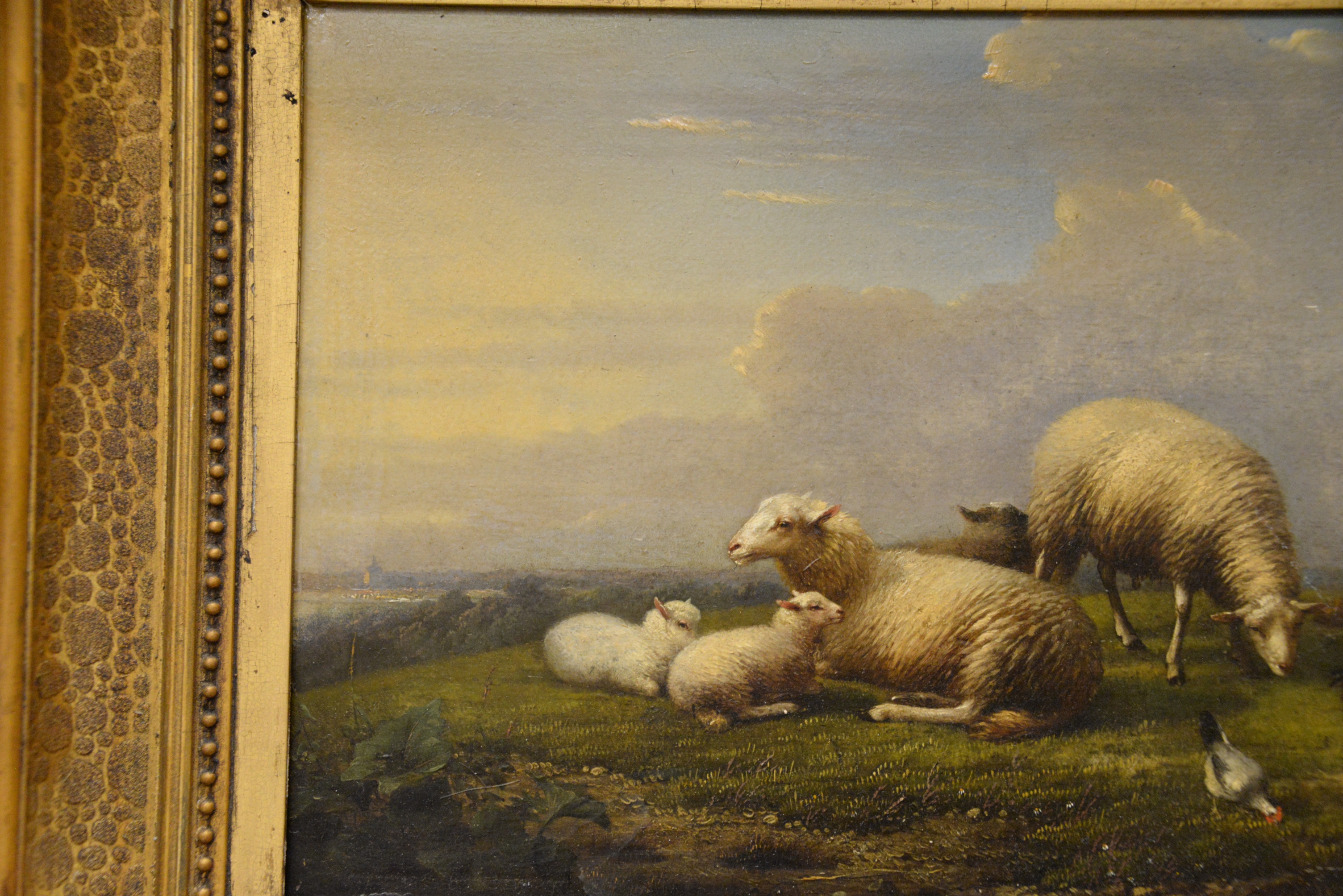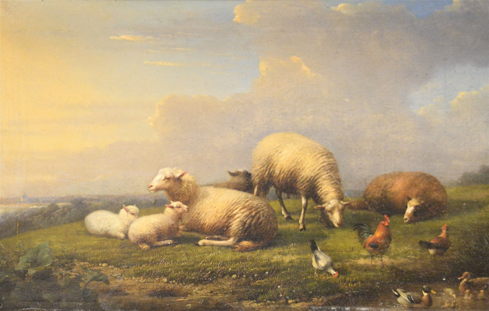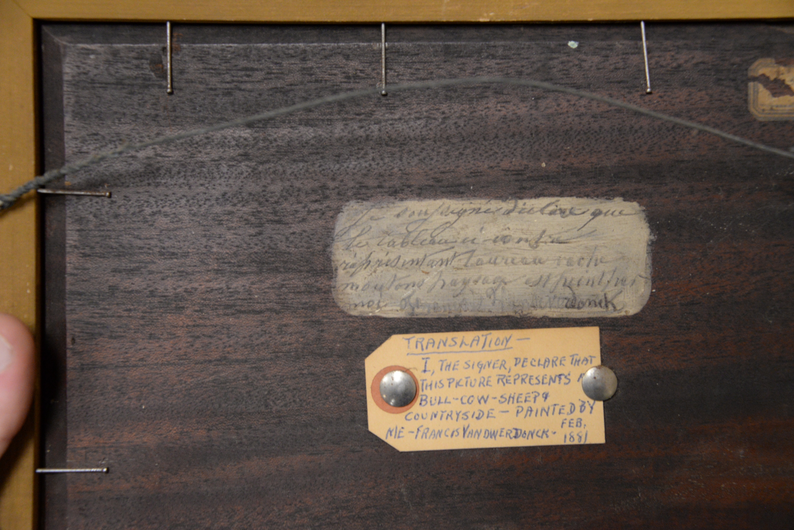 signed lower right with “I, the signer declares that this picture represents a bull, cow, sheep and countryside – painted by Mr. Francois Vanderdonck, Feb. 1881″ with inscription by artist on reverse